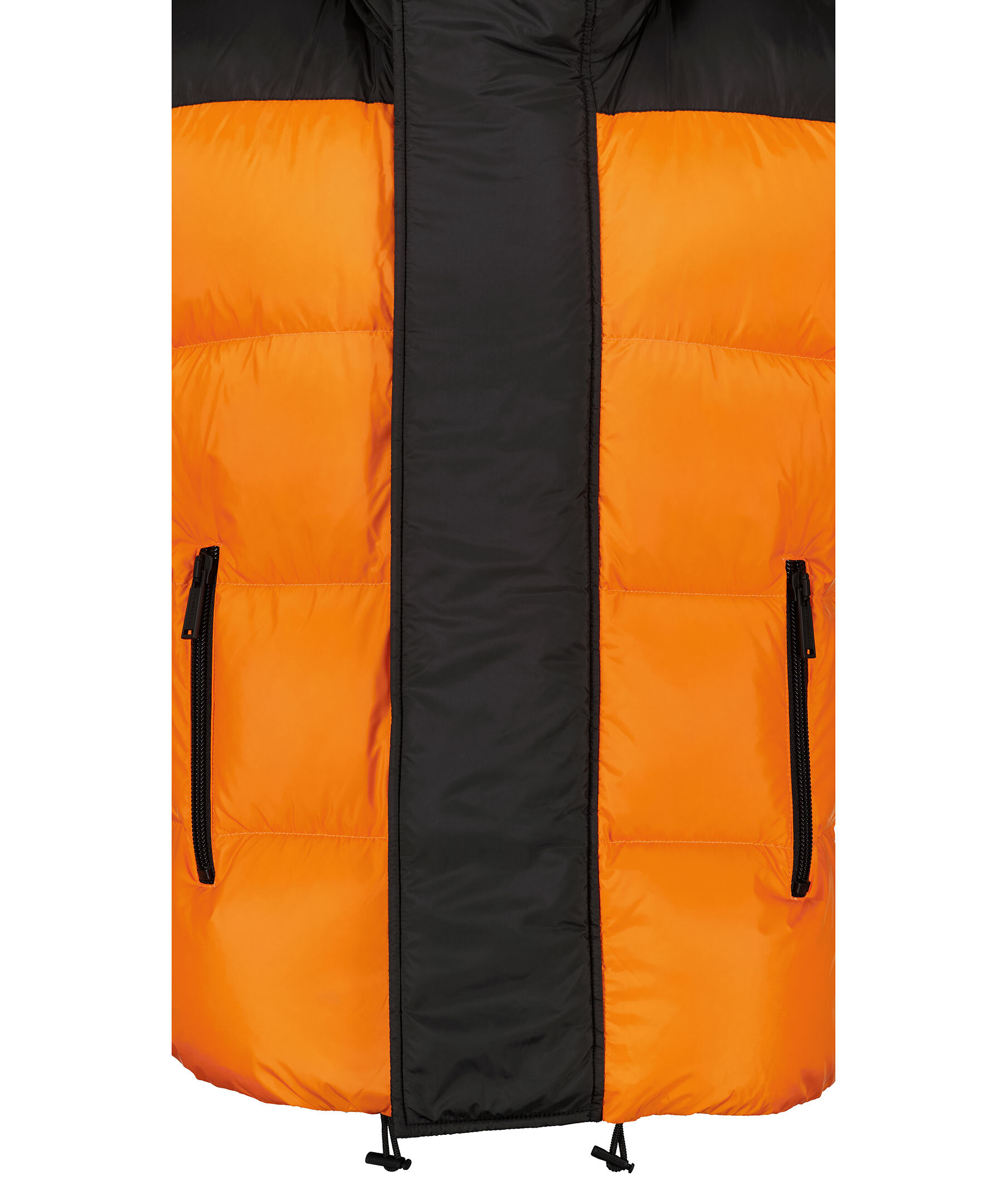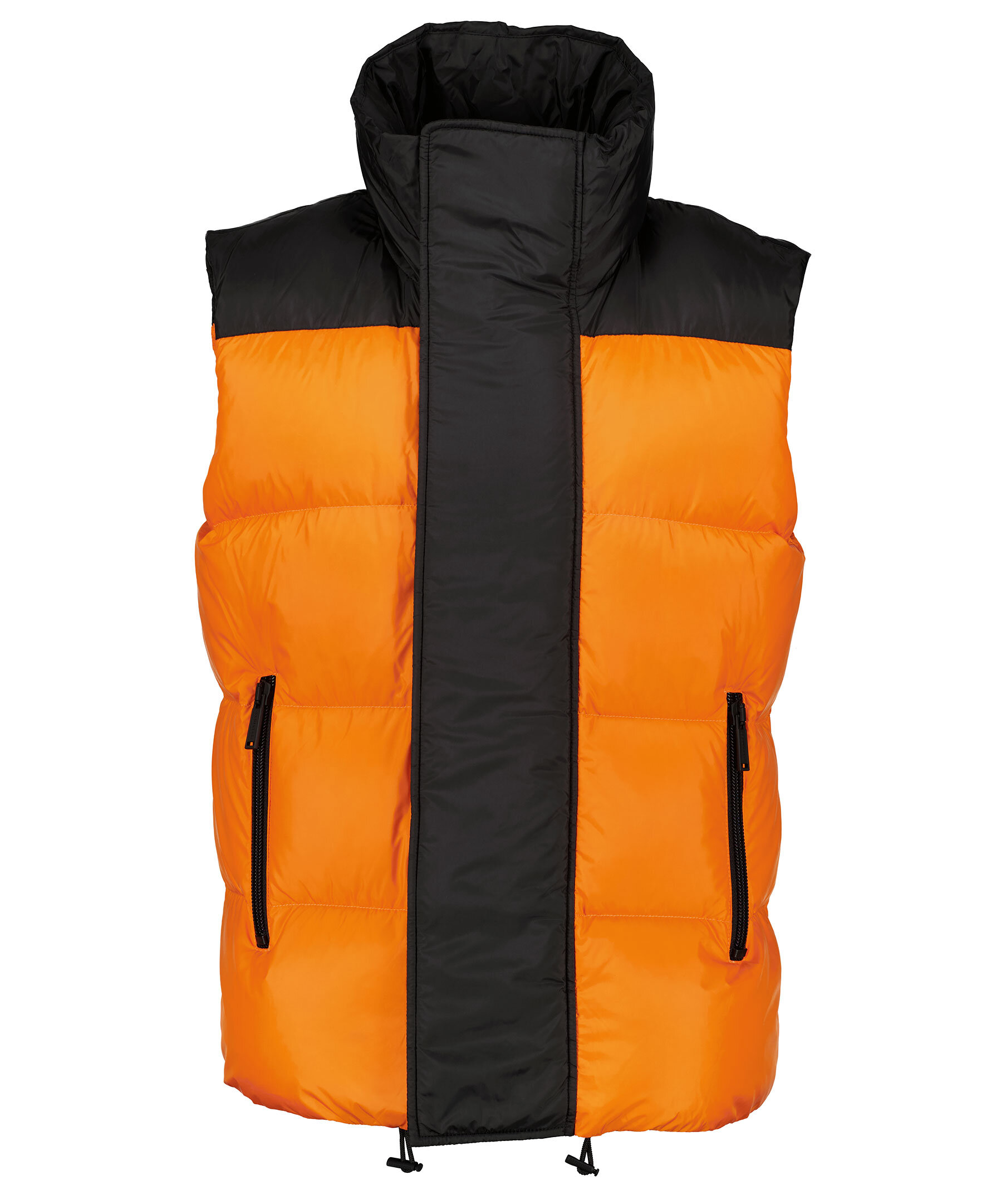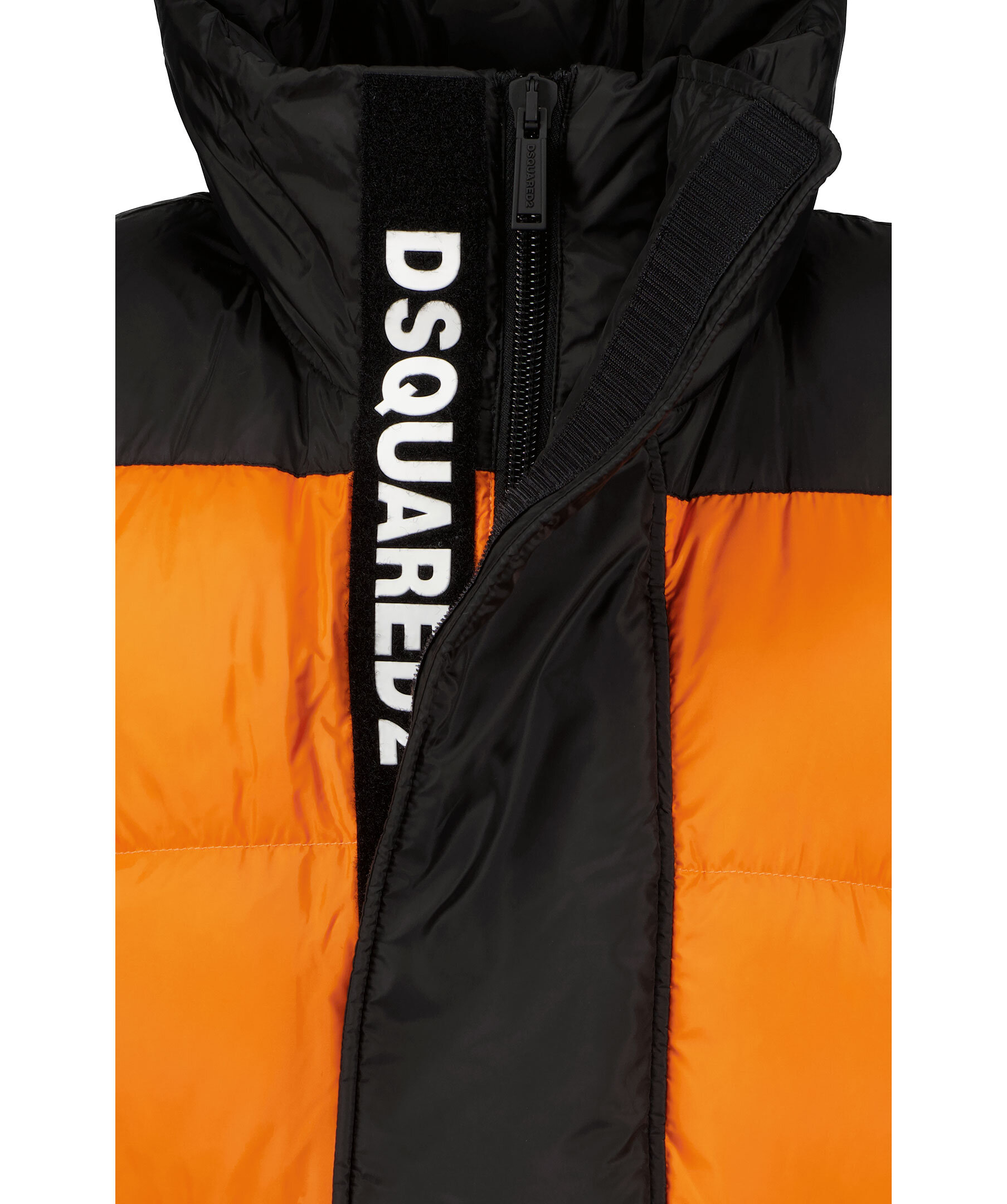 Orange dunväst från Dsquared2. Stängs framtill med kardborre och tvåvägsdragkedja. Två fickor framtill som stångs med dragkedja. Svarta paneler över axlarna och över dragkedjan. Dragsko vid plaggslut.
