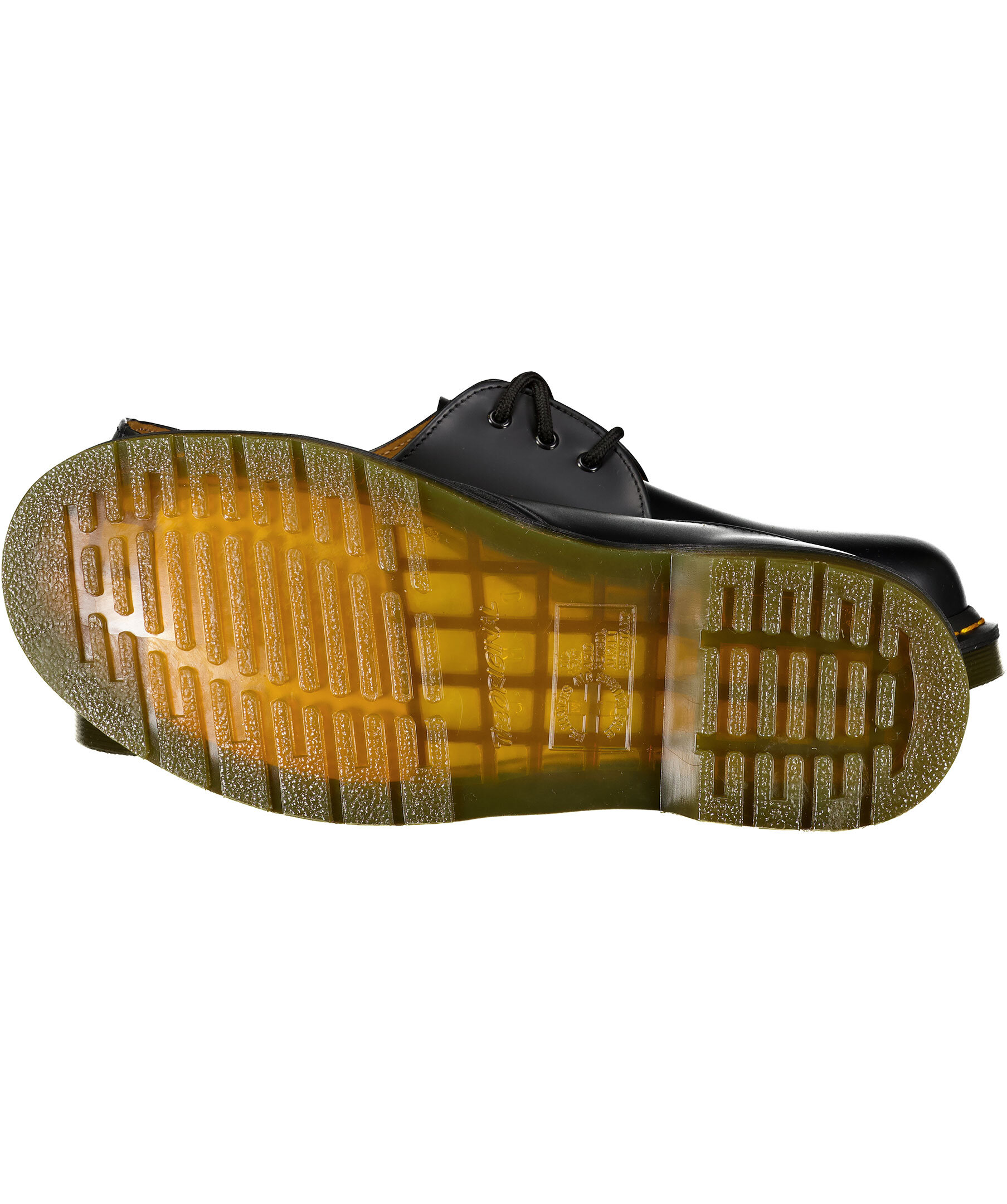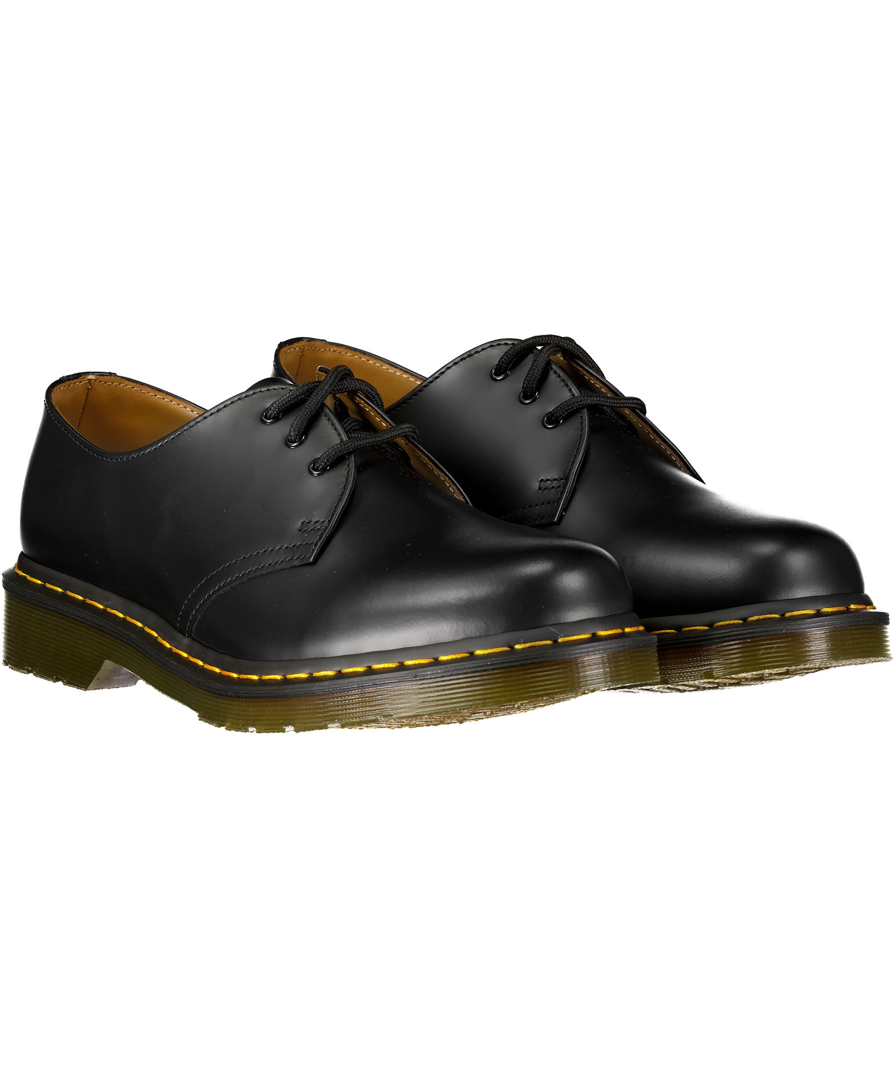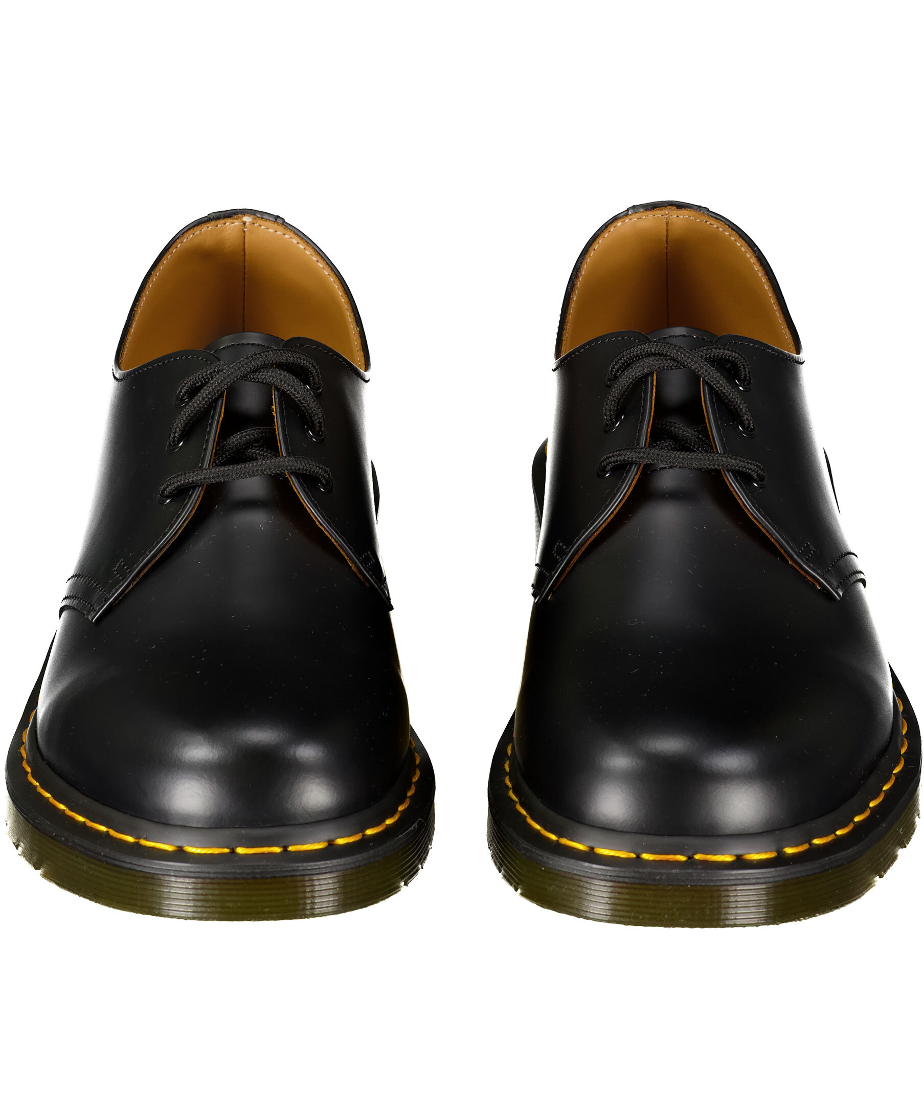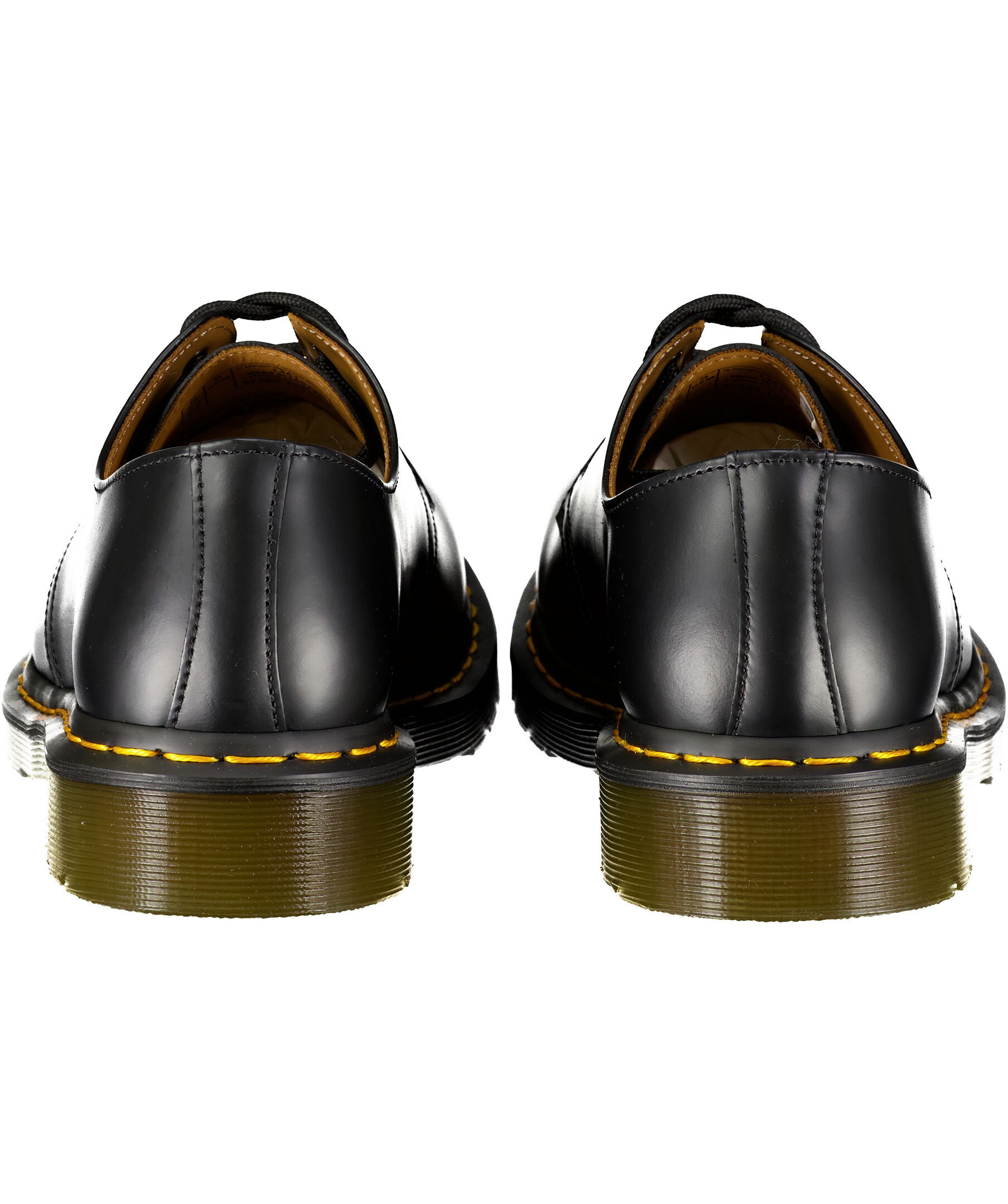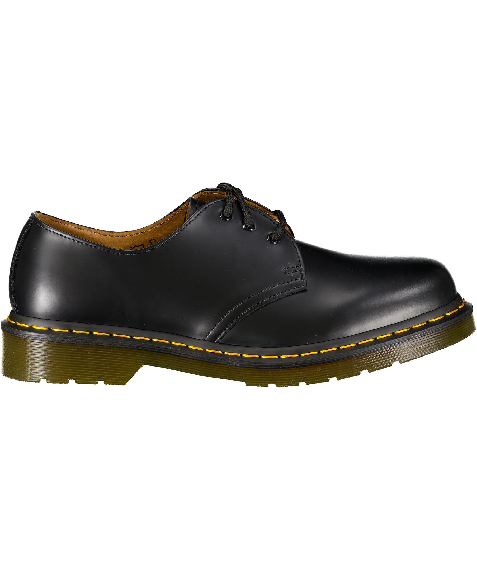 Svarta läderskor från Dr. Martens. Tillverkade i mattsvart läder, yttersula i gummi. 3-hålssnörning, ikonisk gul söm runt sulan.