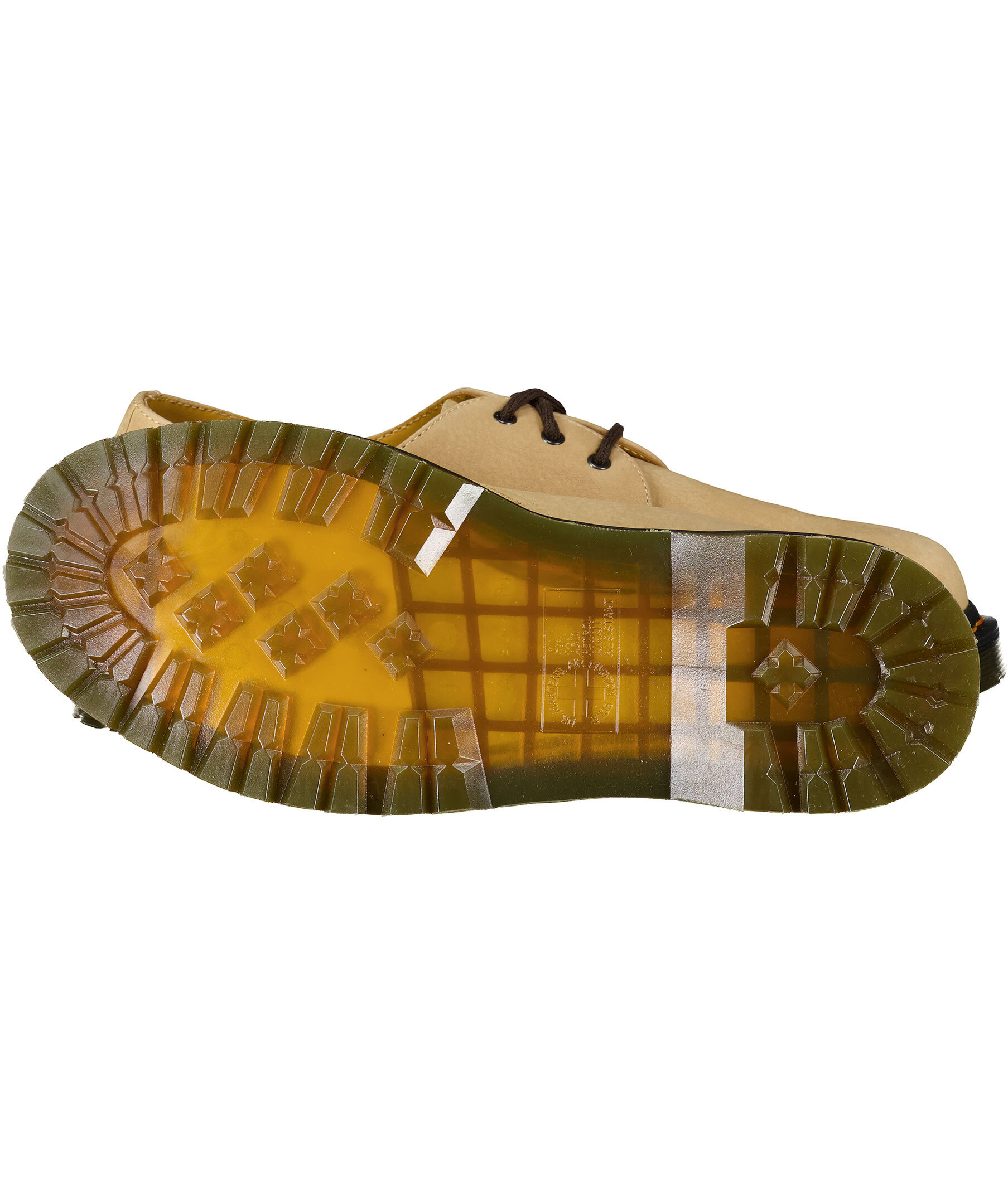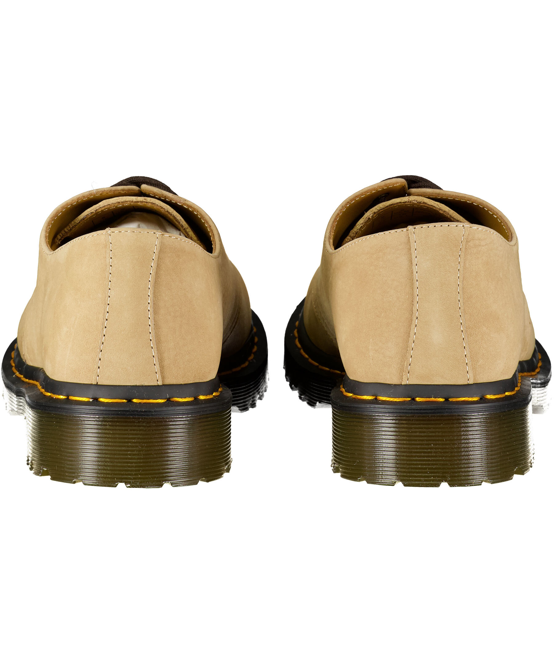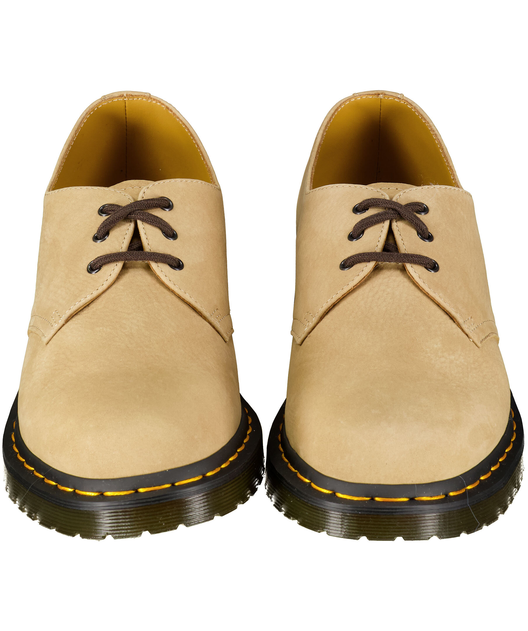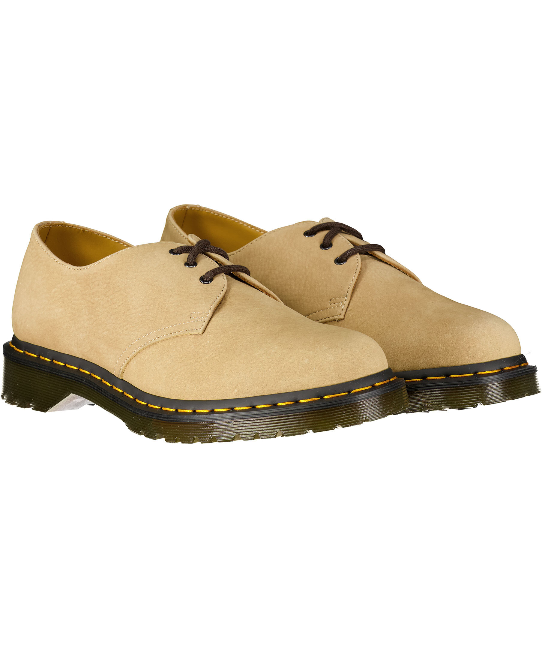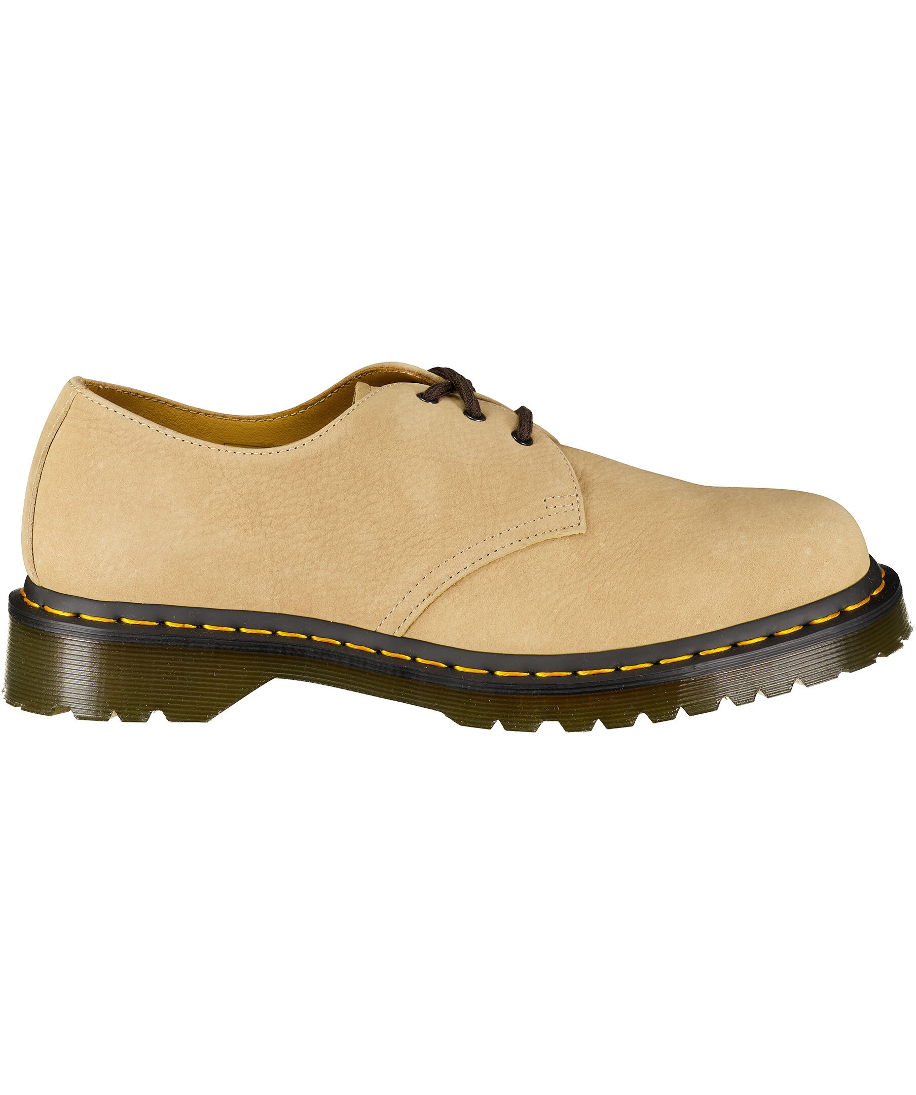 Beiga nubuck-skor från Dr. Martens. Tillverkade i läder, yttersula i gummi. 3-hålssnörning, ikonisk gul söm runt sulan.