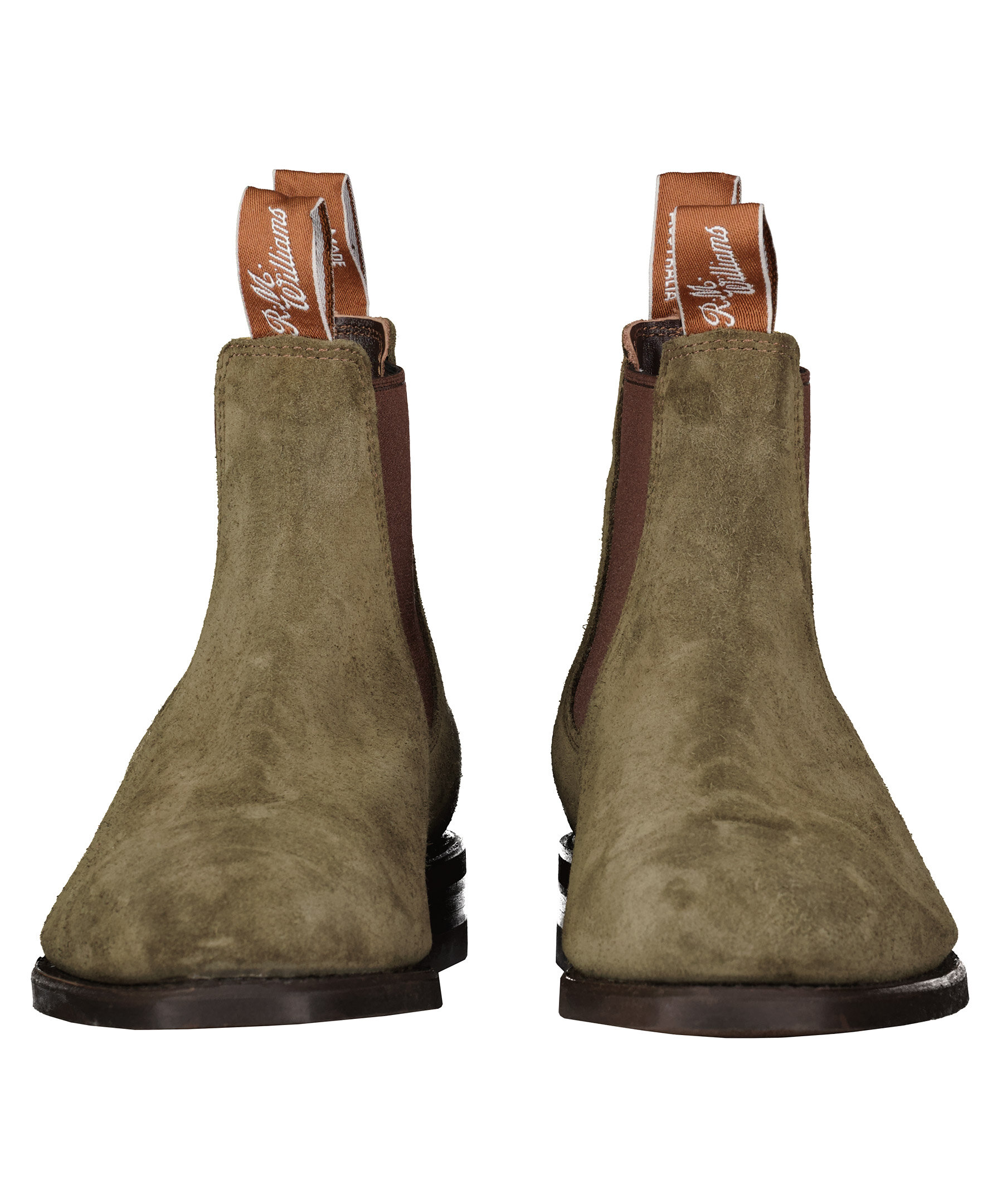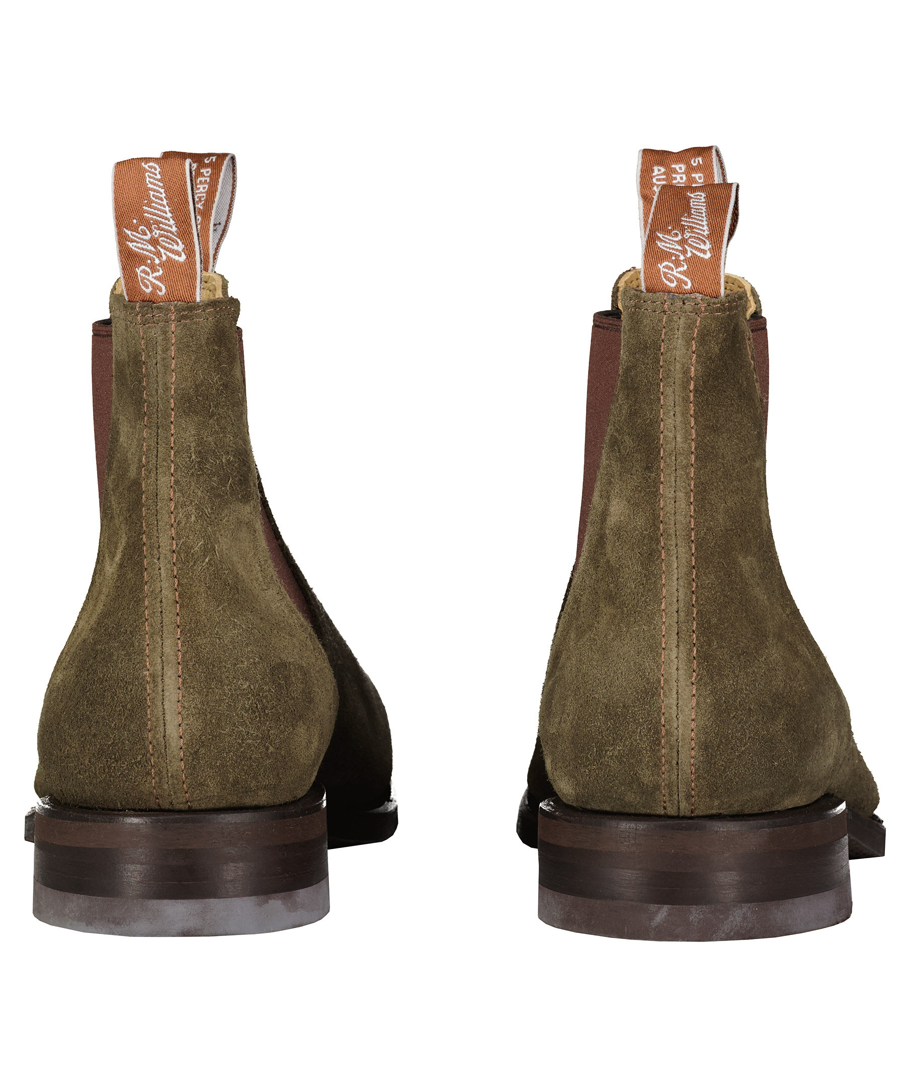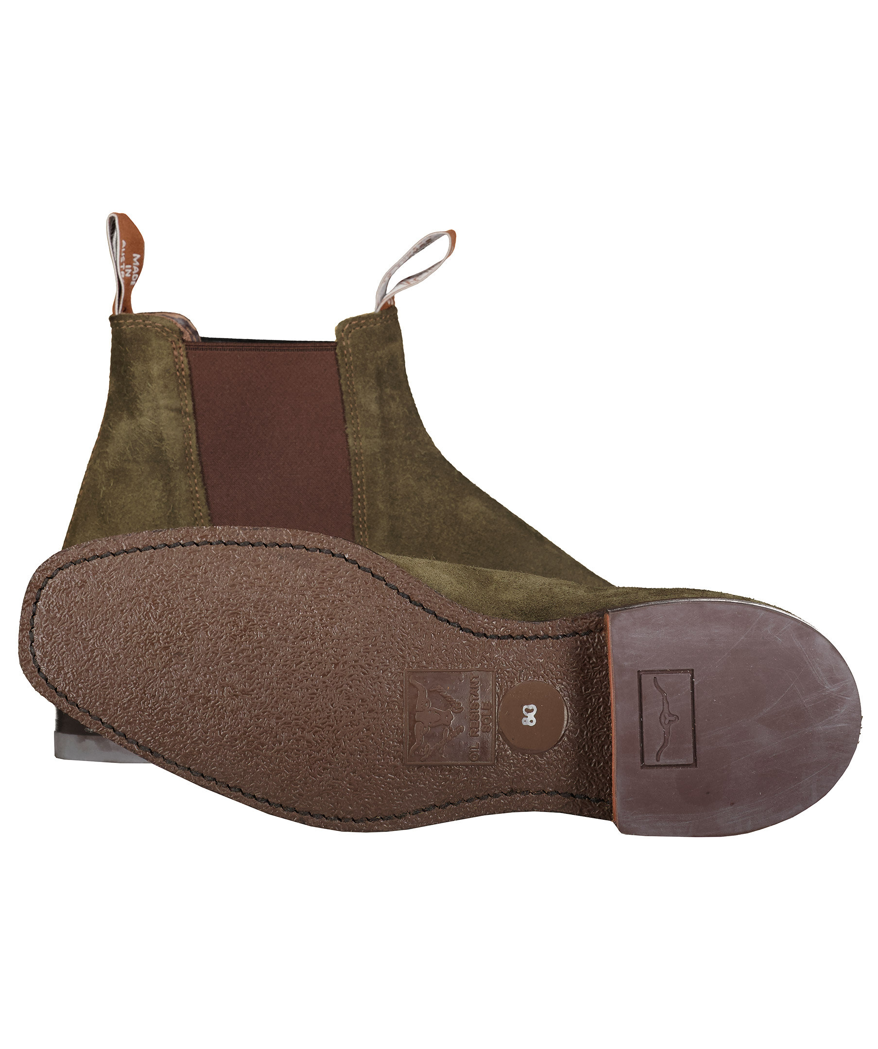 Handgjorda Chelsea boots från australienska R.M.Williams med skogsgrön mocka som ovandel, innersula i läder och randsydd yttersula i gummi.