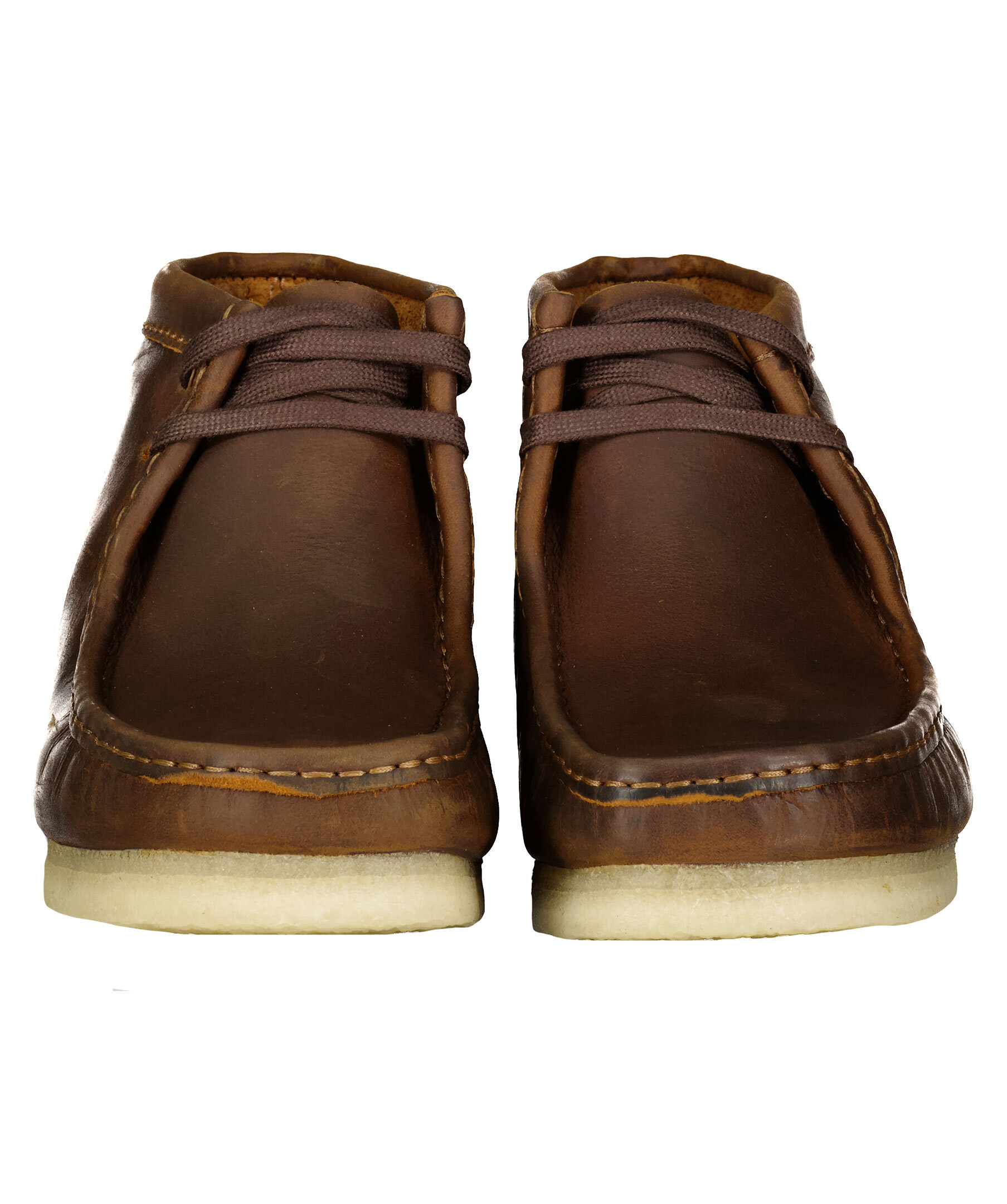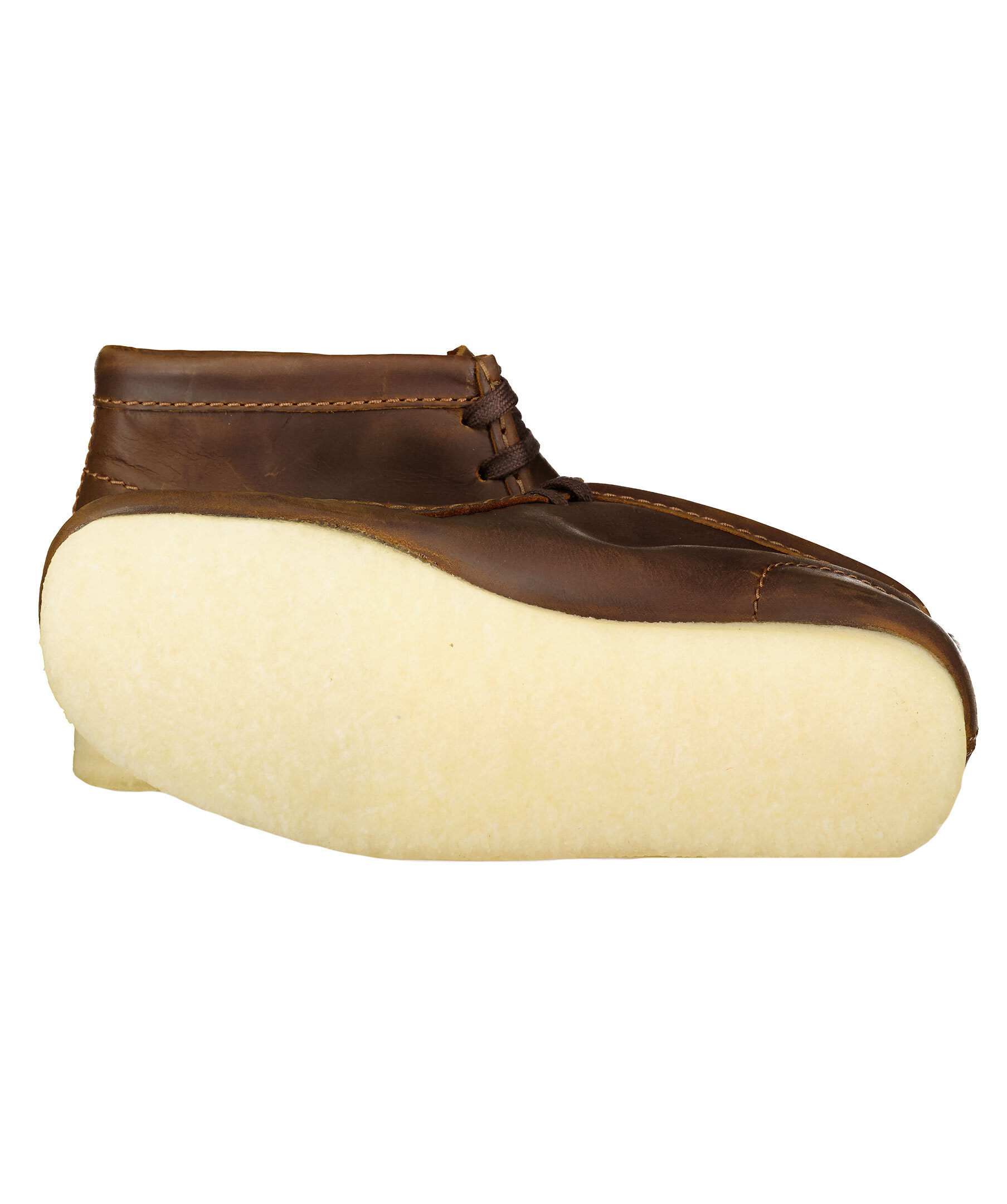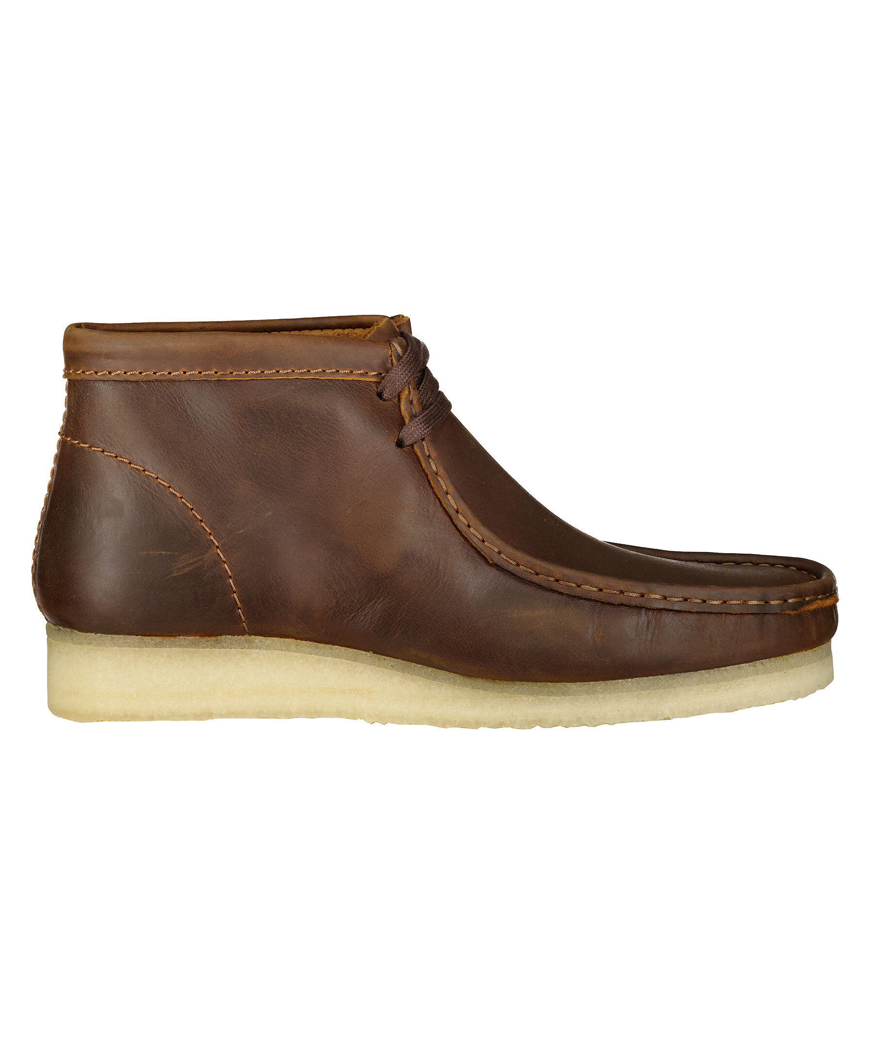 Bruna läderboots i Clarks klassiska Wallabee-modell. Skorna har enkla och rena linjer och en tjockare, ljust beige crepe-sula. Skorna har tvåhålssnörning med brunt skosnöre, senapsgult skosnöre medföljer också.