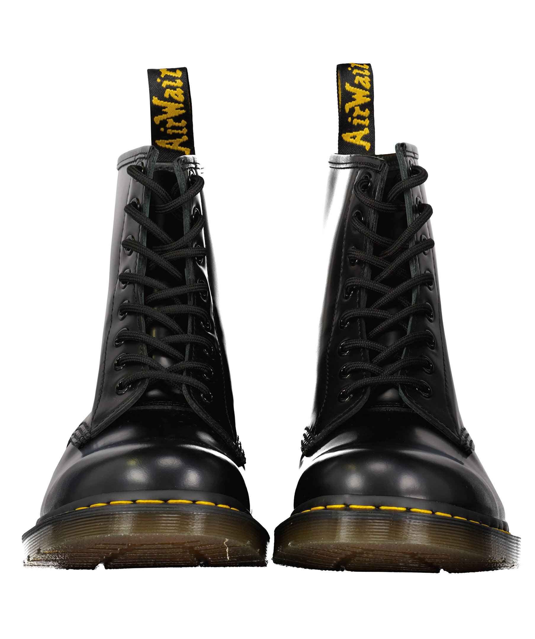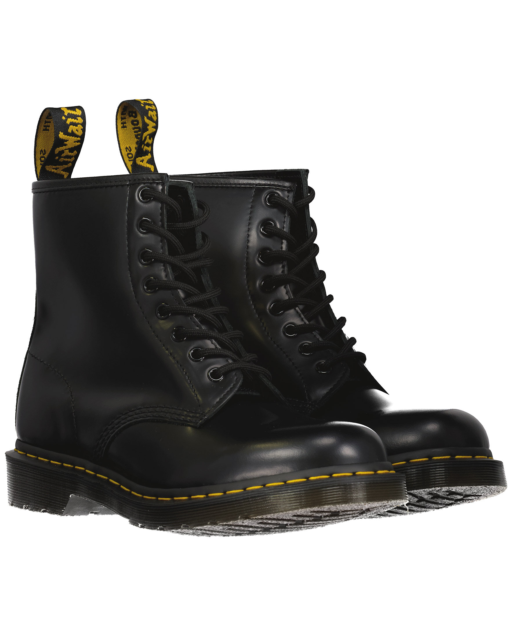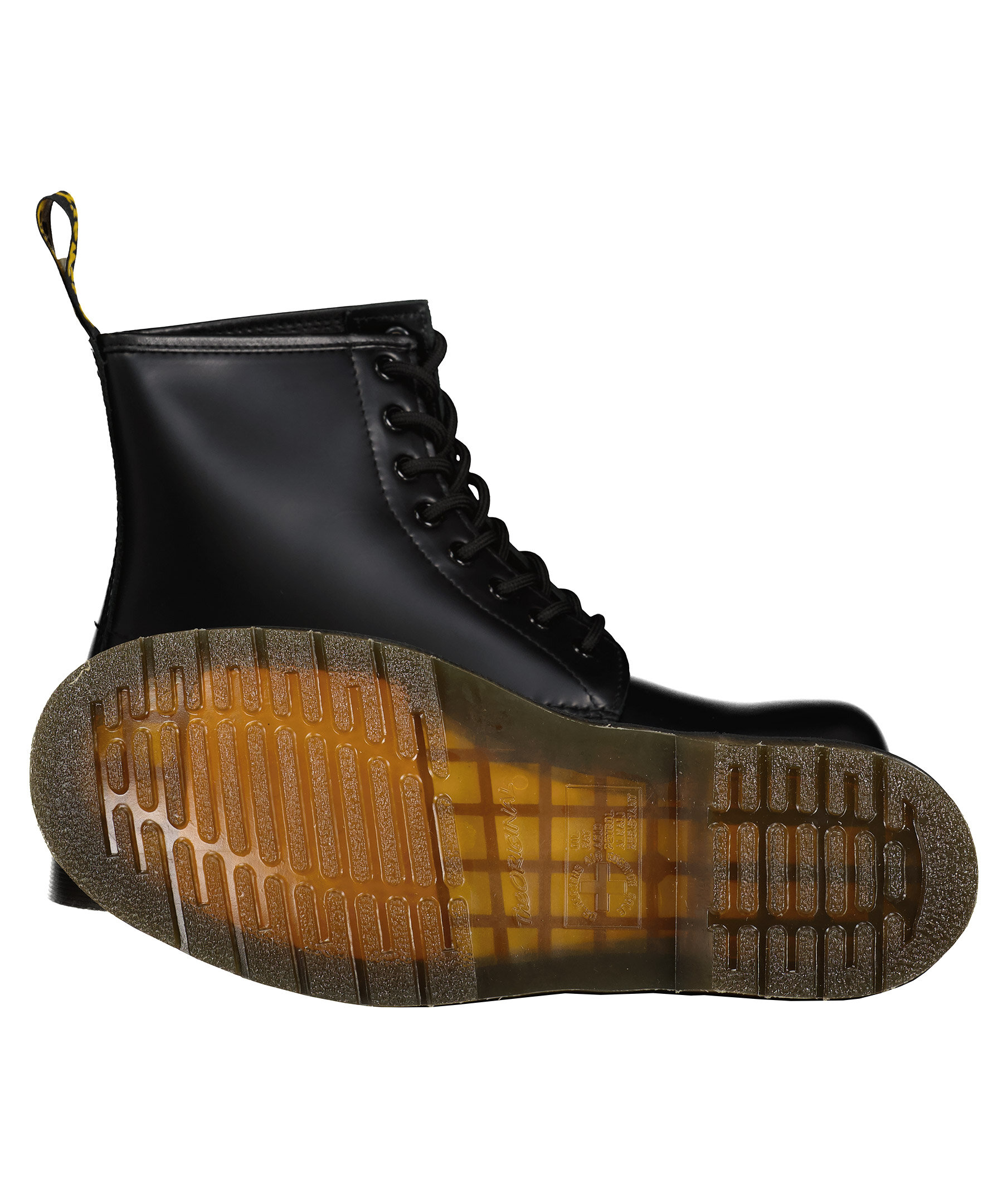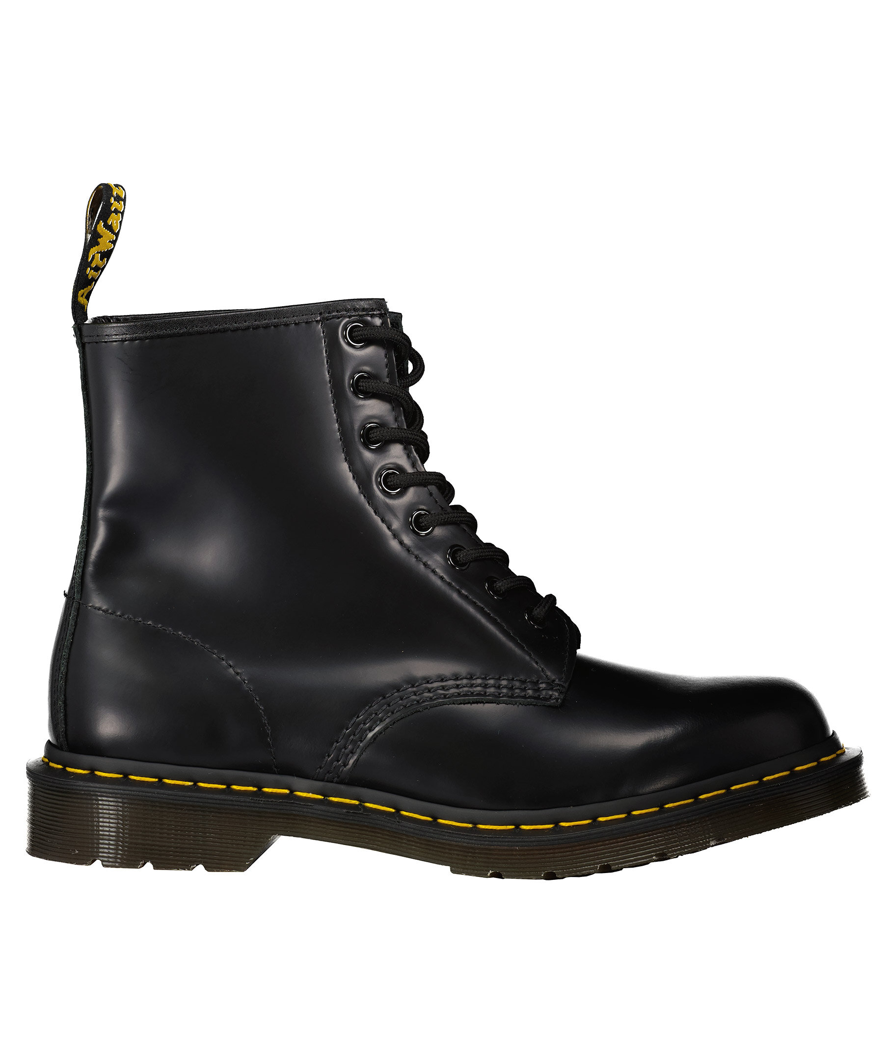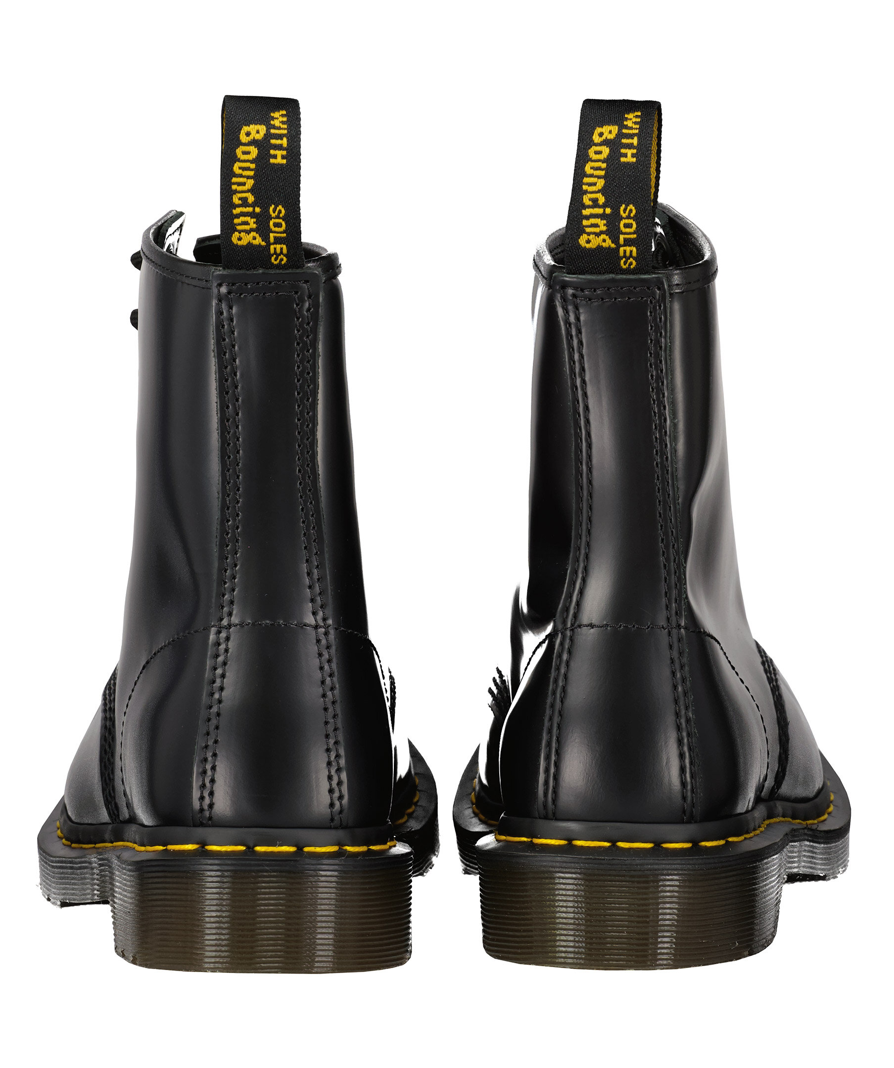 Svarta klassiska kängor från Dr. Martens. Snörning framtill, ikonisk häl-ögla, tillverkade i läder med gummisula. Unisex-modell.