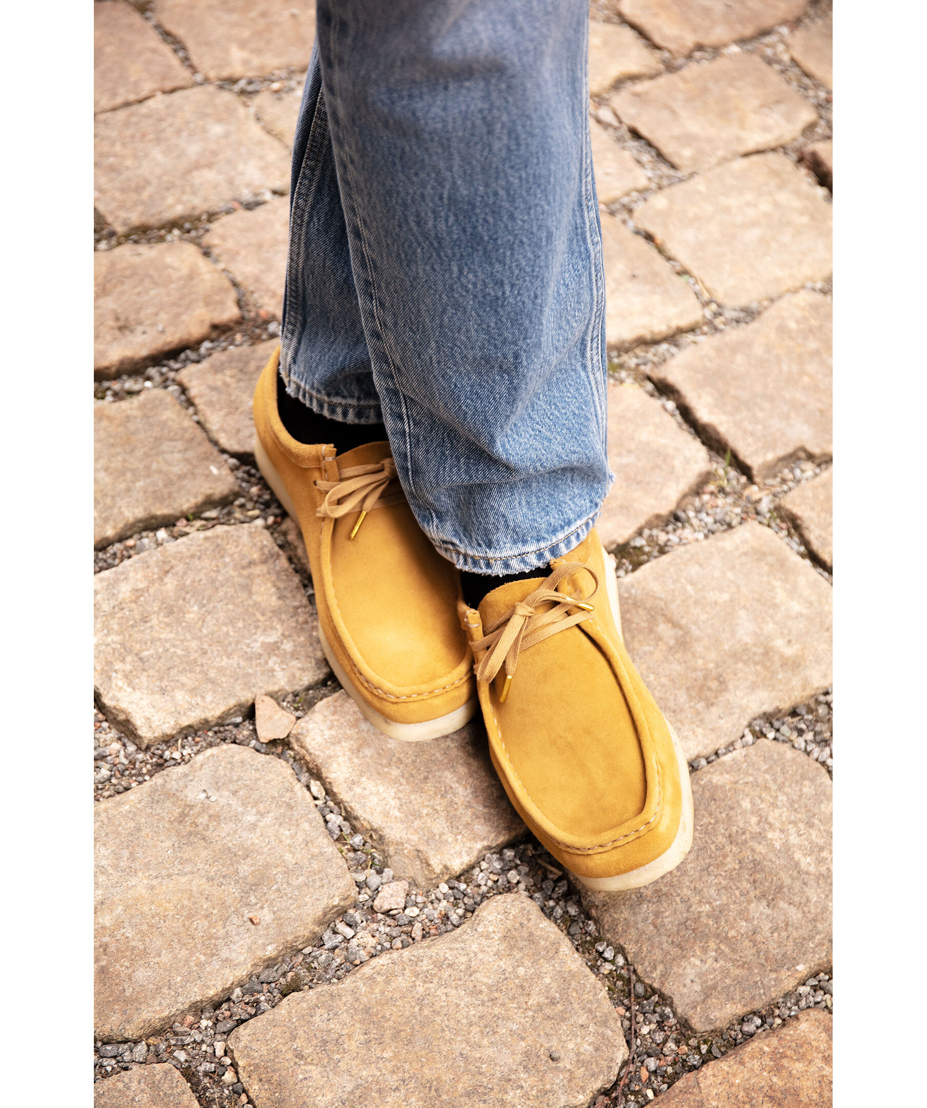 Bruna mockaboots i Clarks klassiska Wallabee-modell. Skorna har enkla och rena linjer och en tjockare, ljust beige crepe-sula. Skorna har tvåhålssnörning med brunt skosnöre.