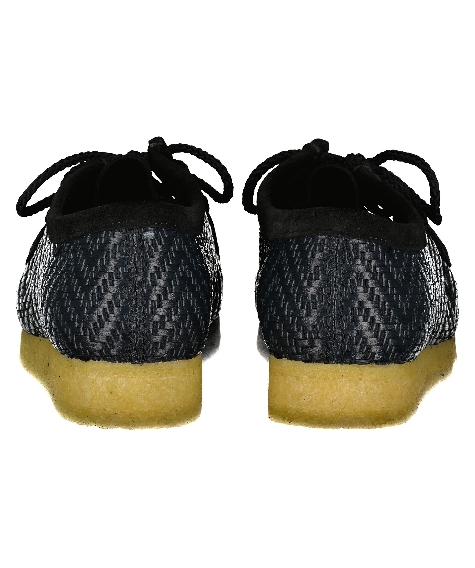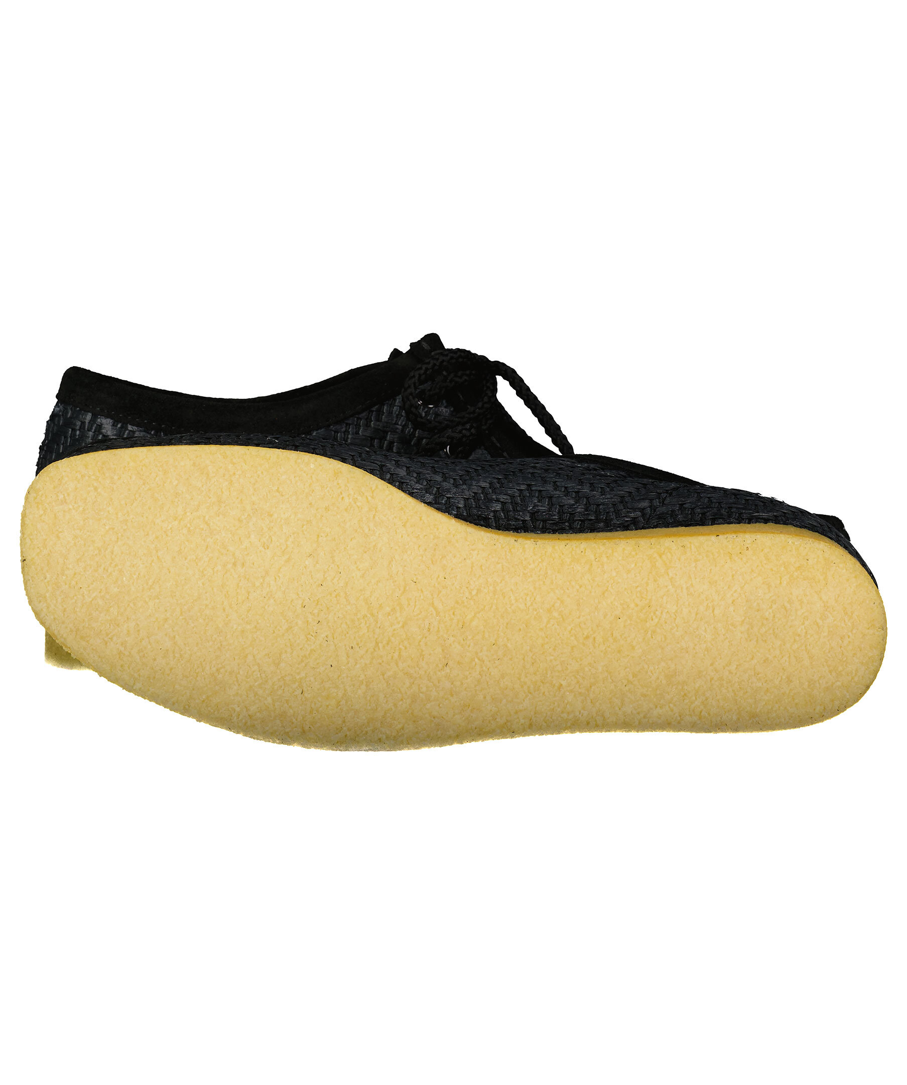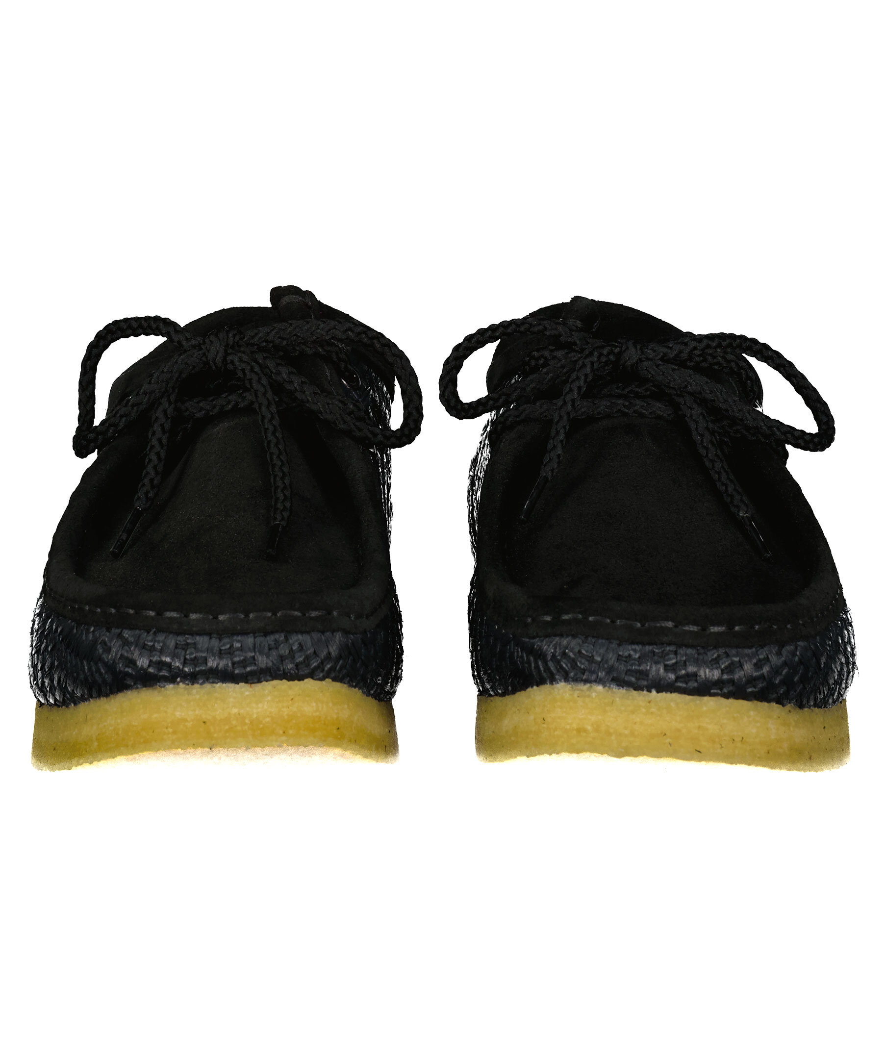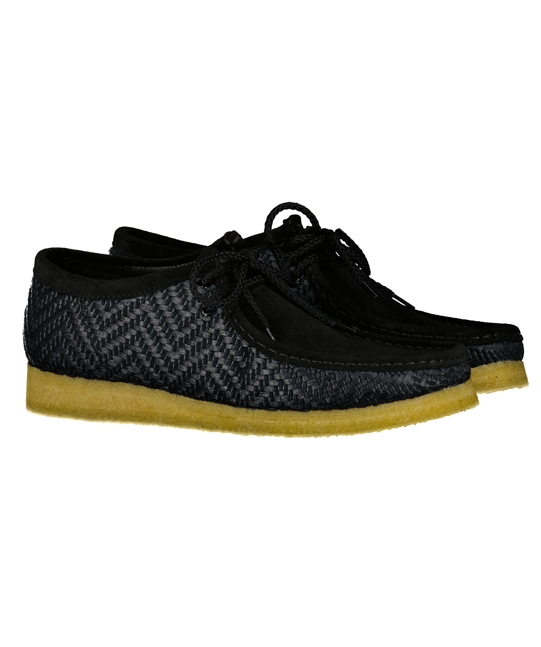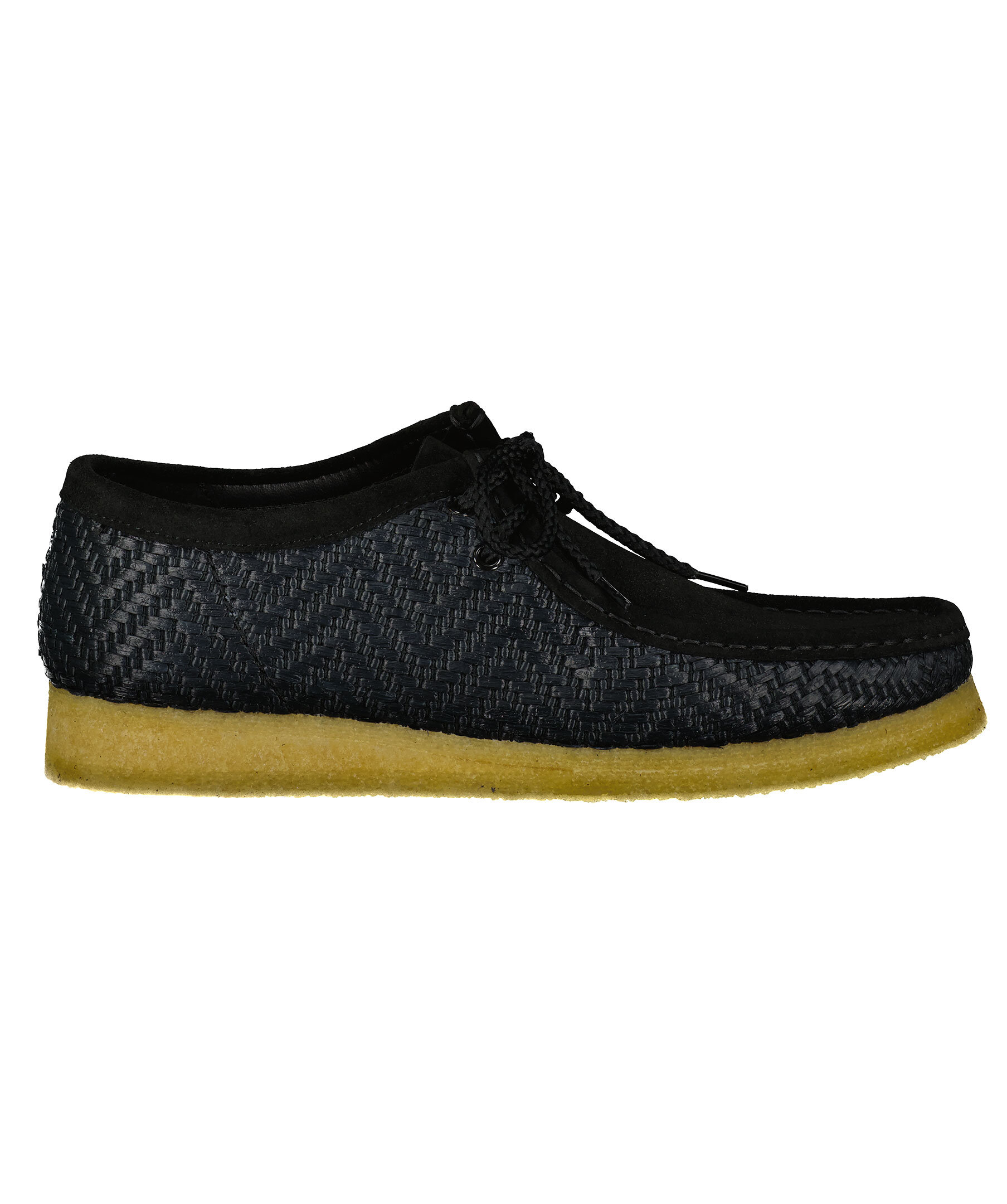 Svarta mockaboots med flätat mönster på sidorna från Clarks. Clarks klassiska Wallabee-modell. Skorna har enkla och rena linjer och en tjockare, ljust beige crepe-sula. Skorna har tvåhålssnörning med svart, lite grövre skosnöre.