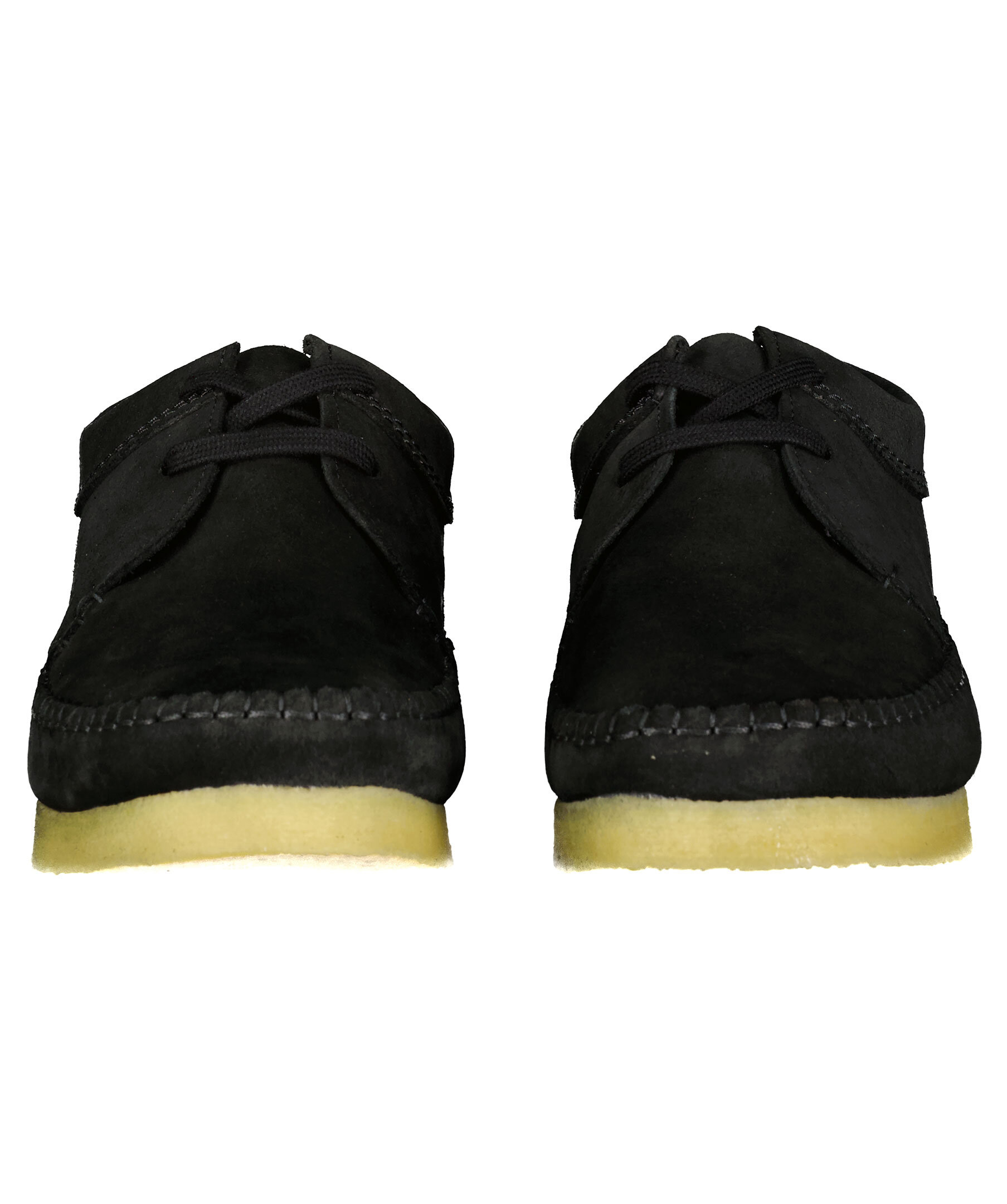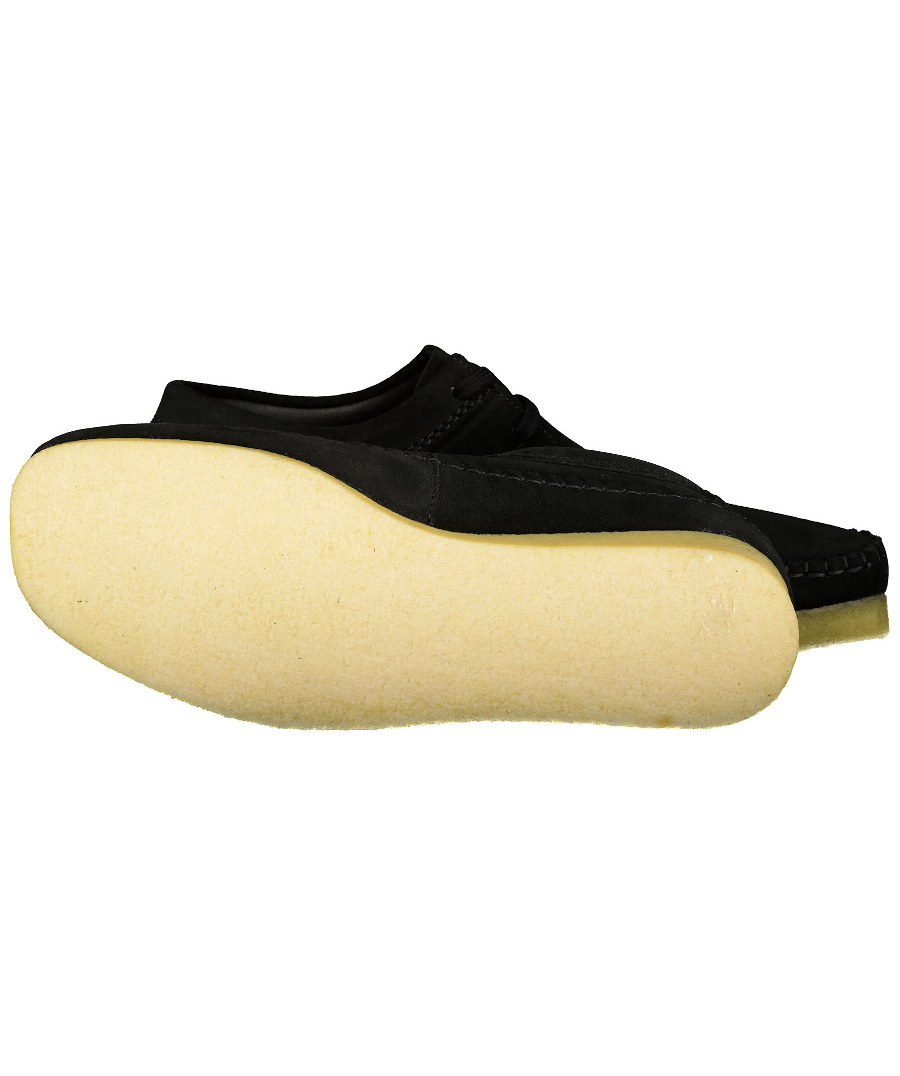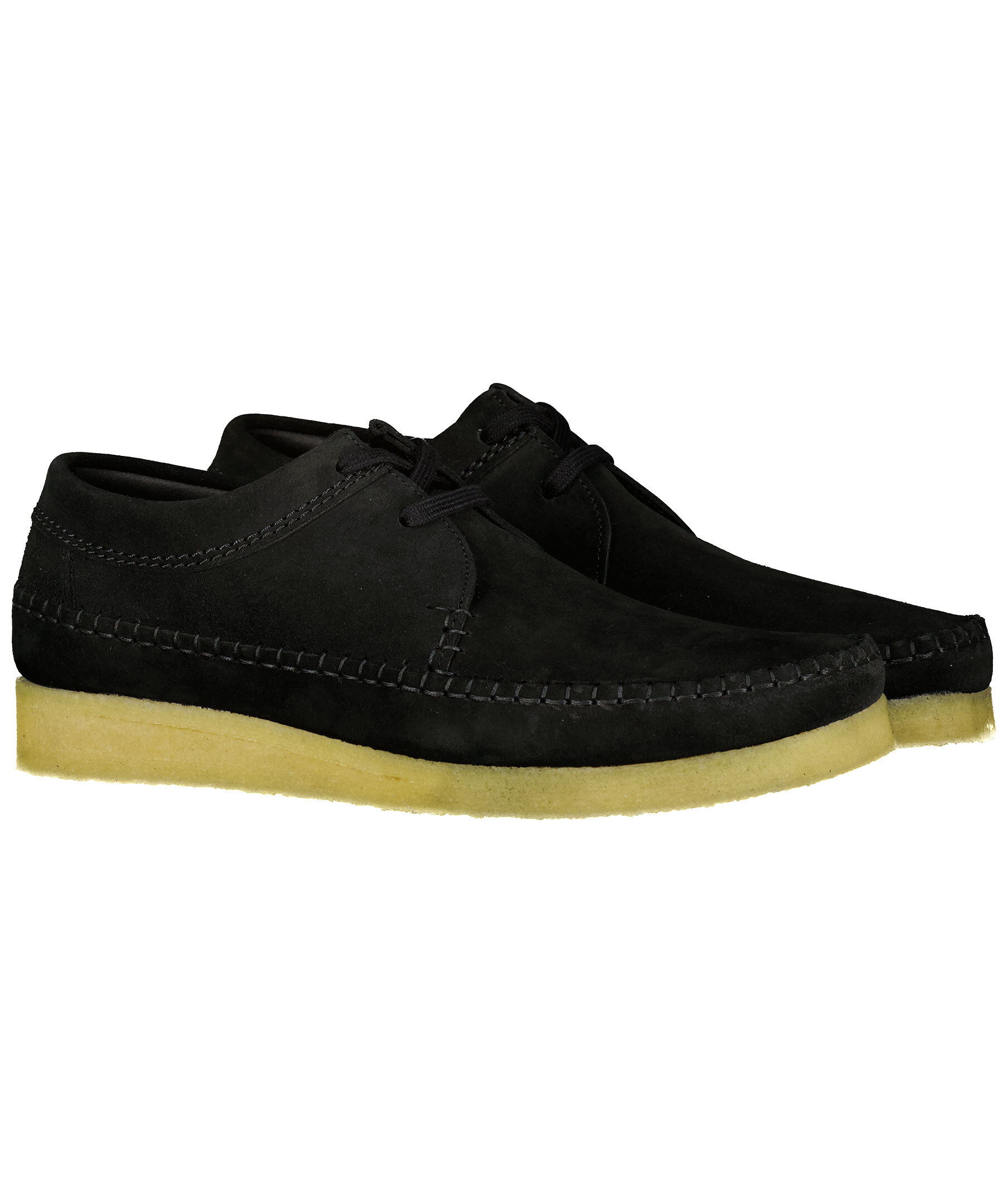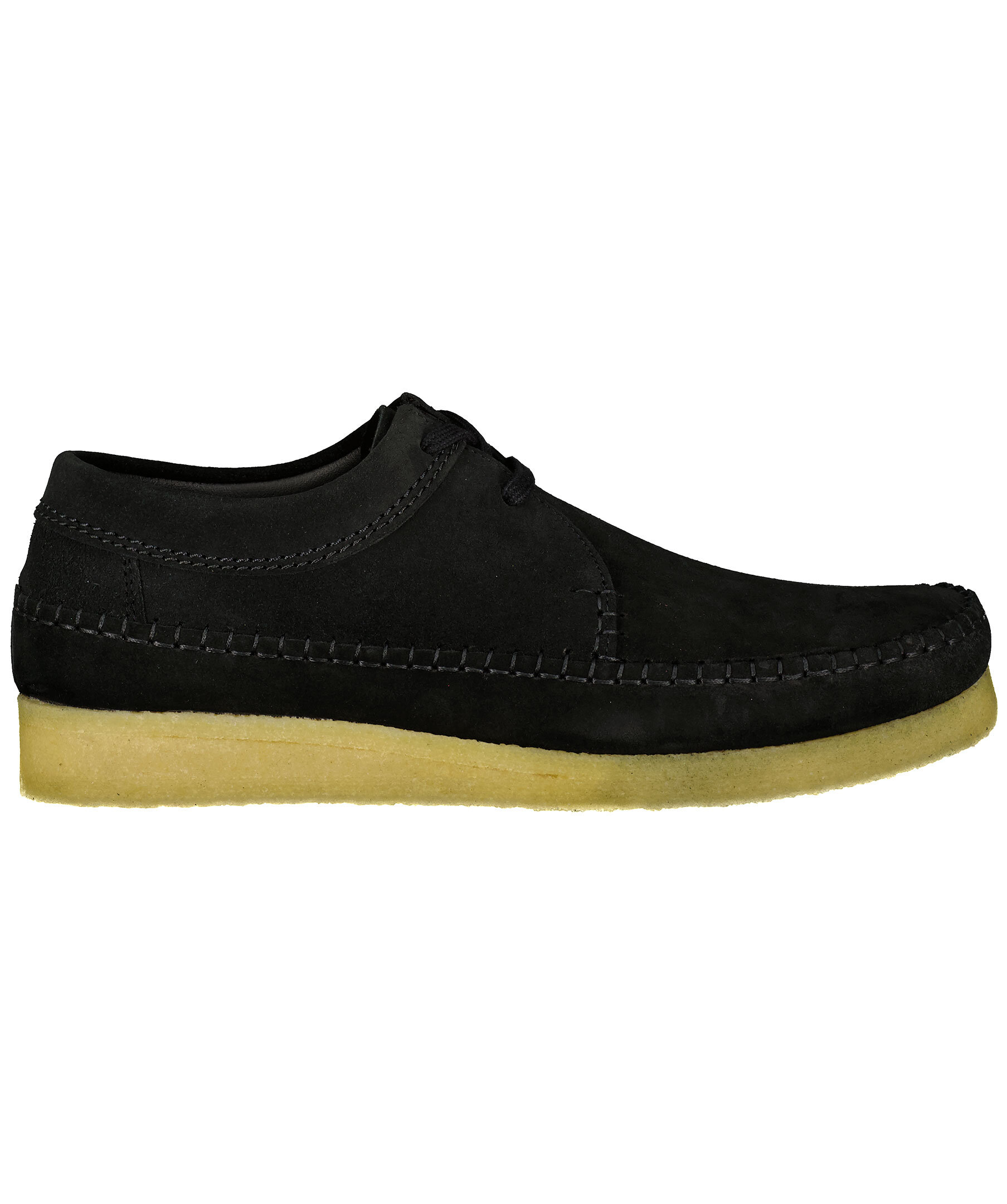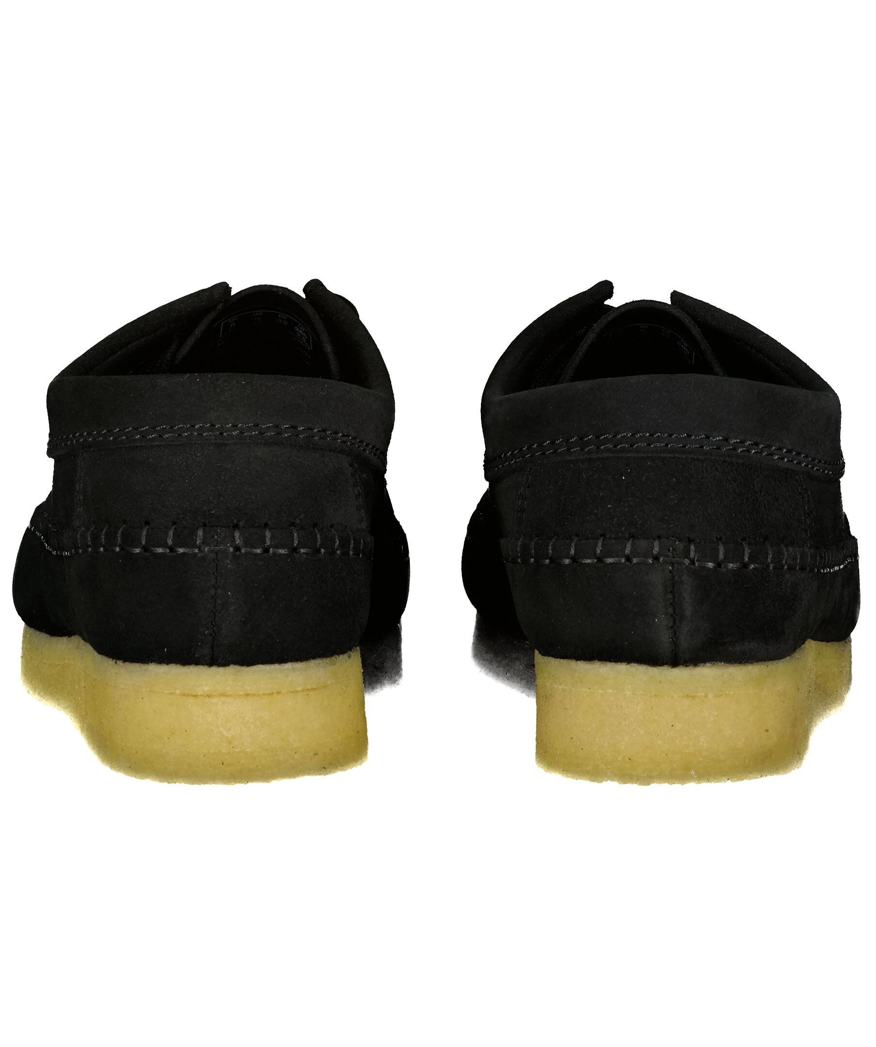 Svarta mockaboots i Clarks klassiska Wallabee-modell. Skorna har enkla och rena linjer och en tjockare, ljust beige crepe-sula. Skorna har tvåhålssnörning med brunt skosnöre.