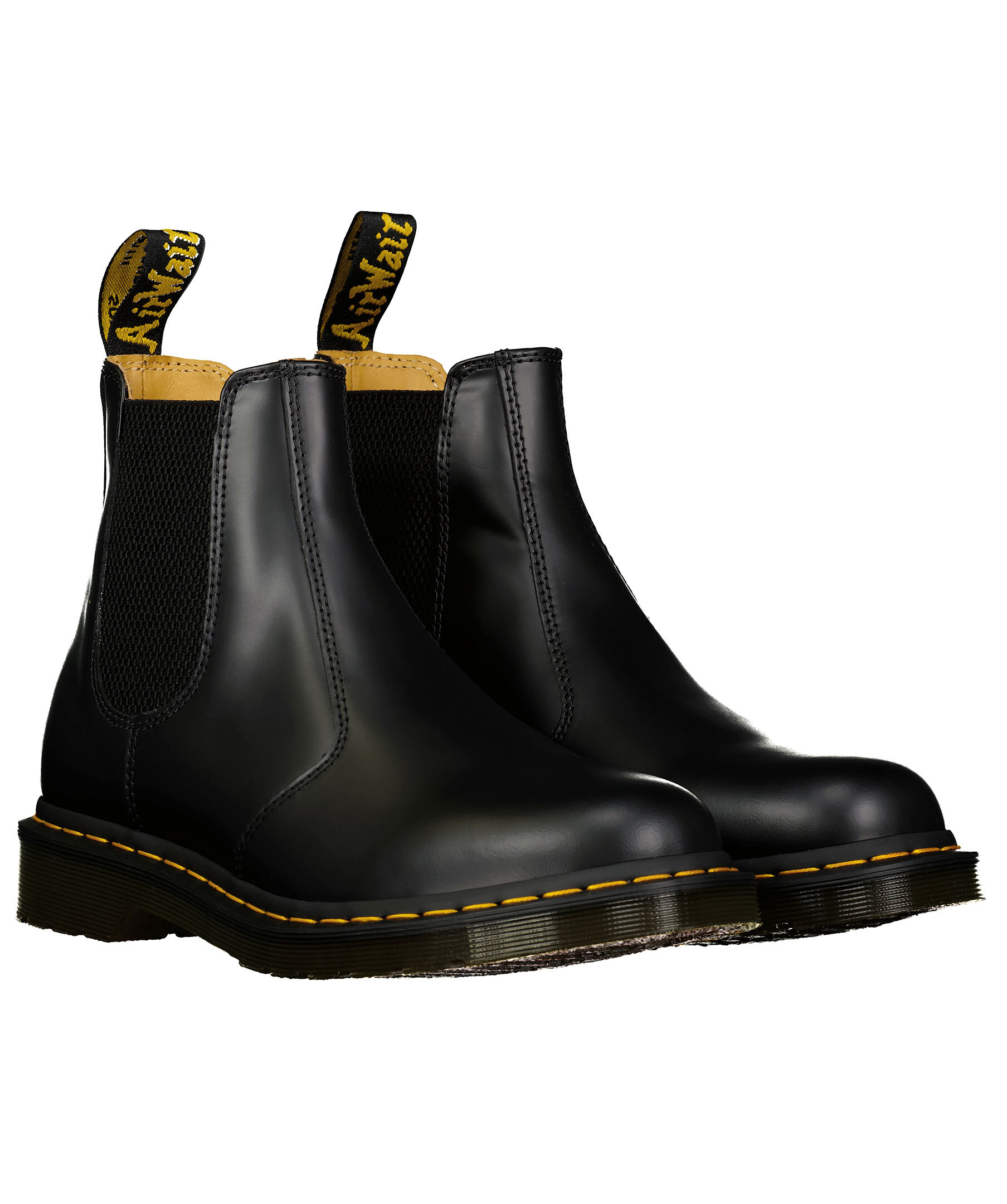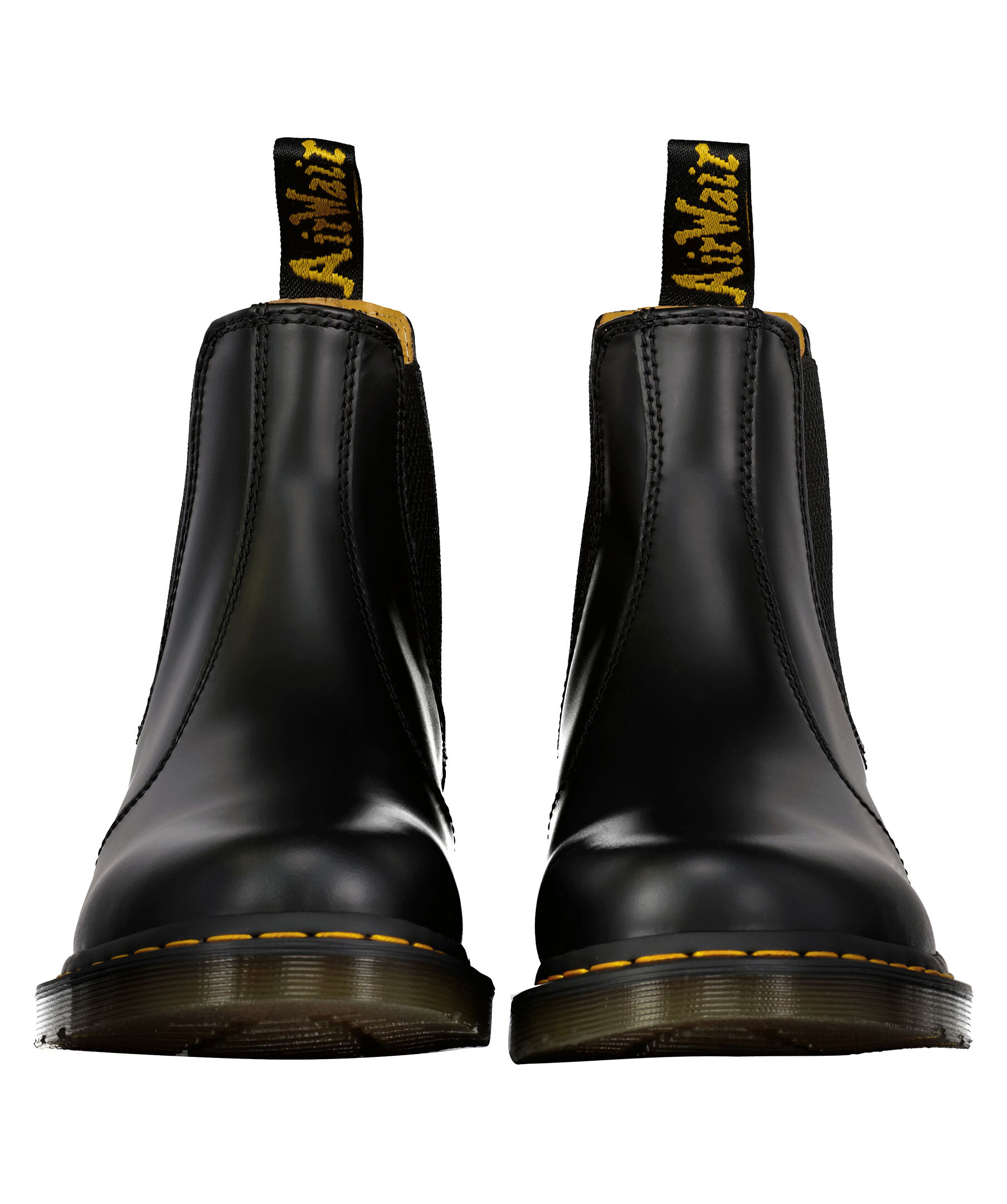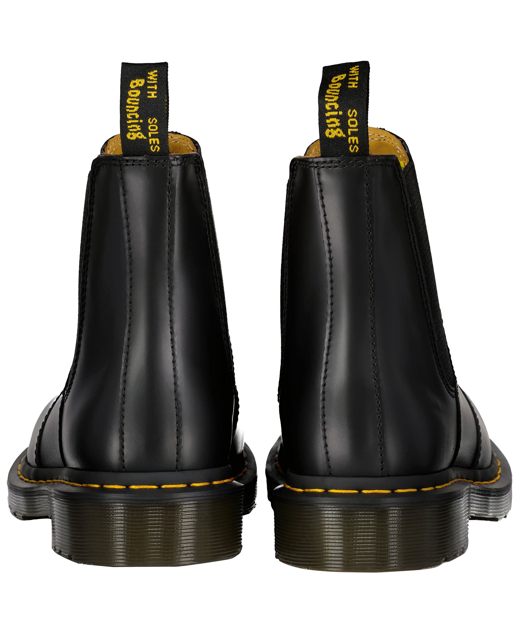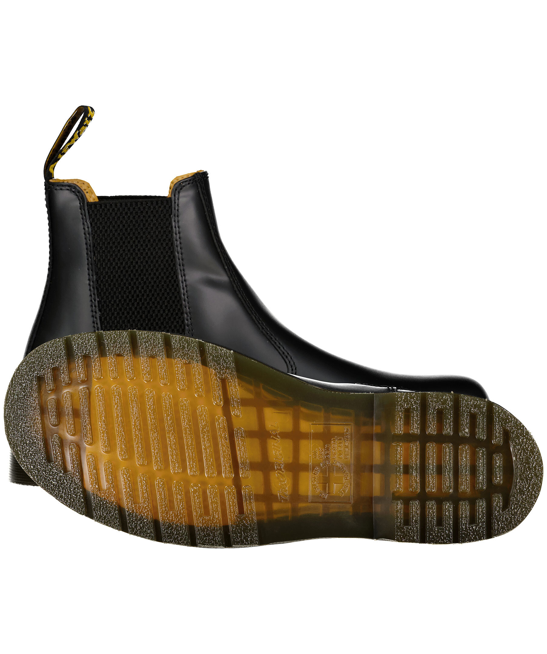 Svarta chelsea boots från Dr. Martens. Resår i sidan, ikonisk häl-ögla, gul söm nedtill. Fodrade med svart, mjukt foder i polyester. Tillverkade i läder och sula i gummi.