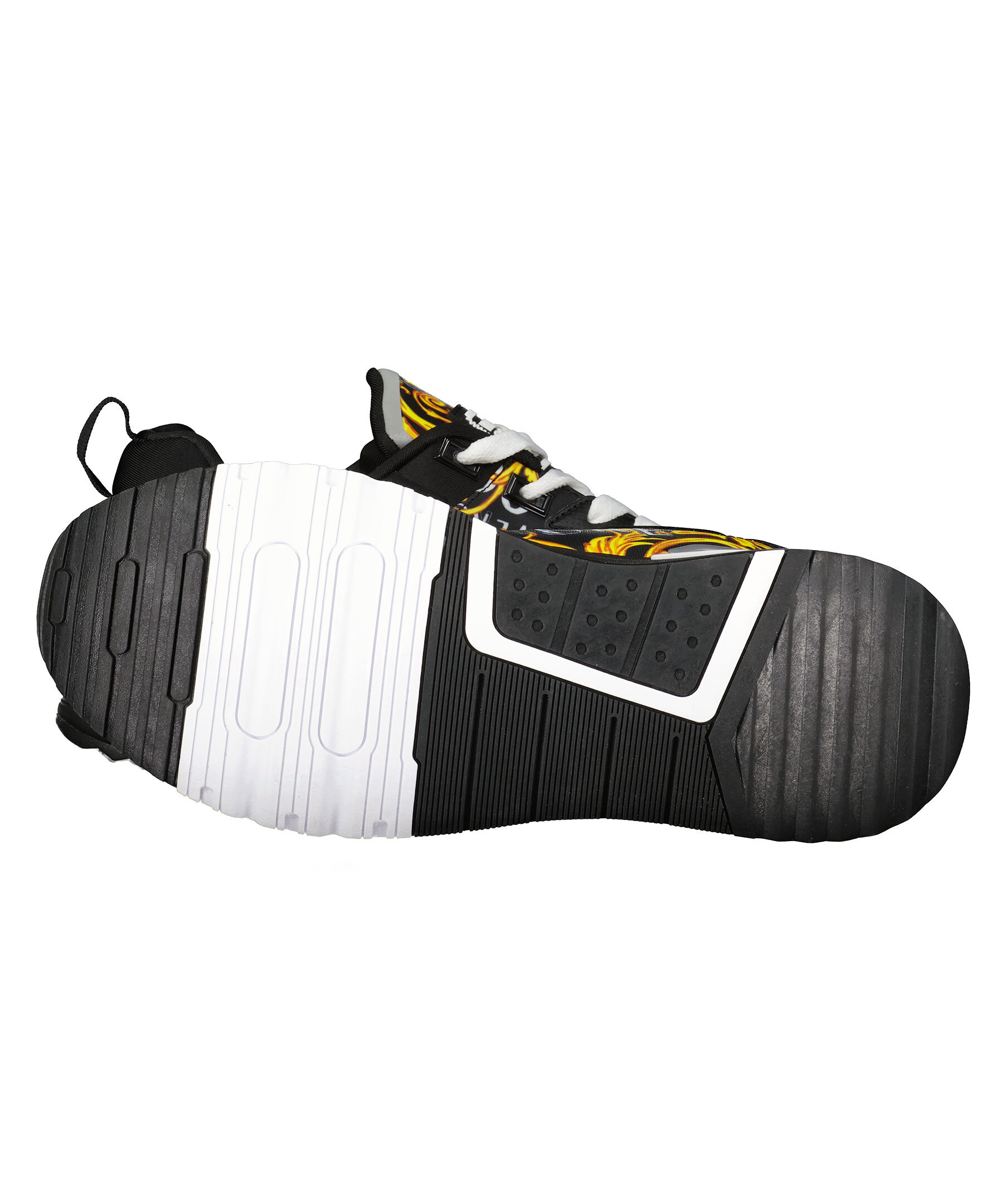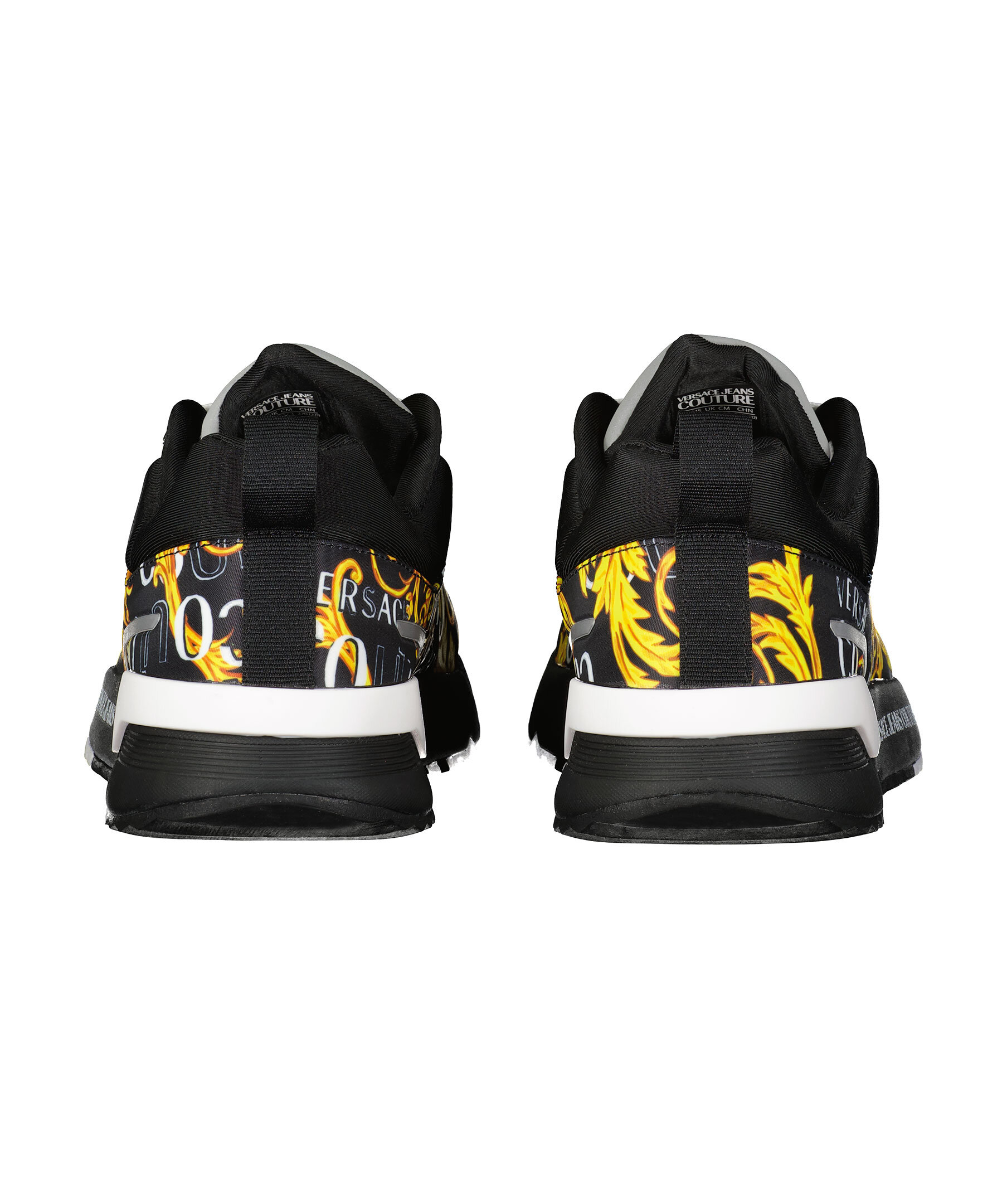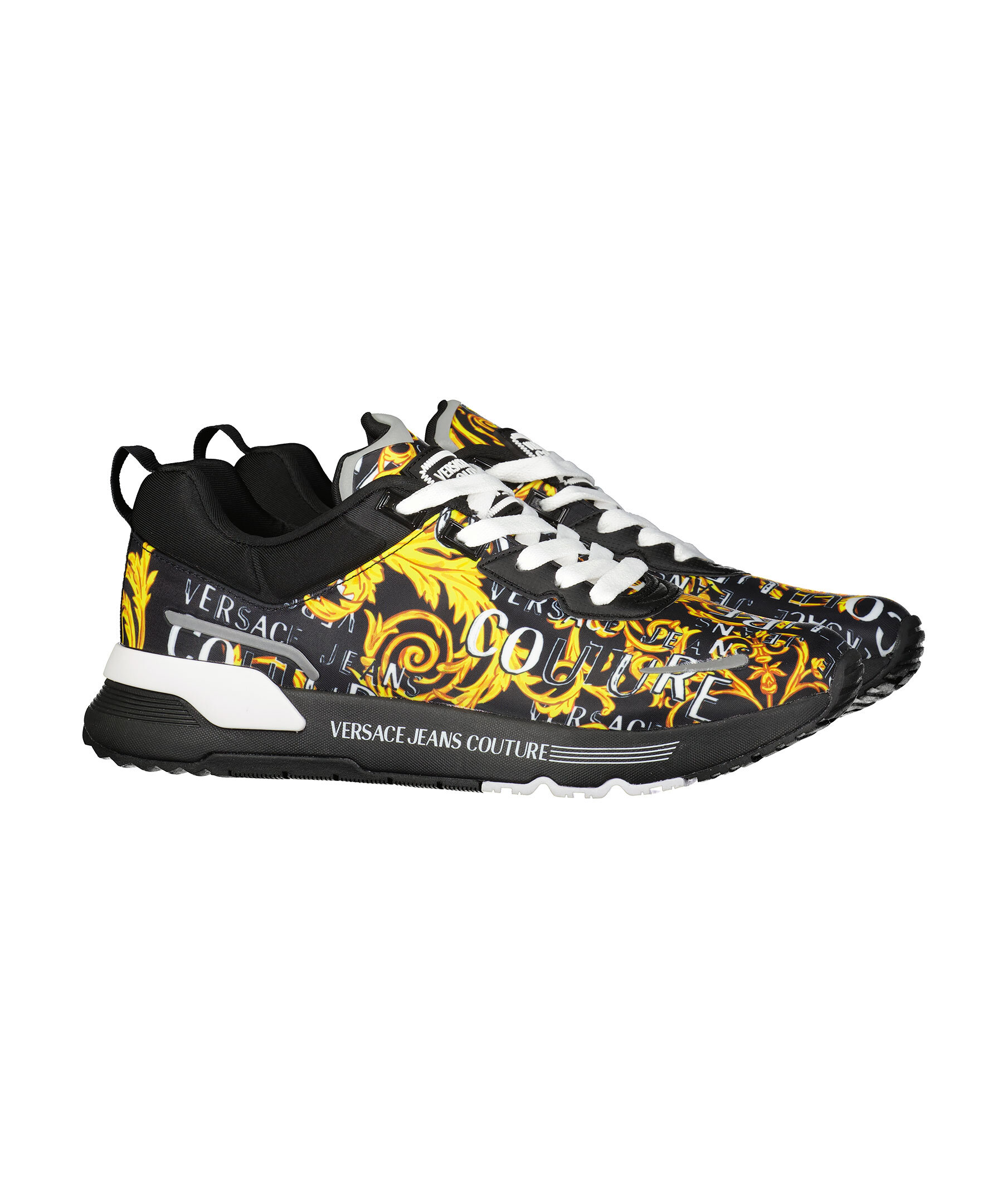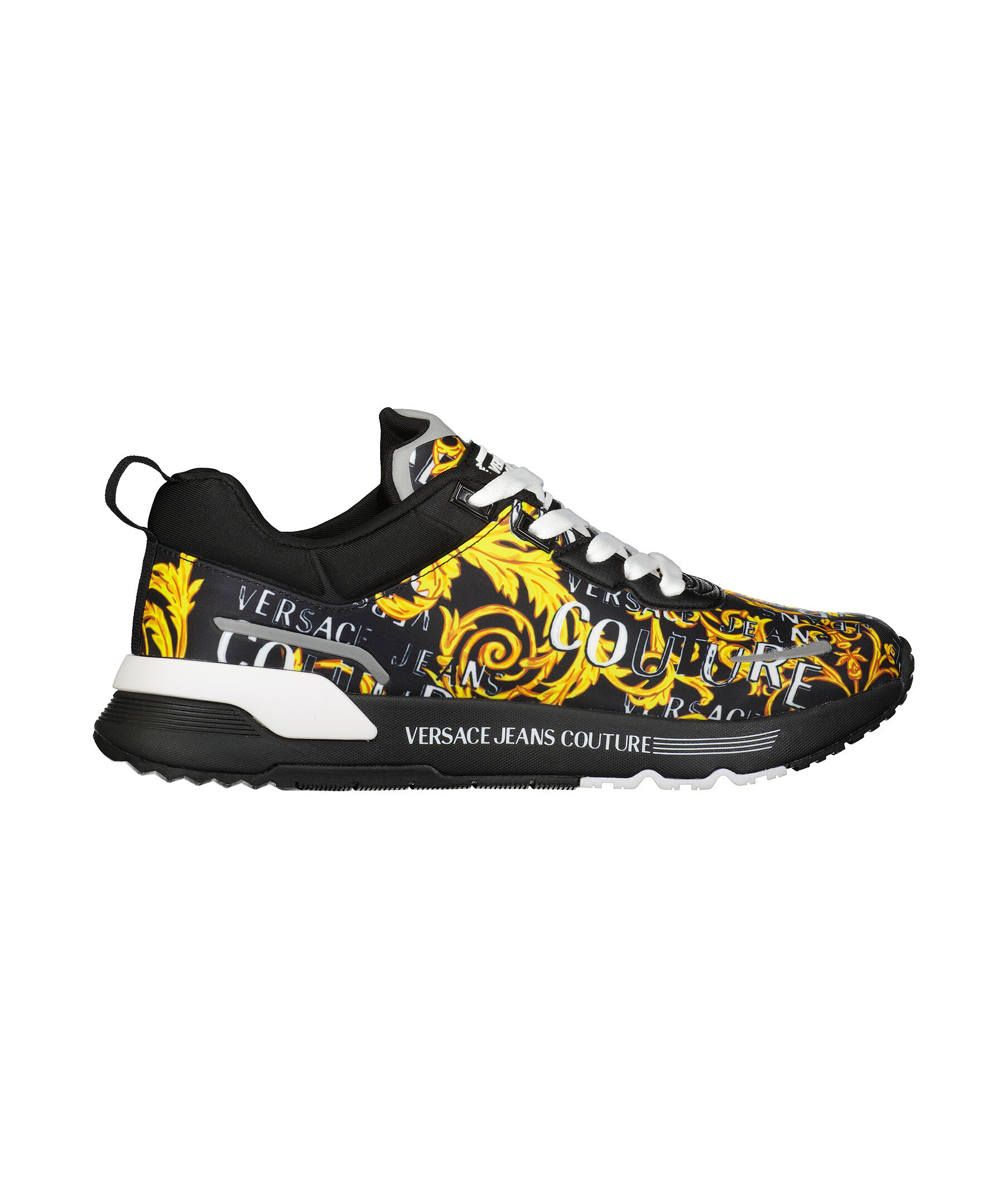 Svarta sneakers med barock mönster i gult från Versace Jeans Couture. Vita platta skosnören. Hög sula i svart gummi med vita detaljer. Gummerad patch med logotyp på plösen. Svart ögla vid hälen.