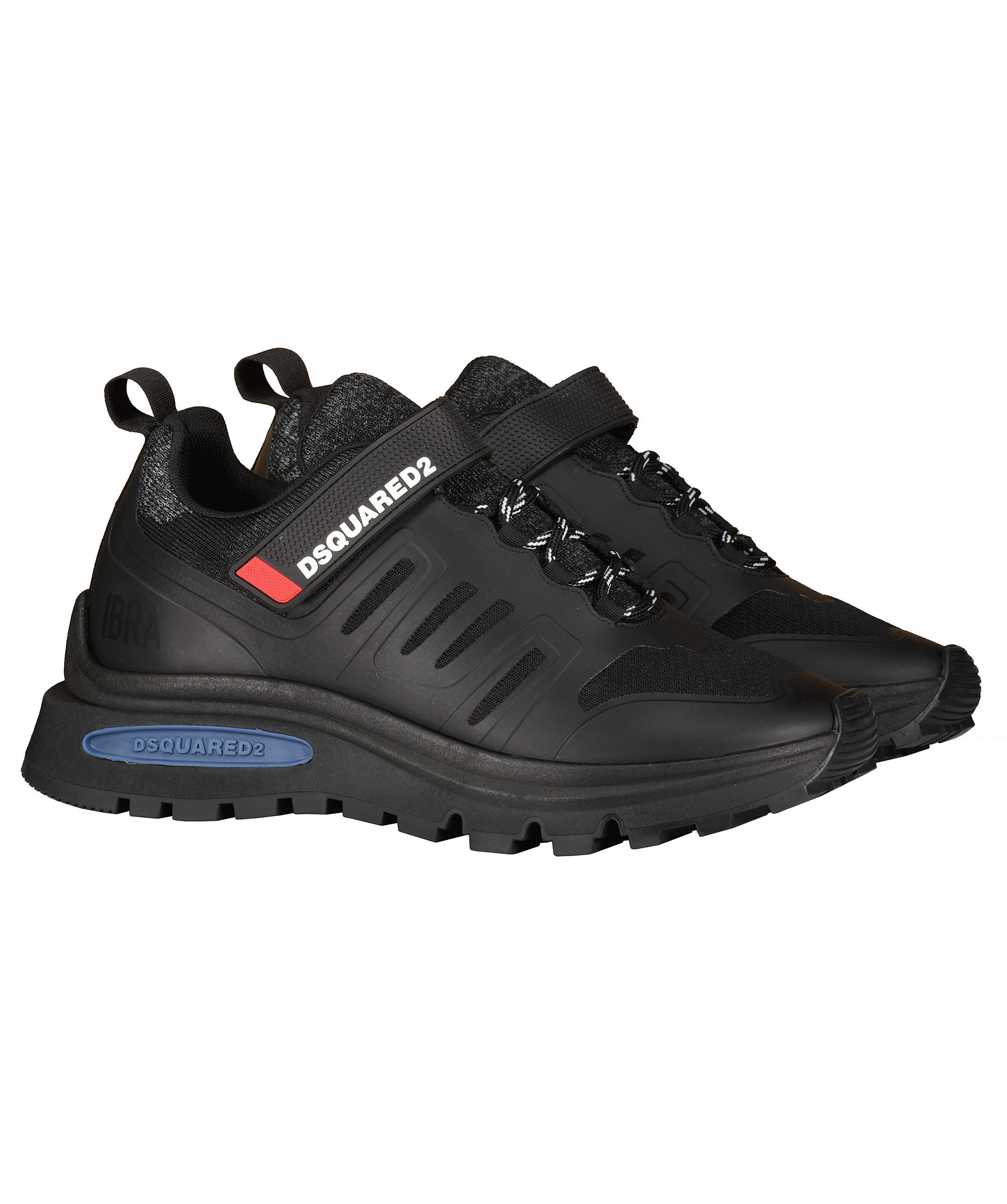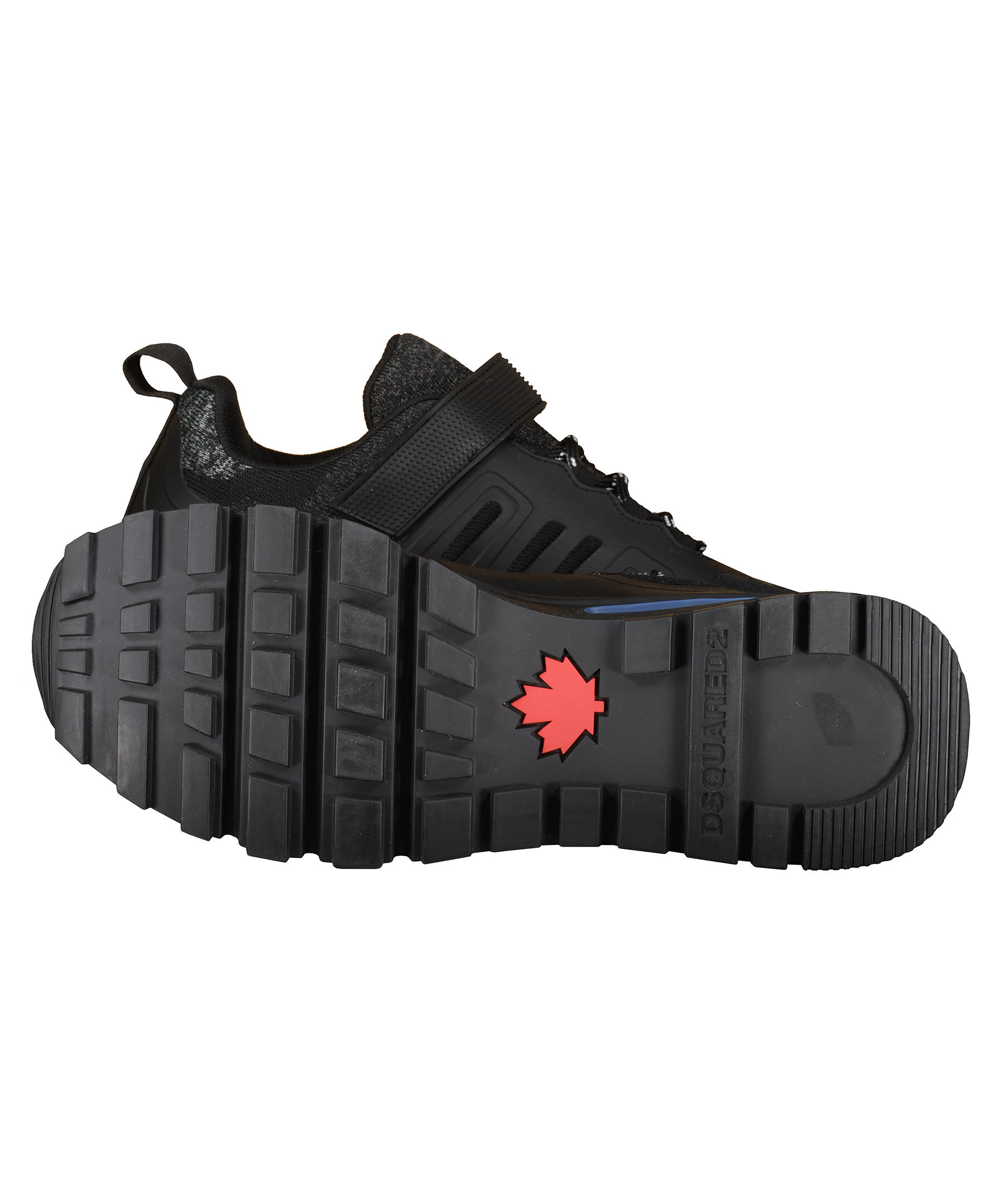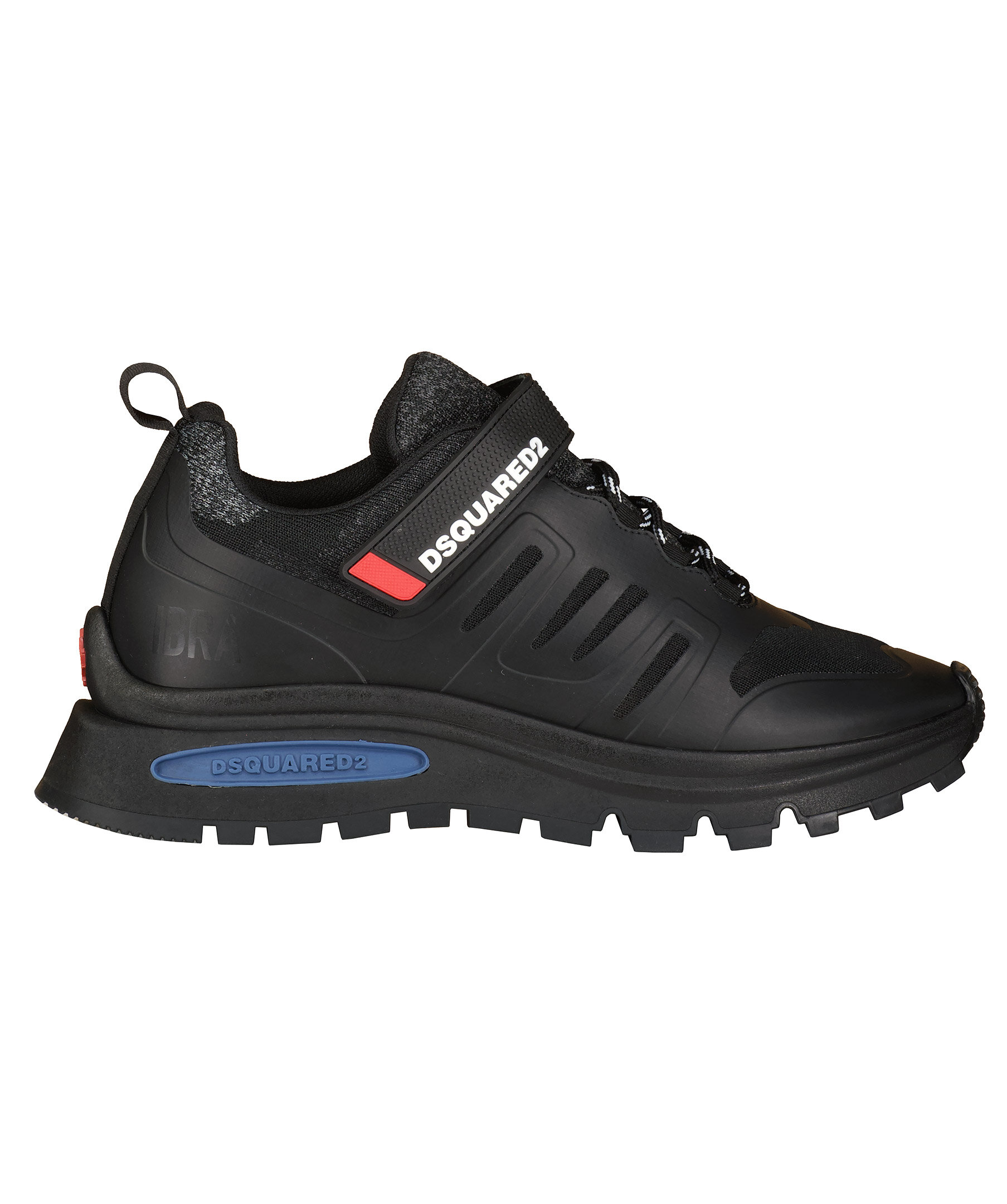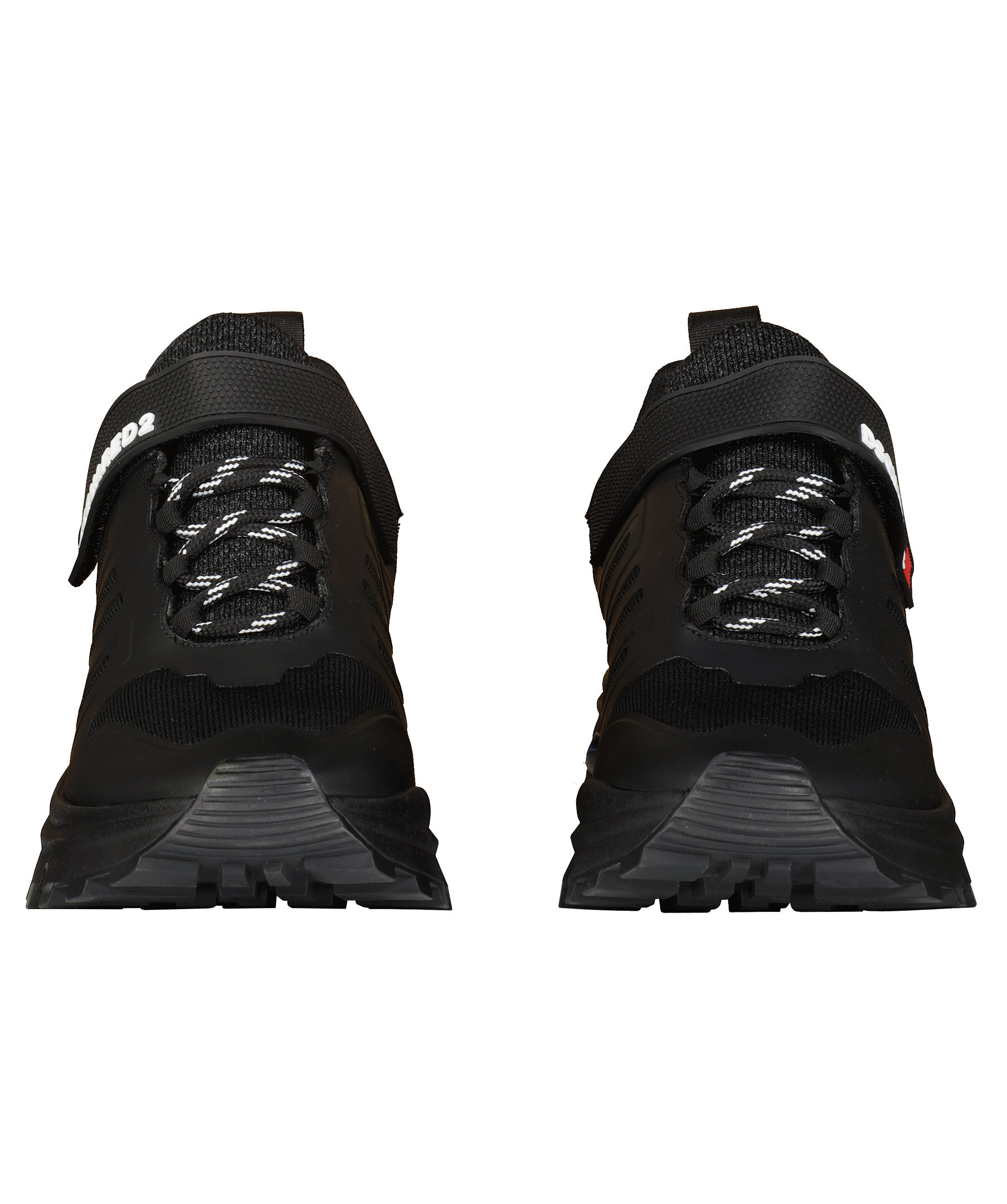 Svarta Sneakers från Dsquared2. Gråmelerade stickade detaljer. Skosnören i svart och vitt. Kardborre framtill med logotyp i vitt och röd detalj. Stansad logotyp på sulan i blått. Grov sula i gummi.