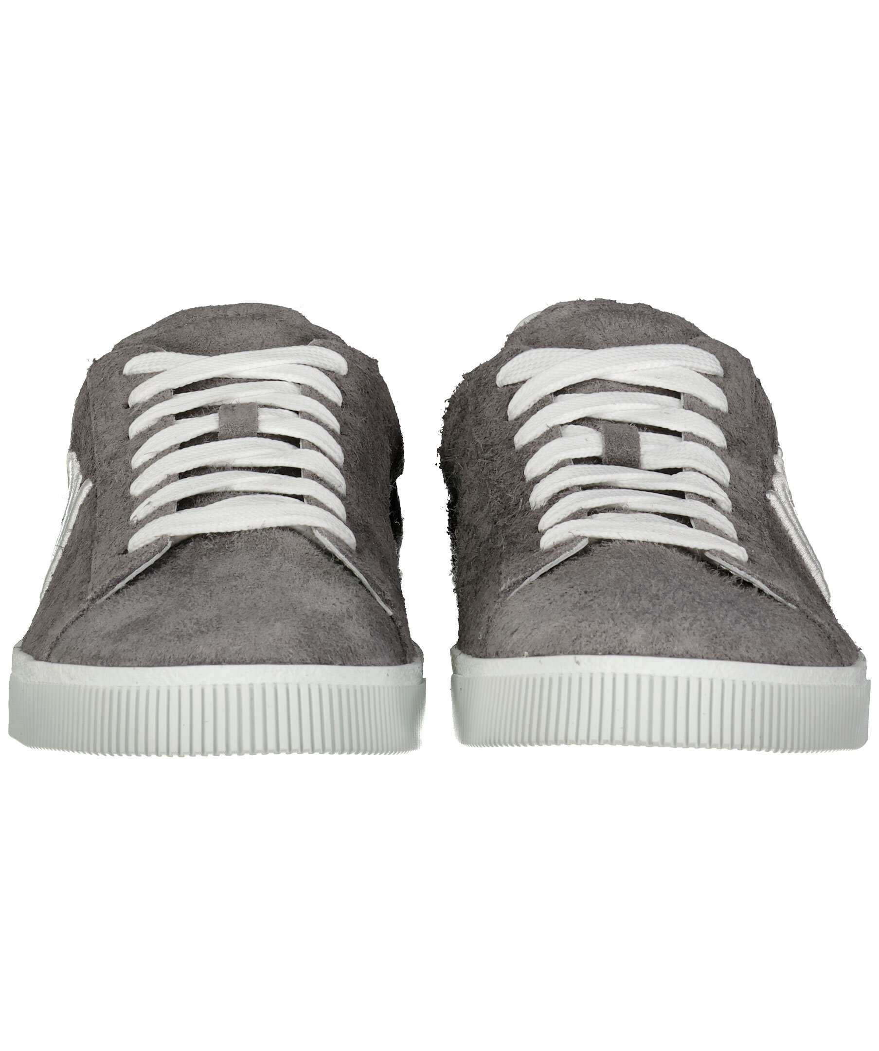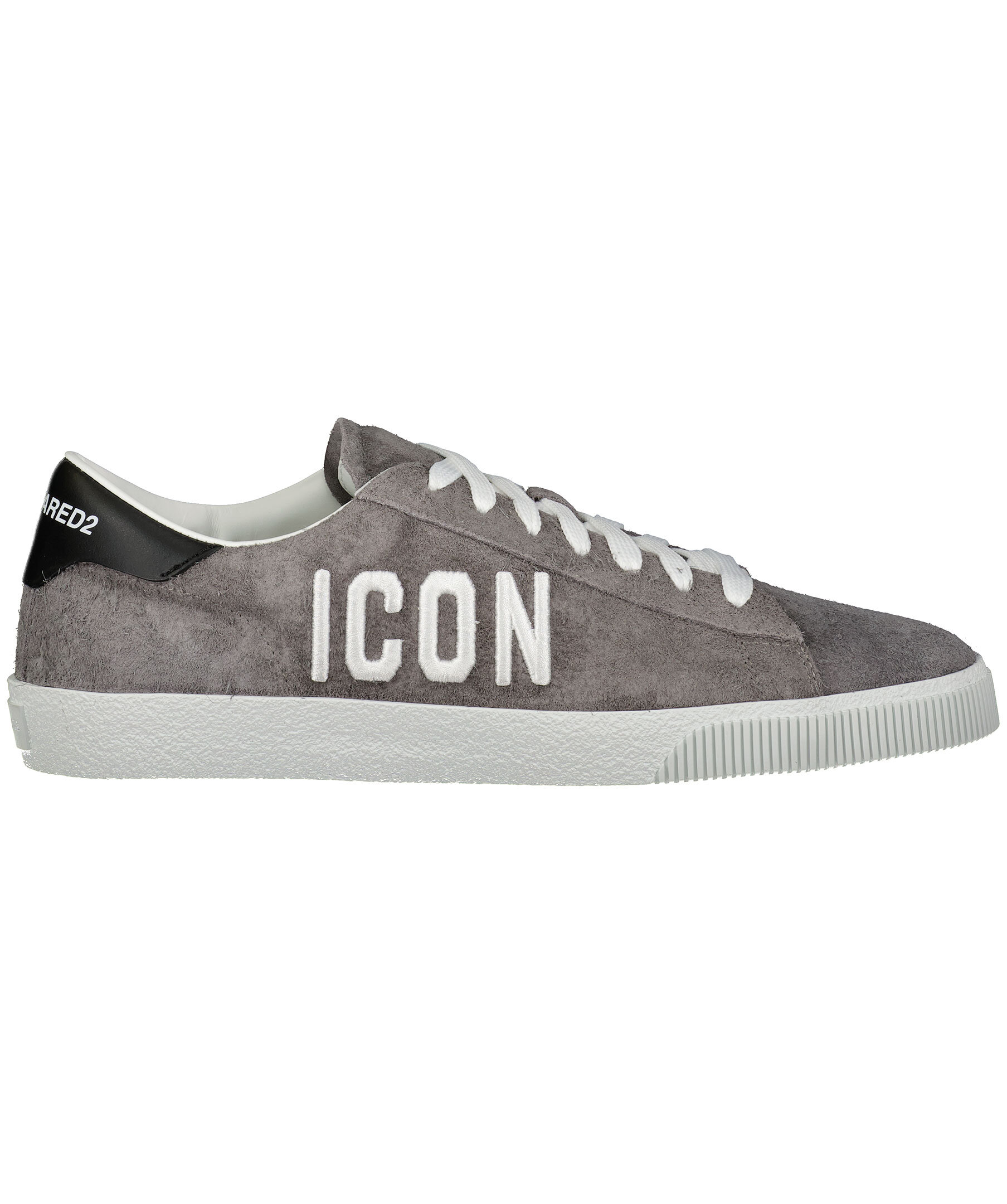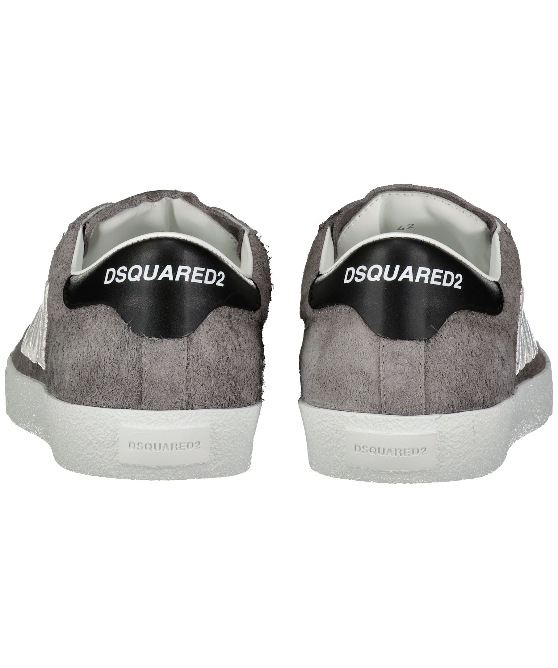 Gråa sneakers från Dsquared2. Tillverkade i mocka och har kontrastfärgat, svart läder på hälen med vit logotyp på. Vit, broderad logotyp på utsidan av skon. Vit gummisula med logotyp bak och vita skosnören.