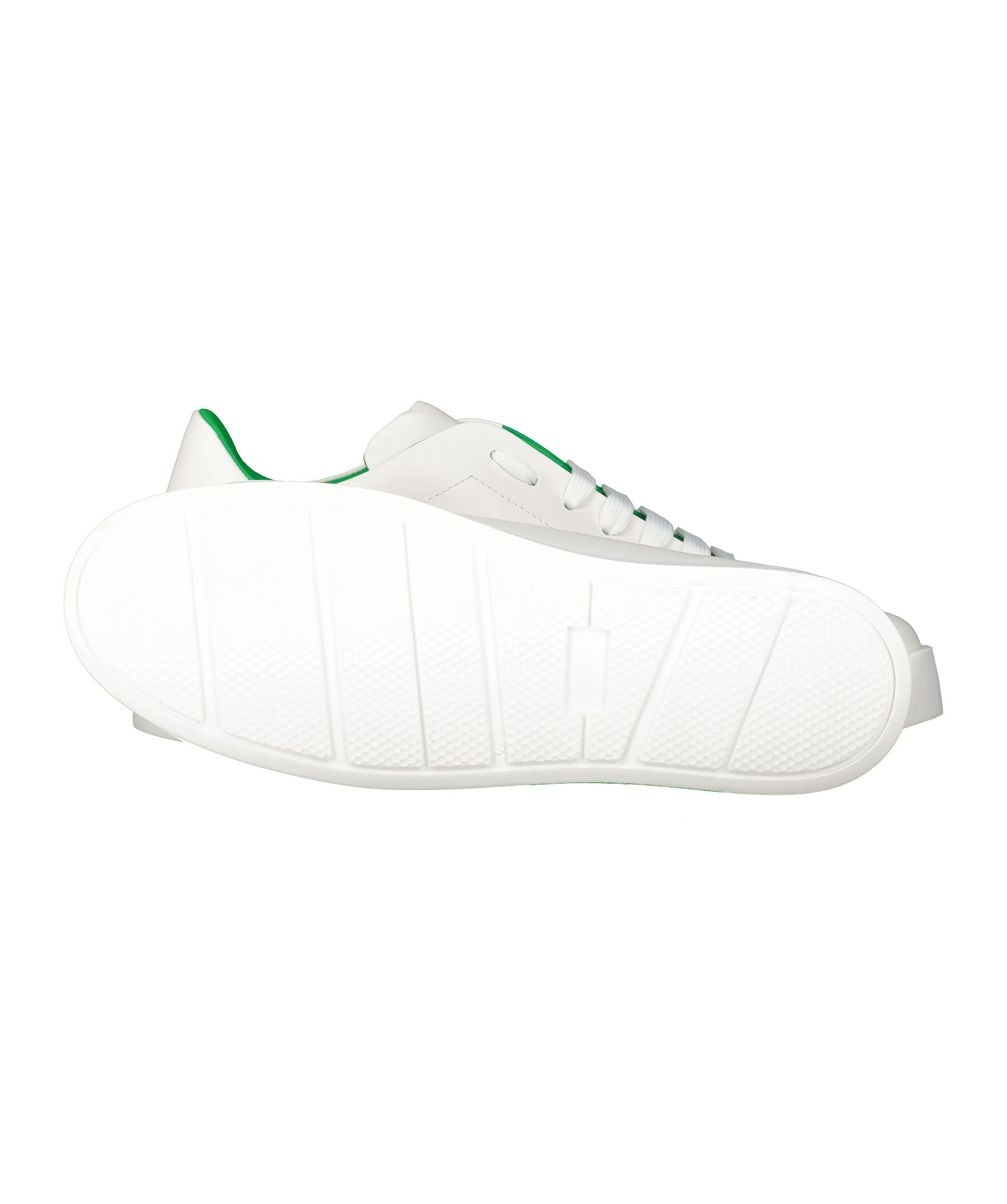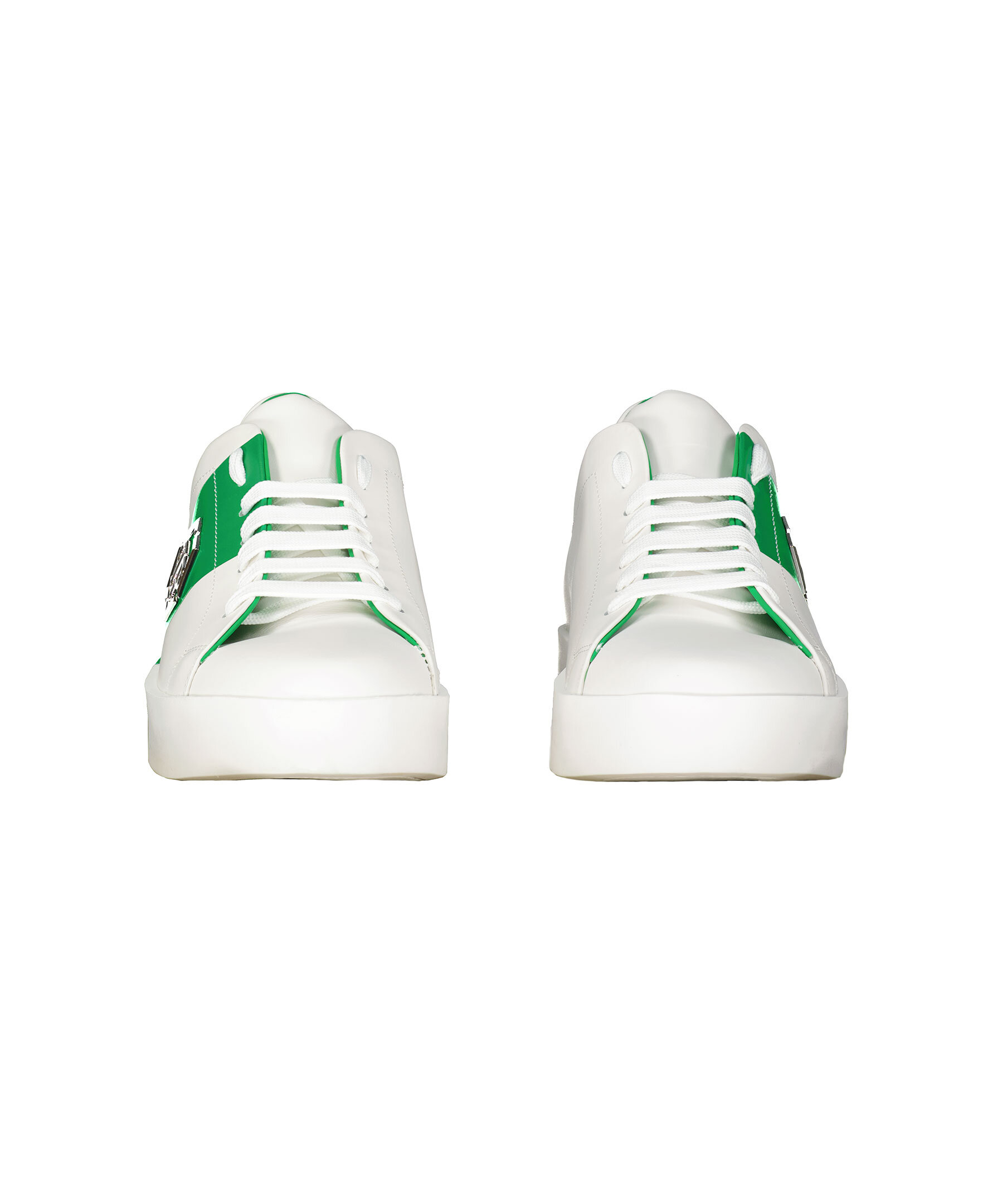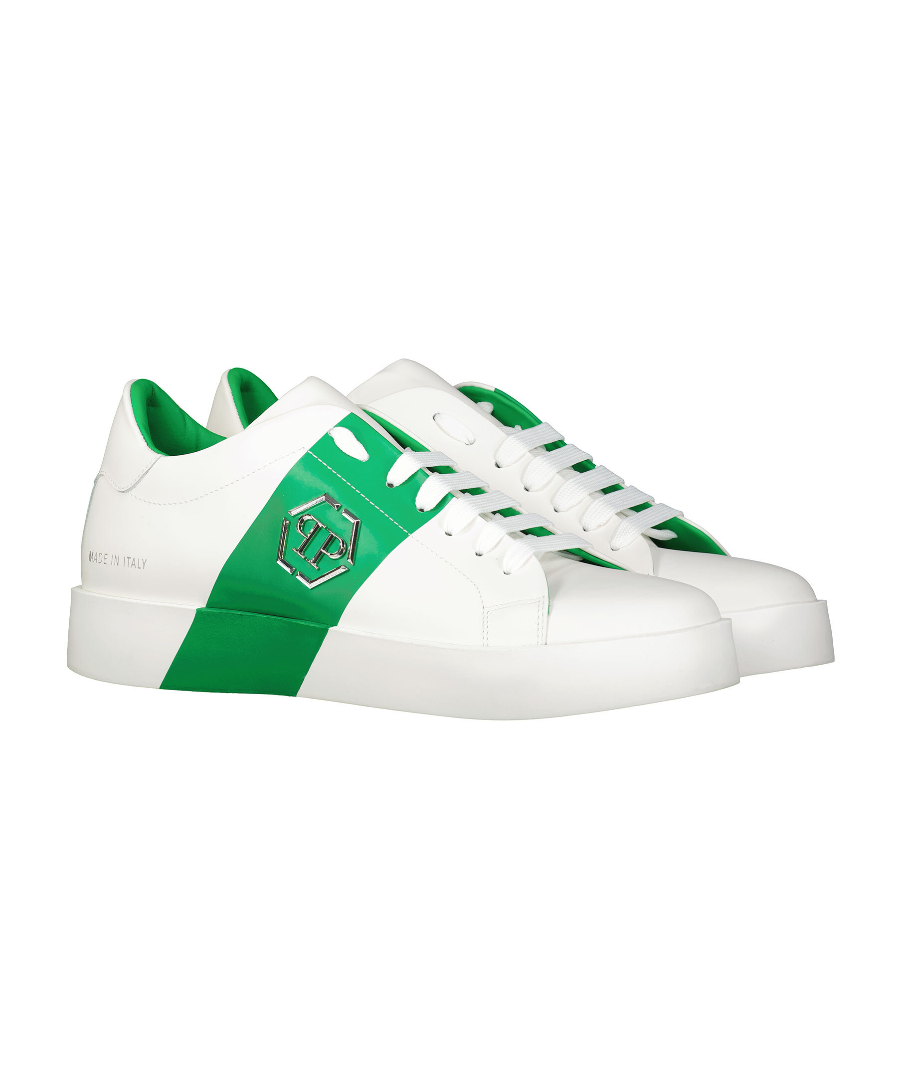 Vita sneakers i läder med grön rand från Philipp Plein. Logotyp i metall på skons yttersida. Grov sula i gummi. Platta skosnören i vitt. Logotyp i metall på skons yttersida.