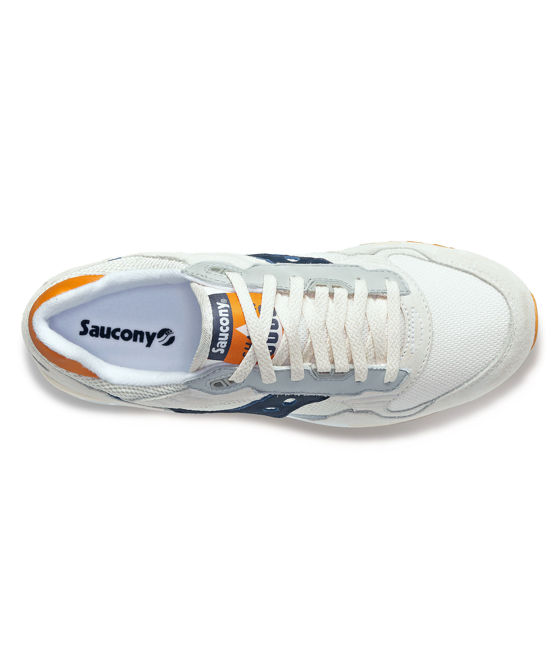 Ljusbeigea sneakers från Saucony. En retroinspirerad sneaker som varumärket skapade på 80-talet tillverkad i mocka och har en mjuk och flexibel sula som ger hög komfort och dämpning. Mörkblå och orange detaljer och vita skosnören, som även kan bytas ut mot orange skosnören. Skorna är små i storlek, vi rekommenderar att gå upp en storlek.