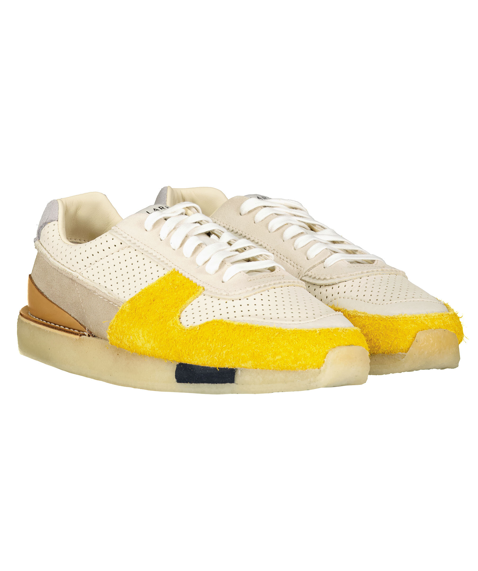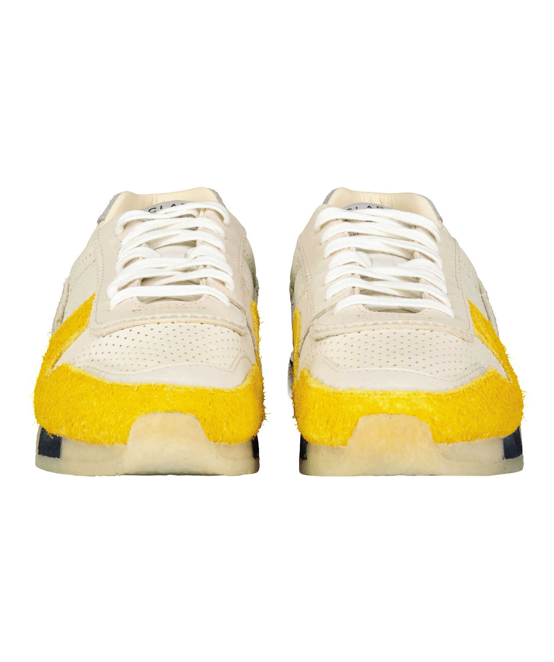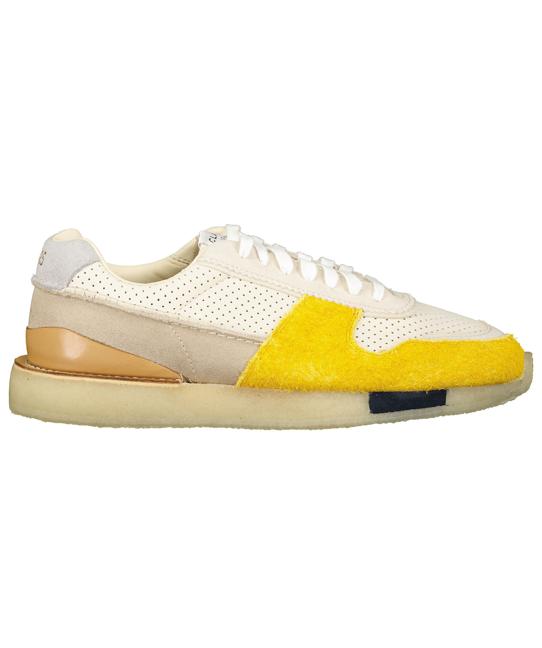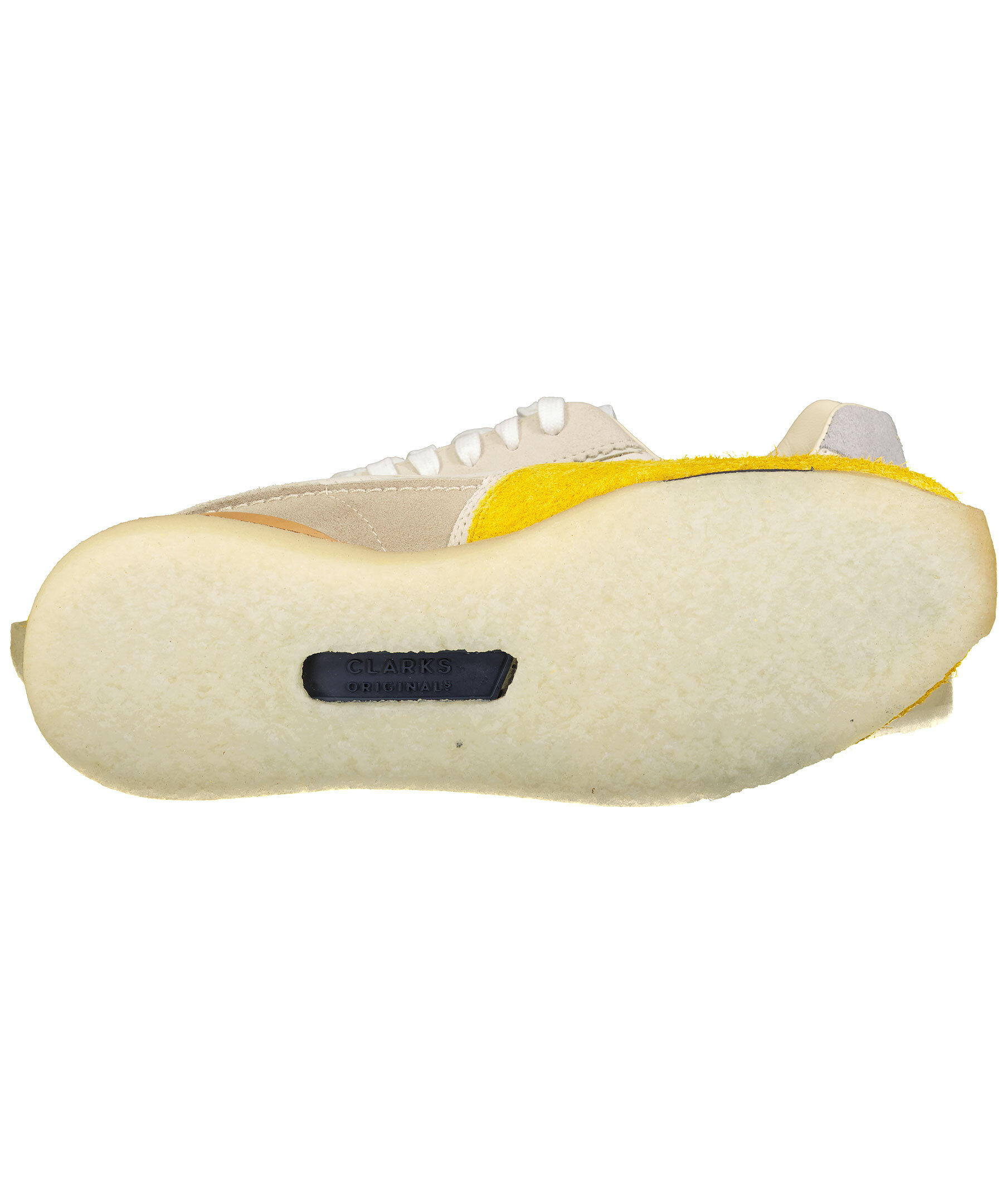 Flerfärgade sneakers med ljusgrå bas från Clarks. Gula detaljer i borstad mocka, mönstrade med små hål, plös med logotyp och beige crepe-sula. Vita skosnören och medföljande skosnören med ljusgrå bas och svarta och gula inslag.