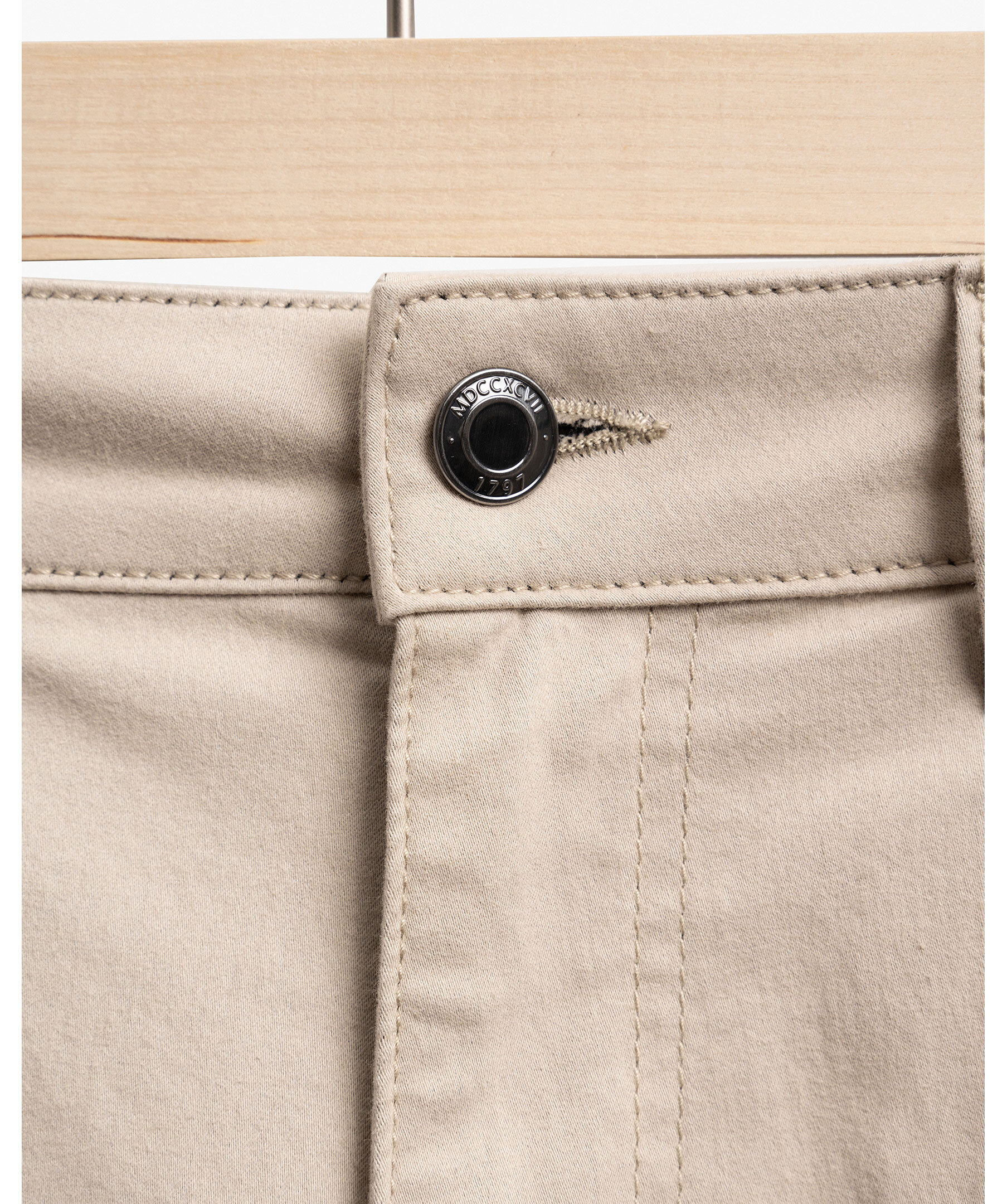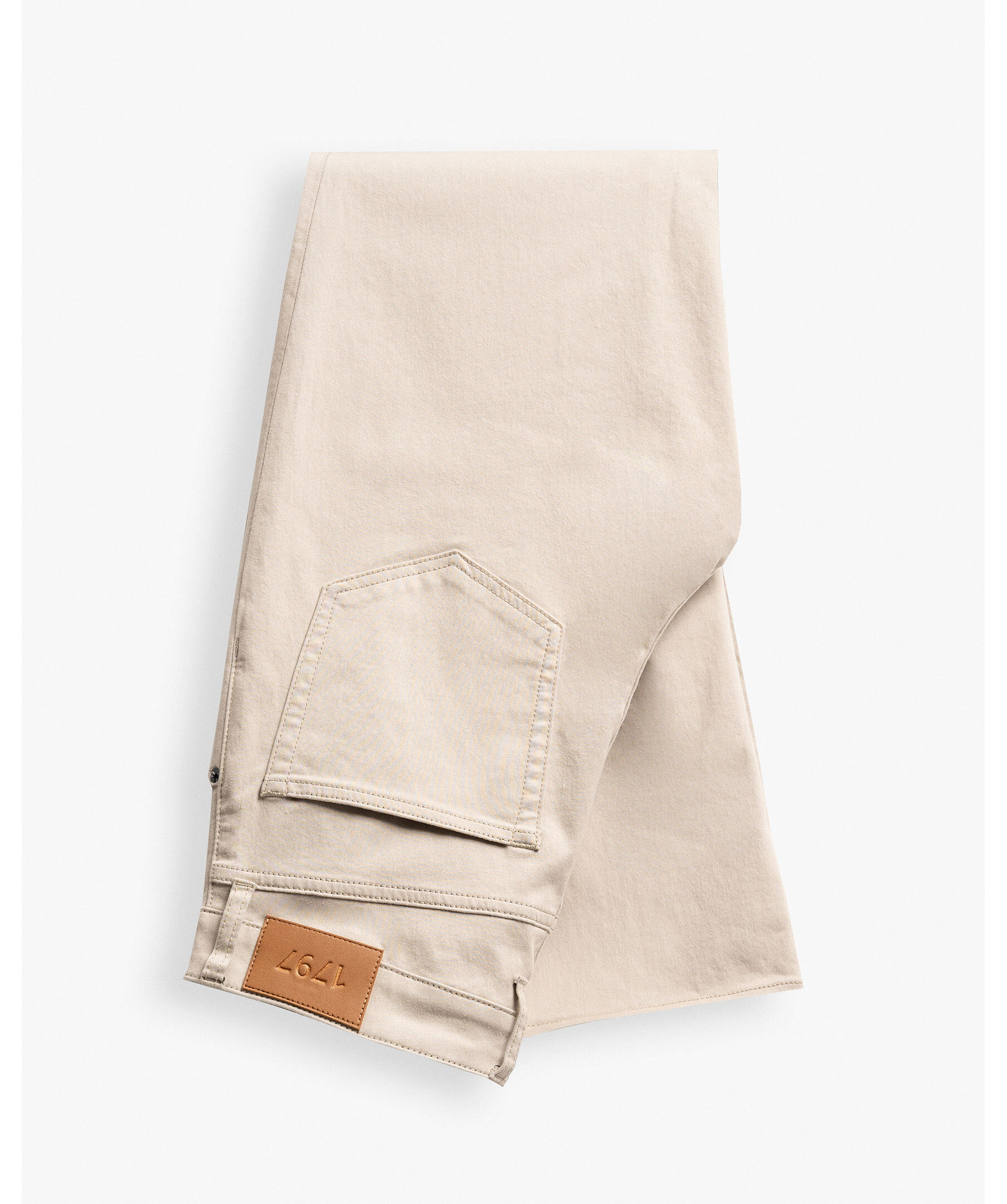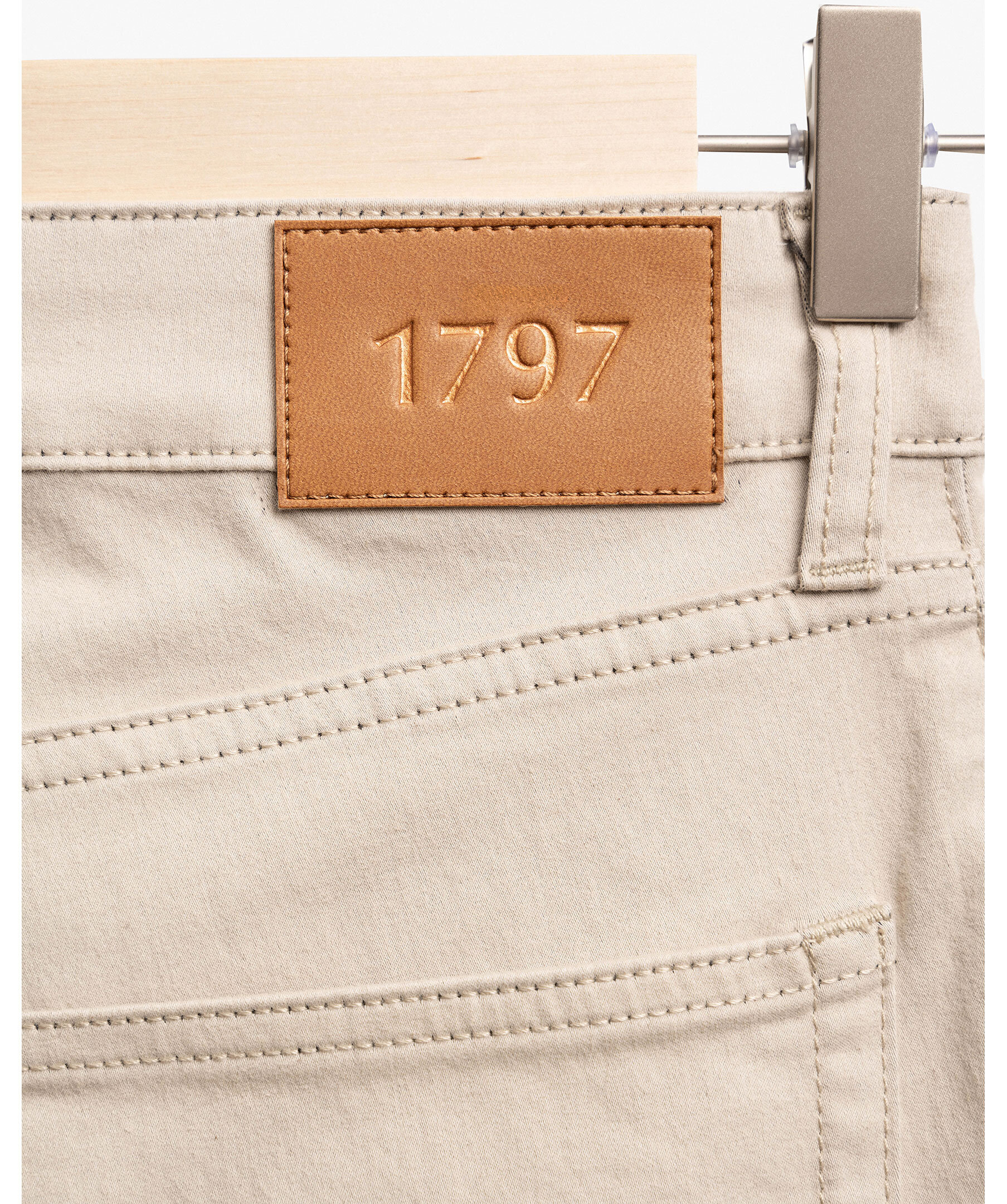 Beigea byxor från varumärket 1797. Byxorna har bälteshällor i midjan, fem fickor och en sidenlen finish. Tillverkade i en bomullsblandning.