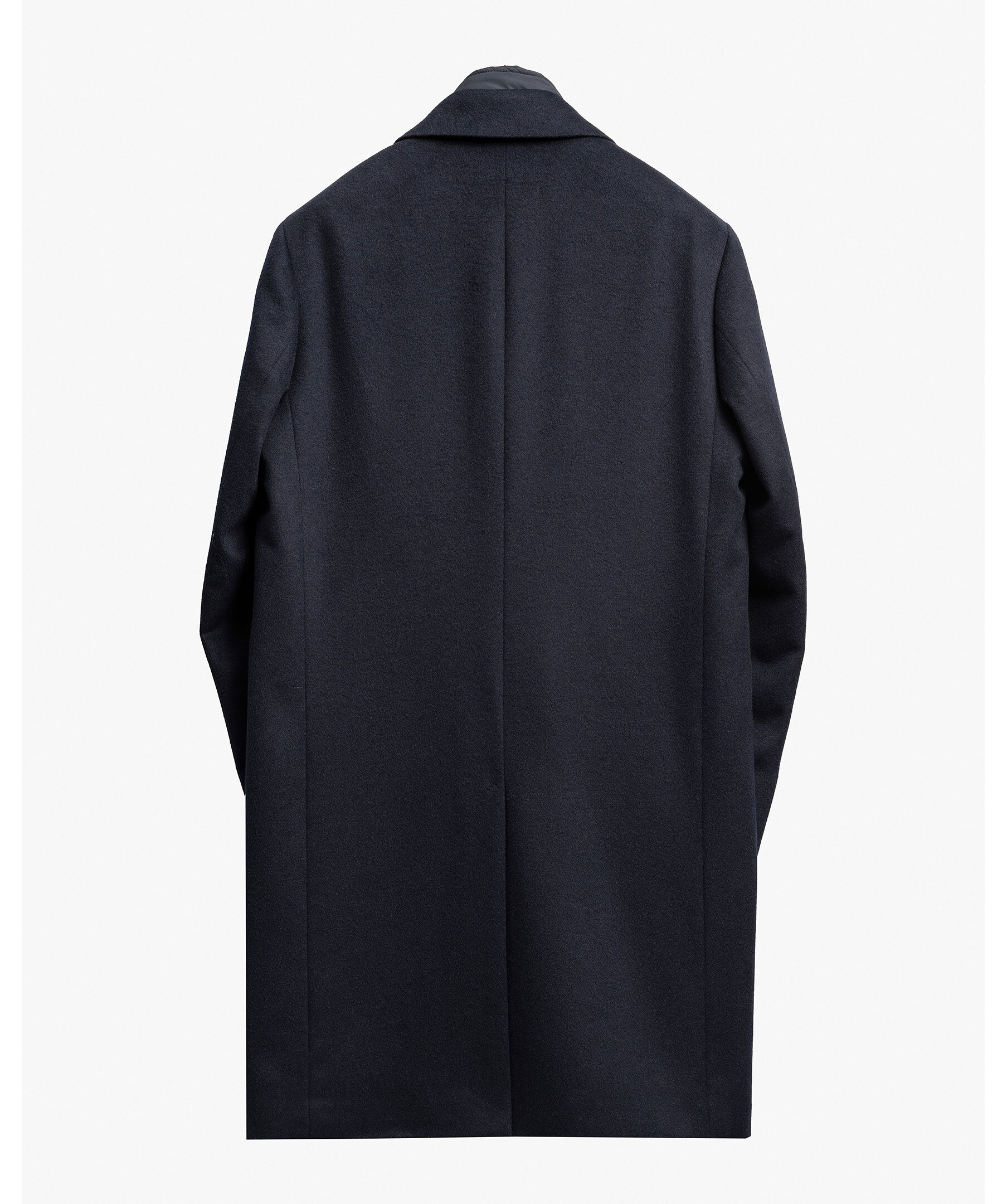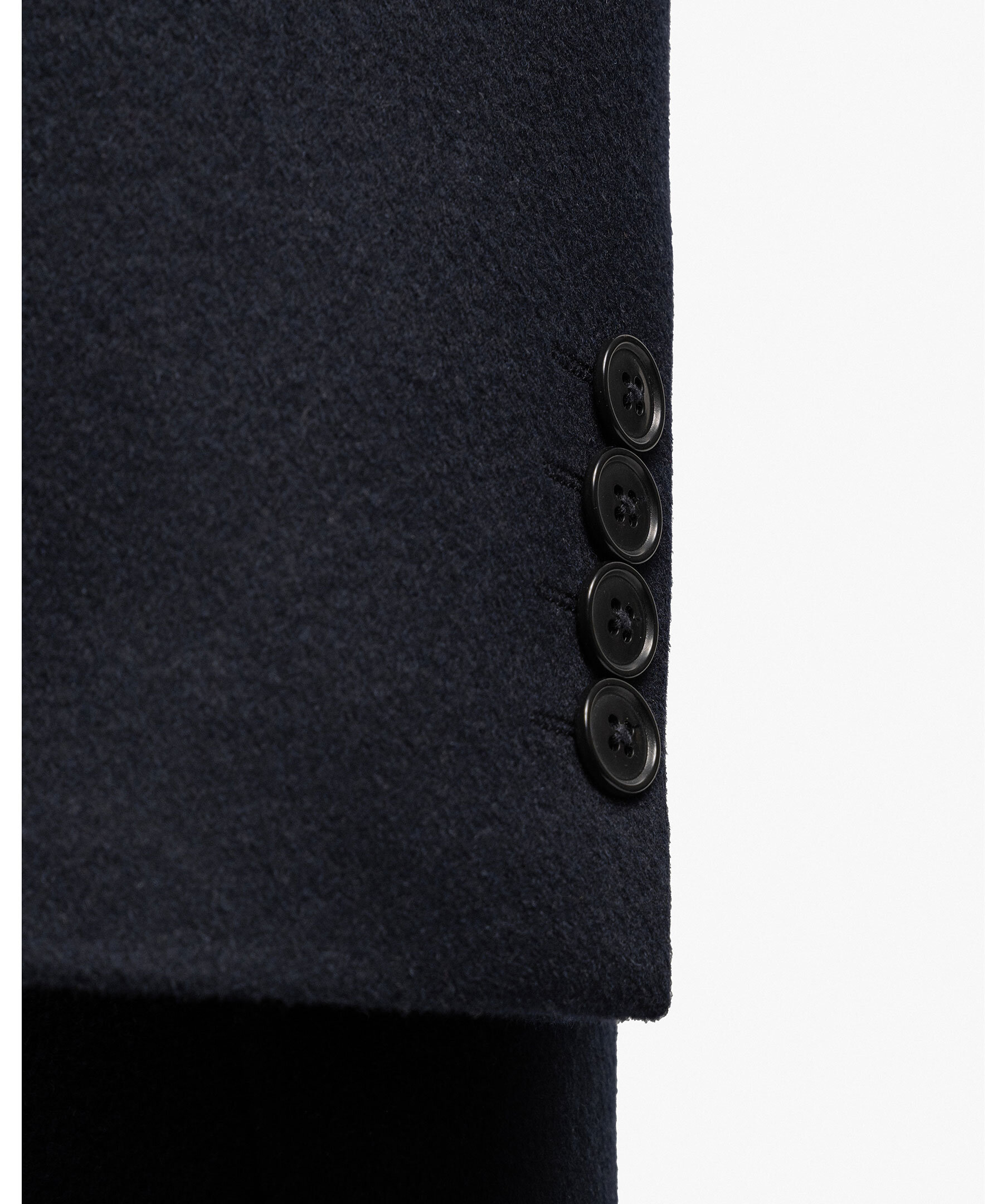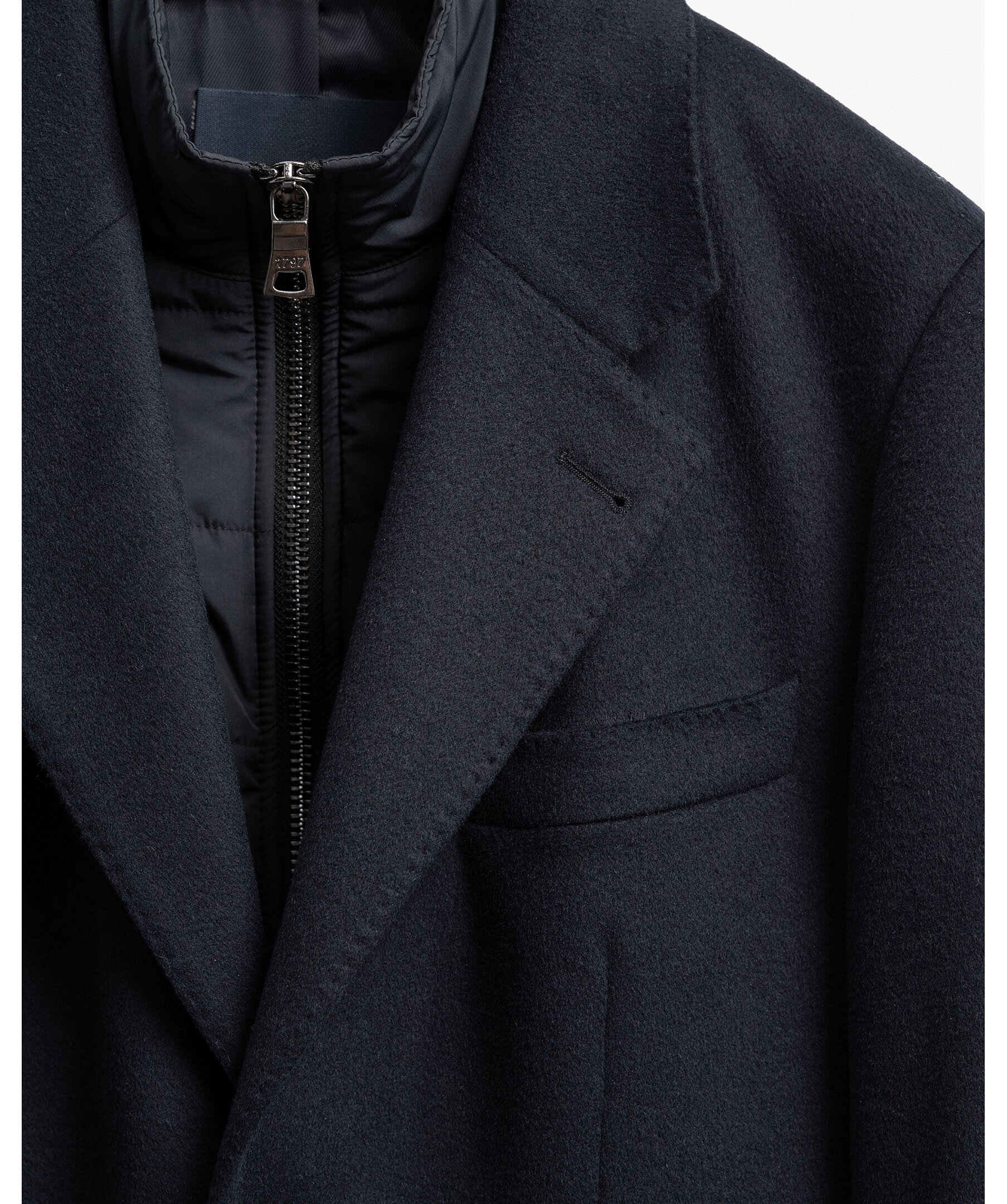 Elegant, enkelknäppt höst och vinter rock med klassisk krage i en mörkblå färg från varumärket 1797. Rocken har en inbyggd och avtagbar västfront, två sidfickor, en bröstficka samt en biljettficka med blixtlås. Tillverkad i en ullkashmirblandning.