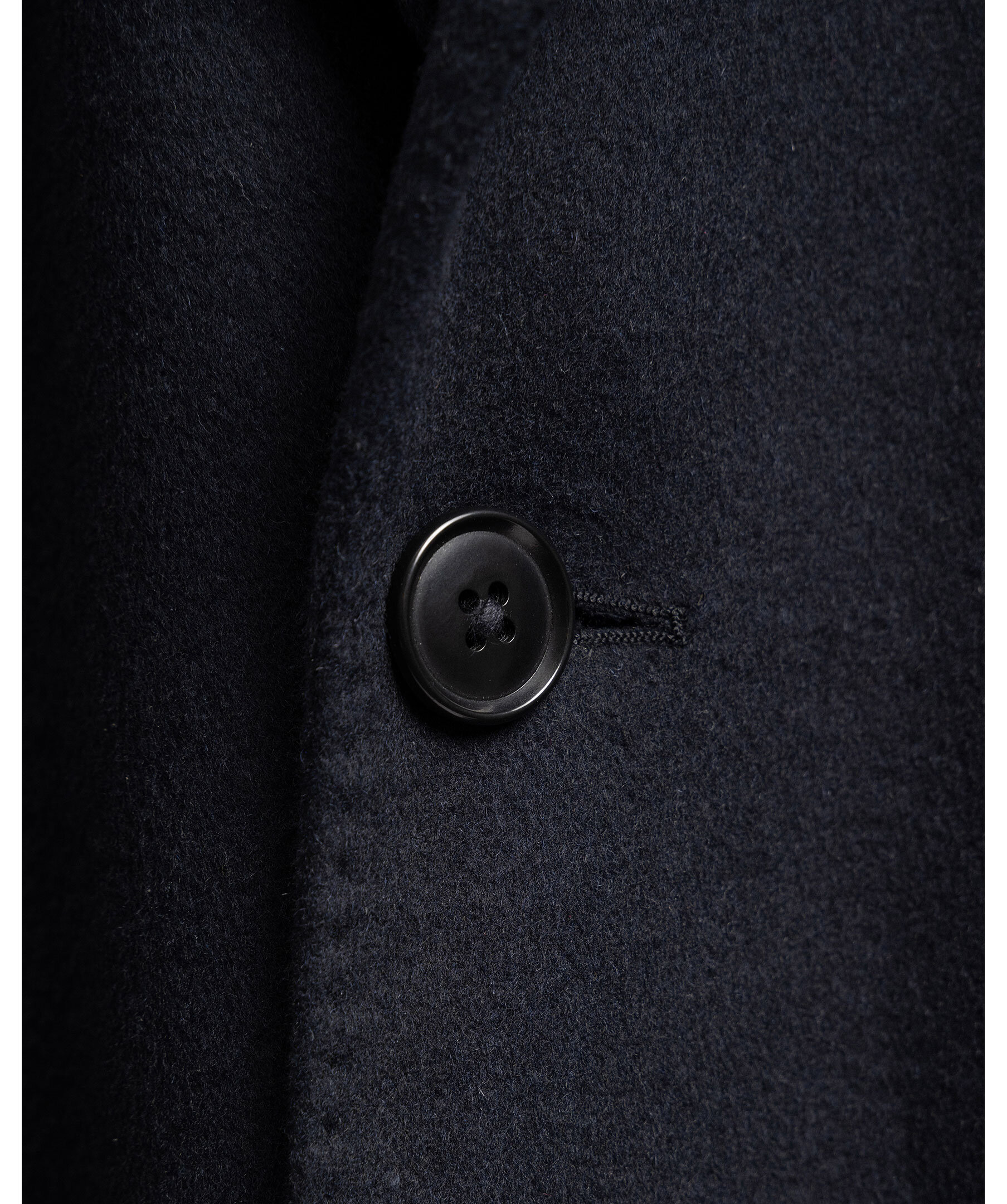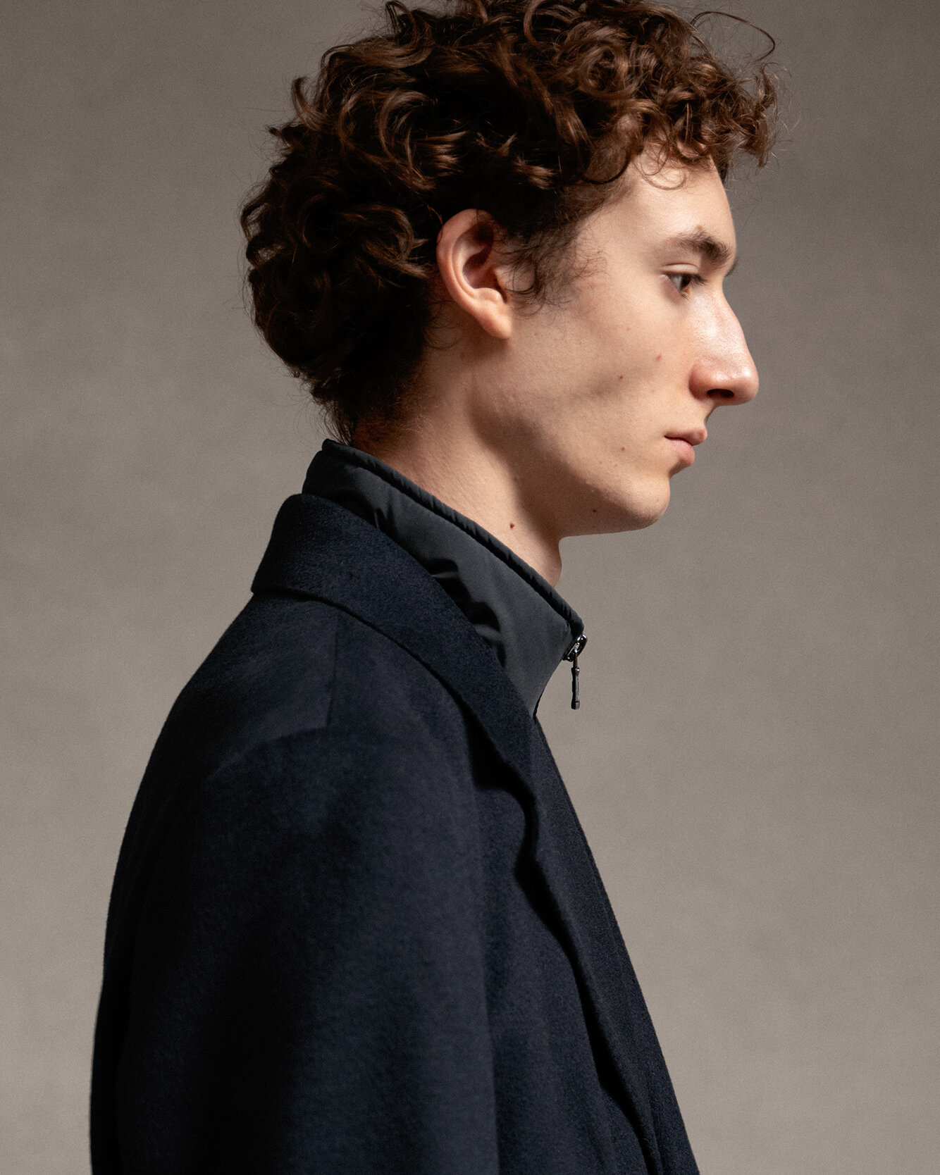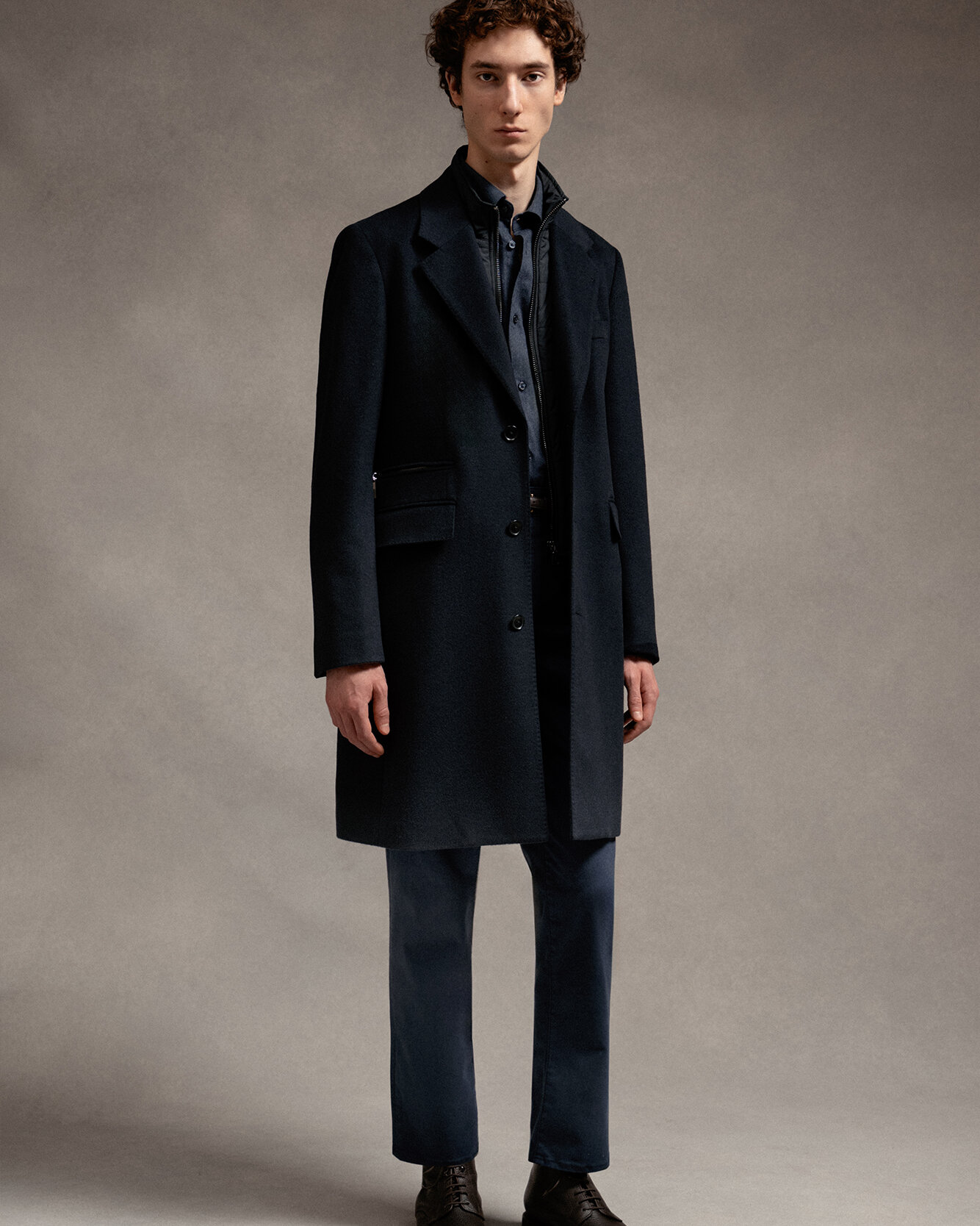 Elegant, enkelknäppt höst och vinter rock med klassisk krage i en mörkblå färg från varumärket 1797. Rocken har en inbyggd och avtagbar västfront, två sidfickor, en bröstficka samt en biljettficka med blixtlås. Tillverkad i en ullkashmirblandning.