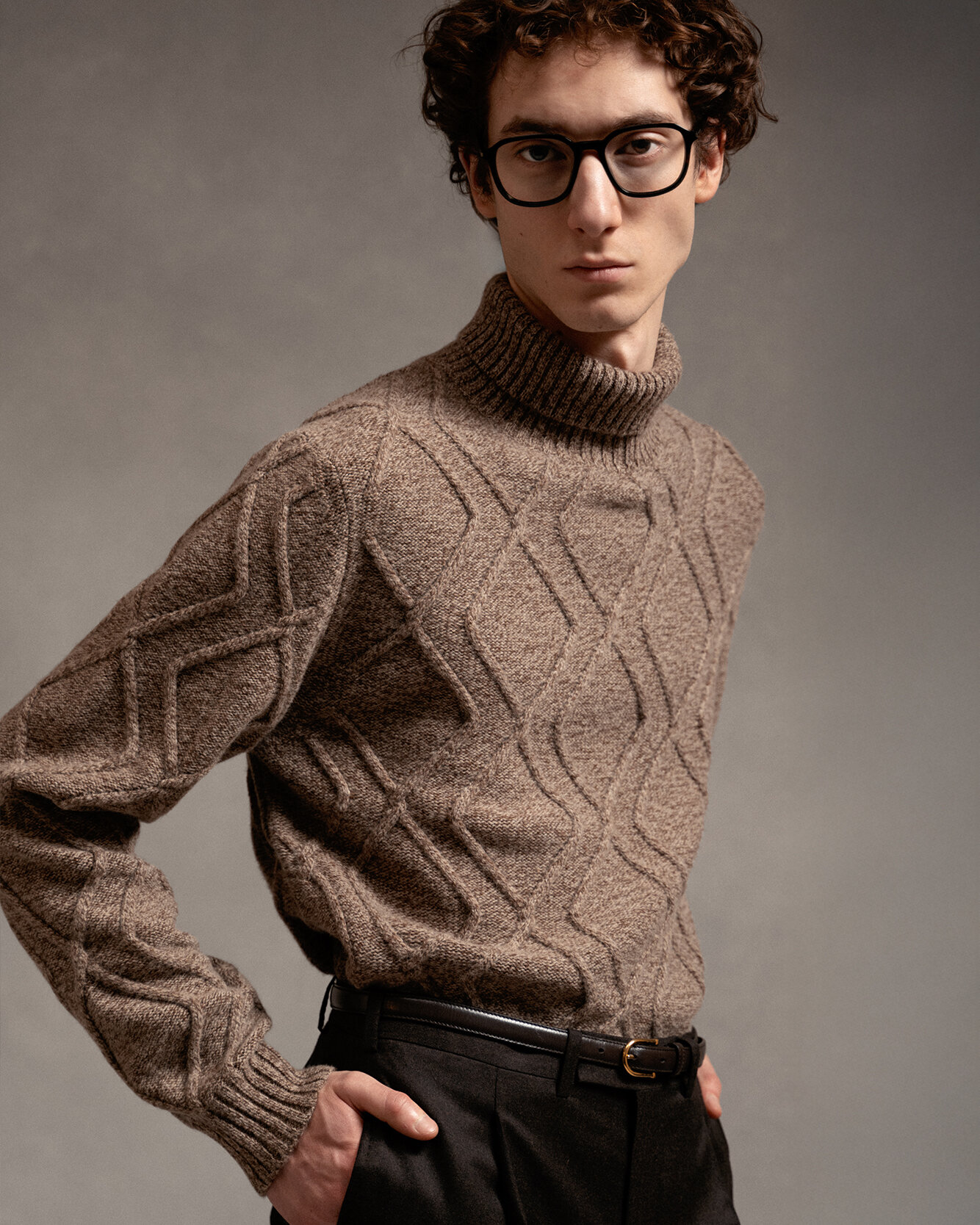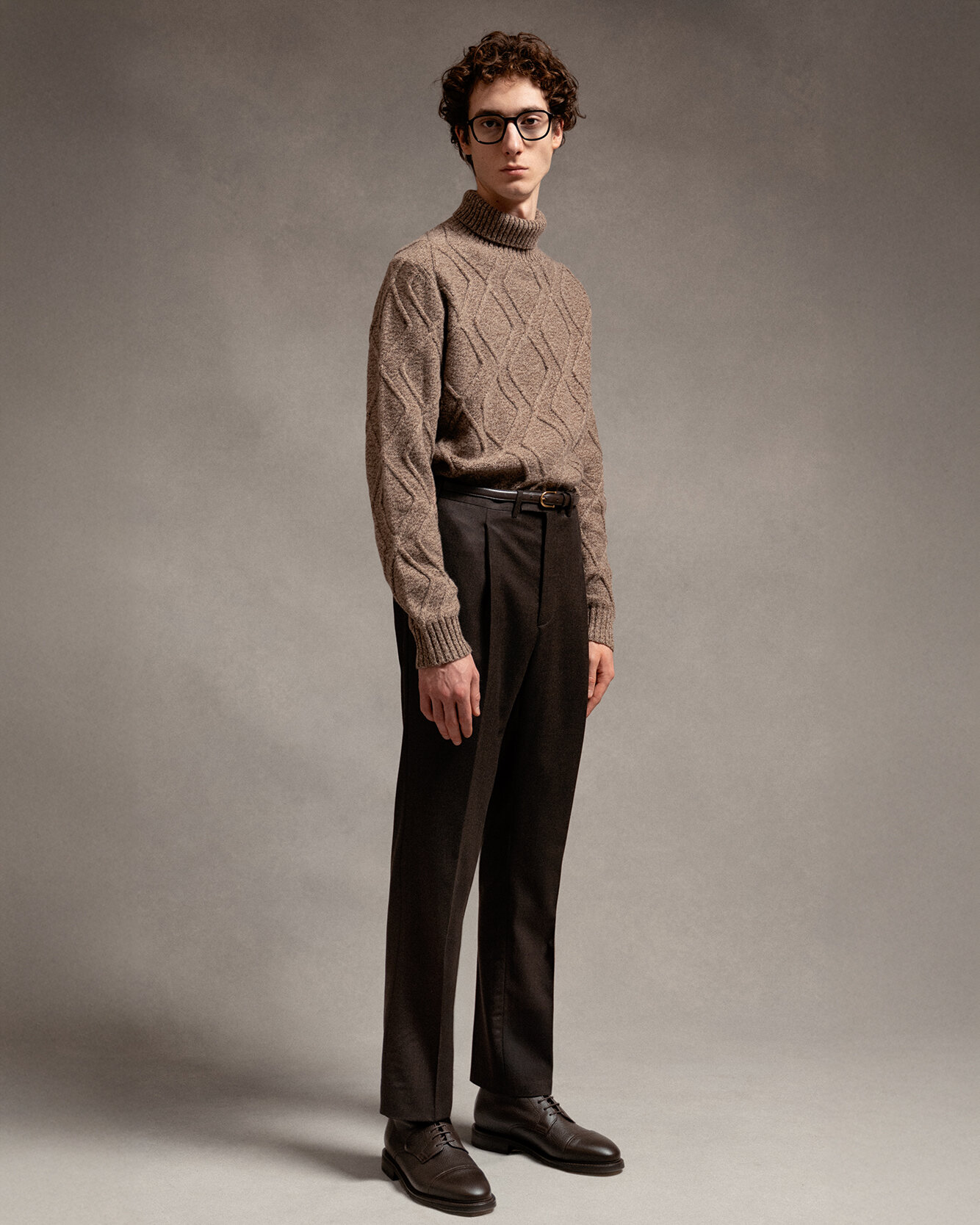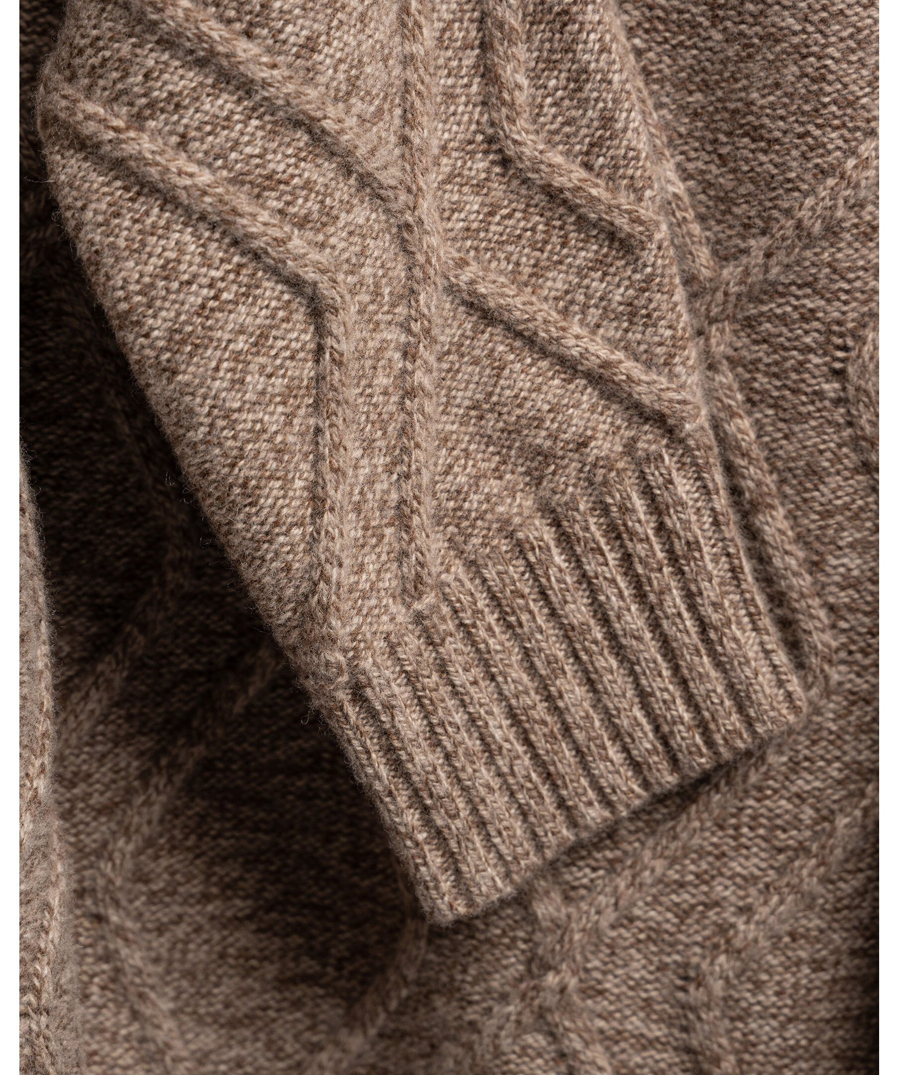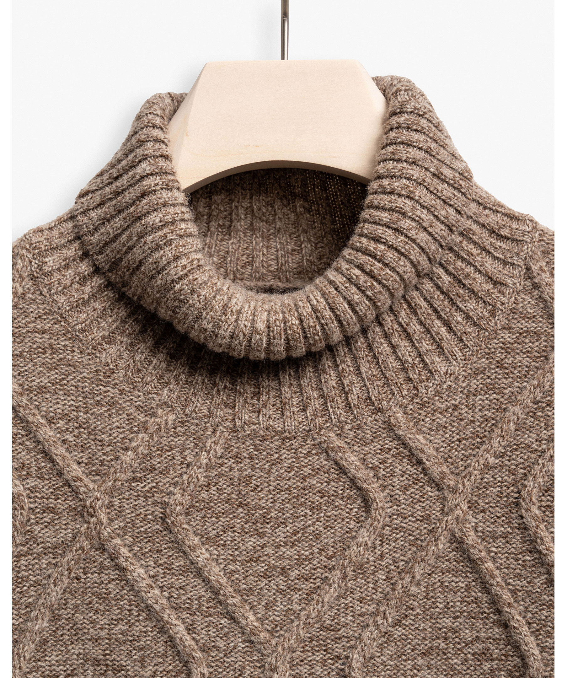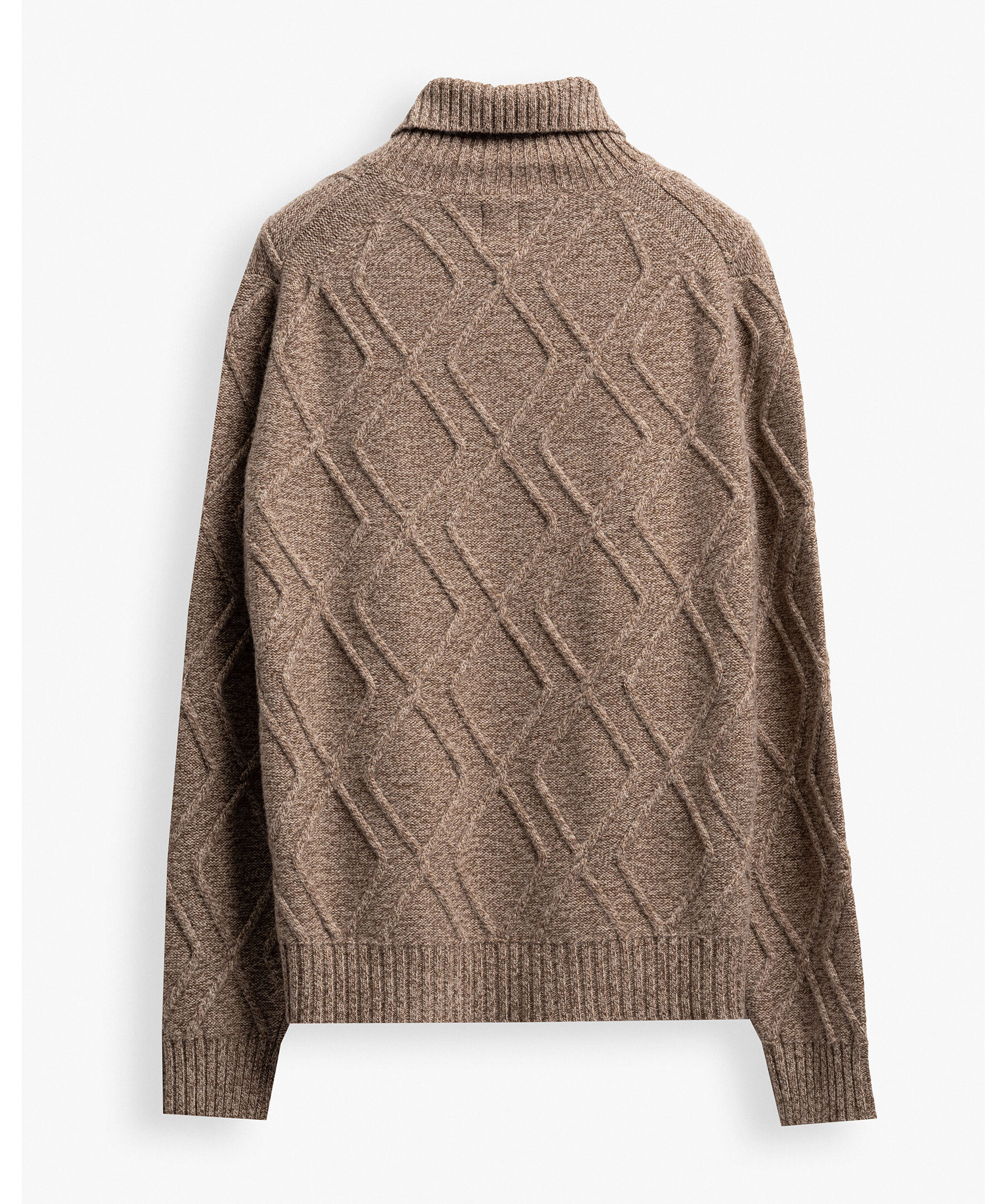 Melerad polotröja i brunt från varumärket 1797. Stickat med ett elegant diamantkabelmönster och ribbade muddar. Högkvalitativt Italienskt merinoull med extra mjuk känsla.