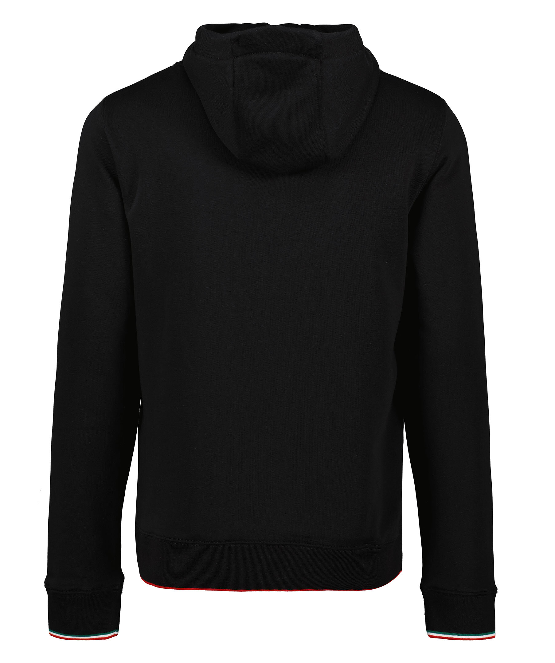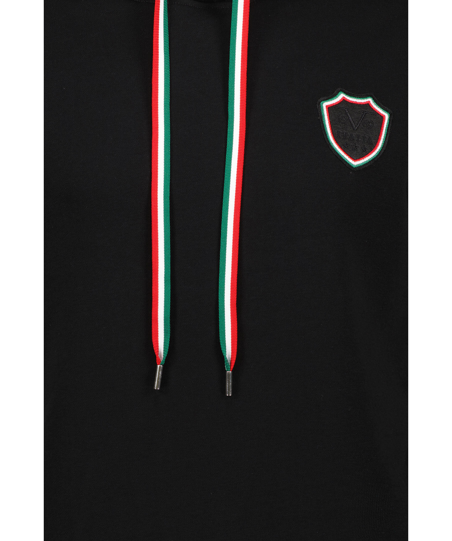 Svart hoodie från 19V69 Italia by Versace. Ribbstickad mudd vid ärm- och plaggslut med röda, gröna och vita ränder. Dragsko vid luvan med Röda, vita och gröna snören. Broderad patch på vänster bröst. Tillverkad i bomullsblandning.