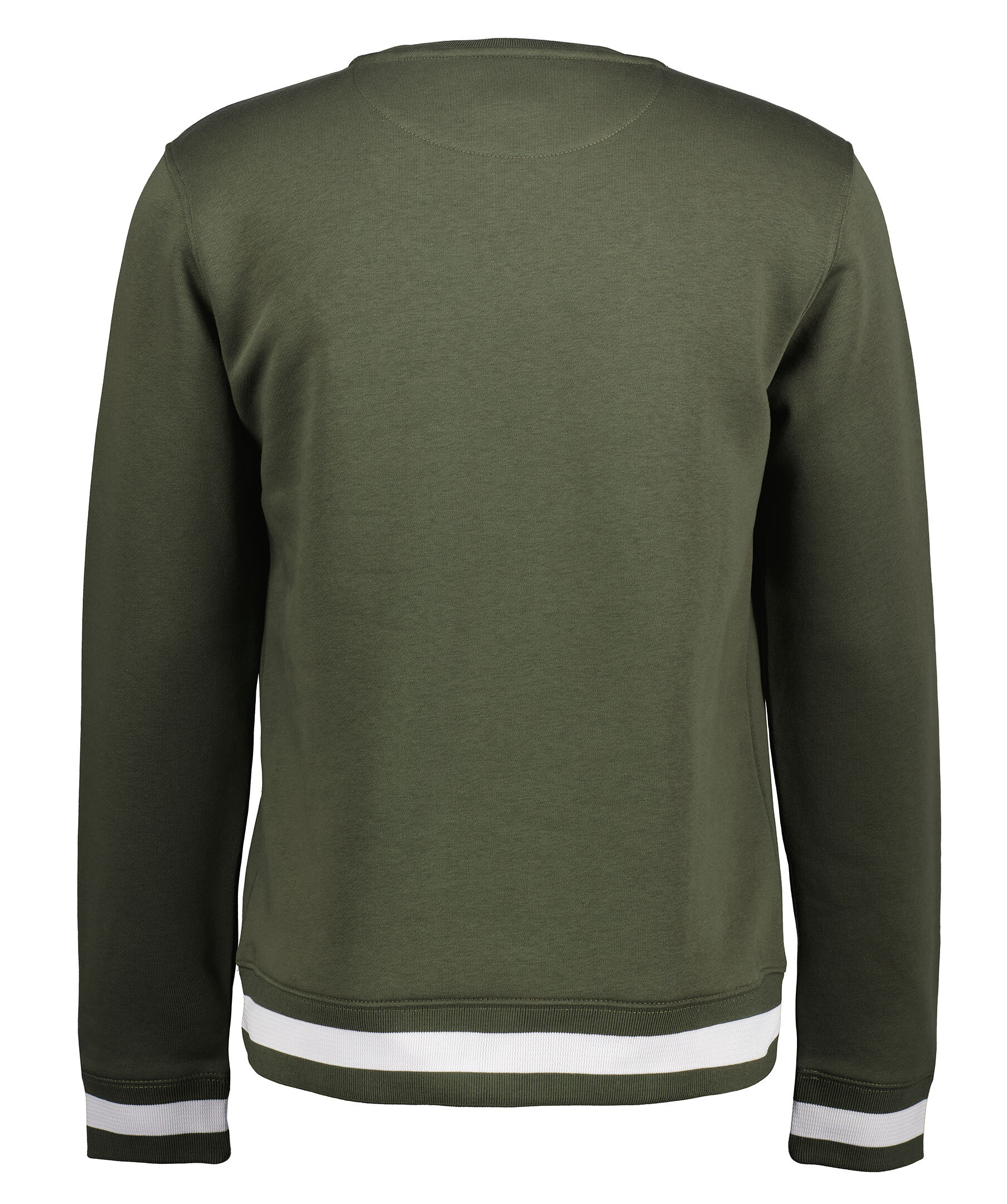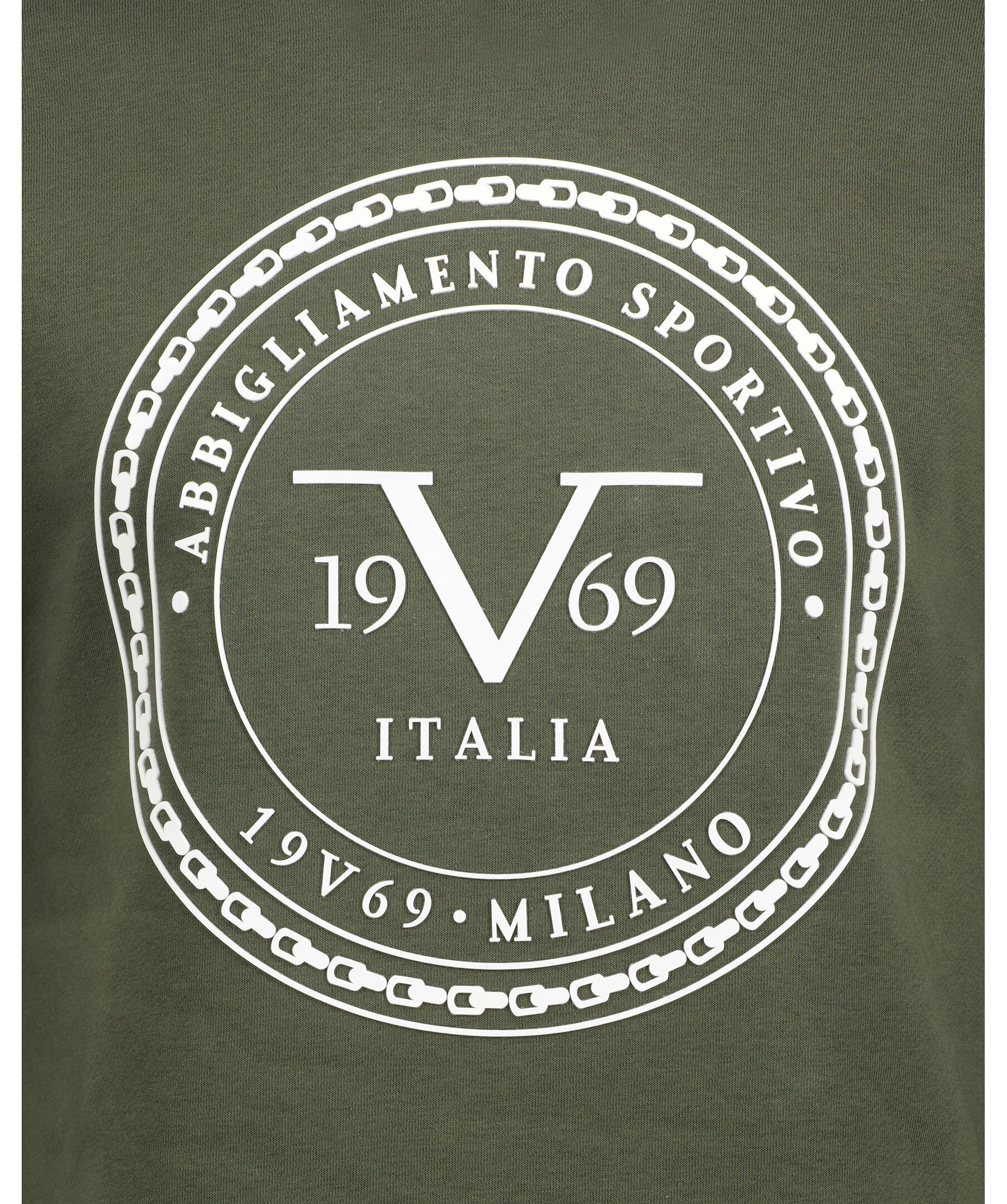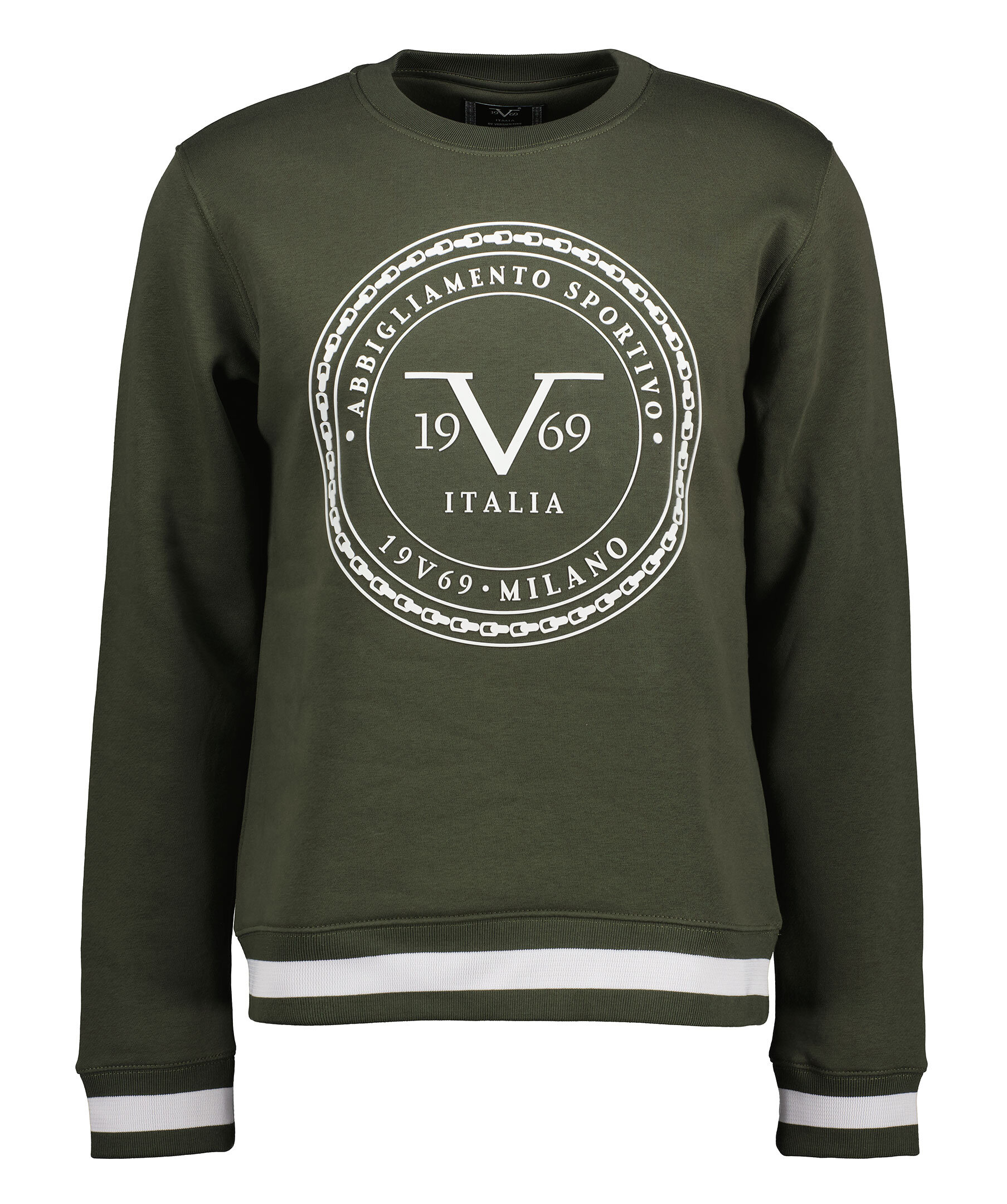 Militärgrön sweatshirt från 19V69 Italia by Versace. Tillverkad i en bomullsblandning. Präglad, stor, vit gummi-logotyp mitt på bröstet. Rundad halsring. Ribbade muddar med vit rand vid ärmslut samt plaggslut.