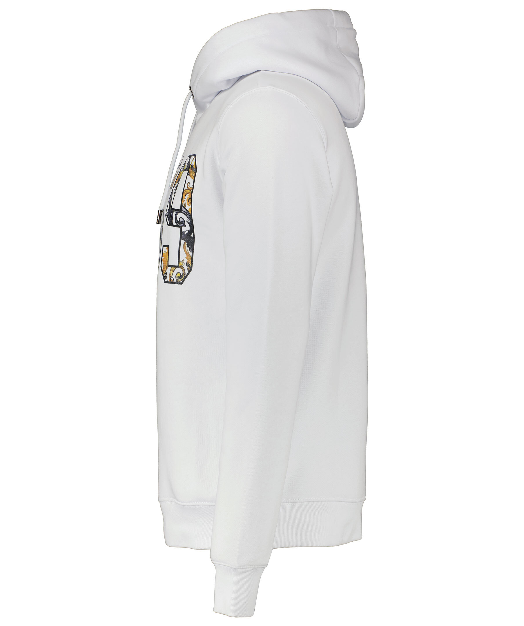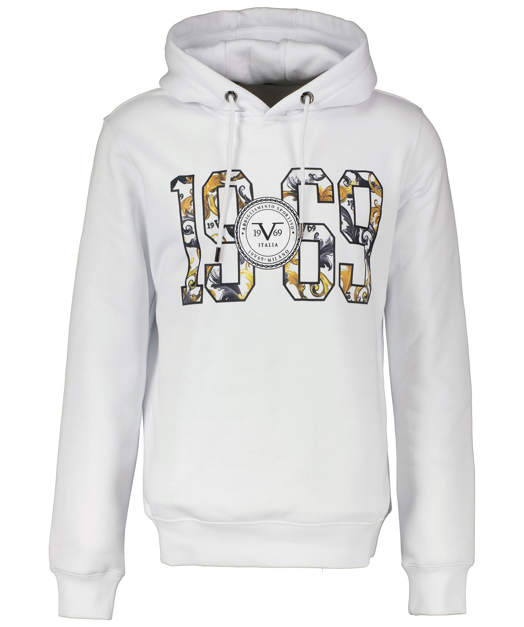 Vit hoodie från 19V69 Italia by Versace. Tillverkad i bomullsblandning och har en mjuk borstad insida. Stort logotyptryck och siffrorna 1969 med ett barock-inspirerat mönster över framsidan. Luva med snörning och ribbade muddar vid ärm och plaggslut.