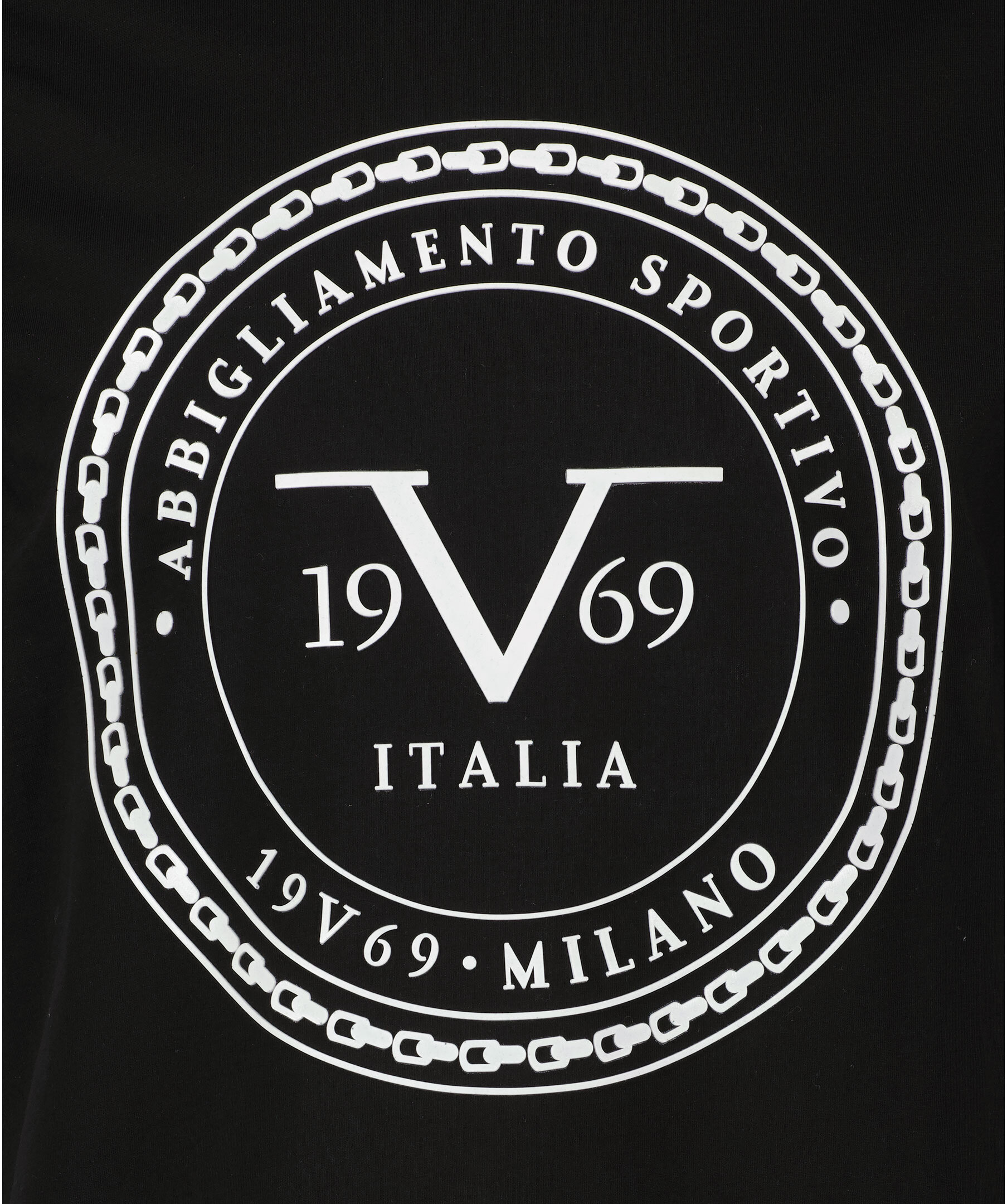Svart t-shirt från 19V69 Italia by Versace. Tillverkad i 100% bomull. Stor, vit logotyp mitt på bröstet. Rundad halsring.