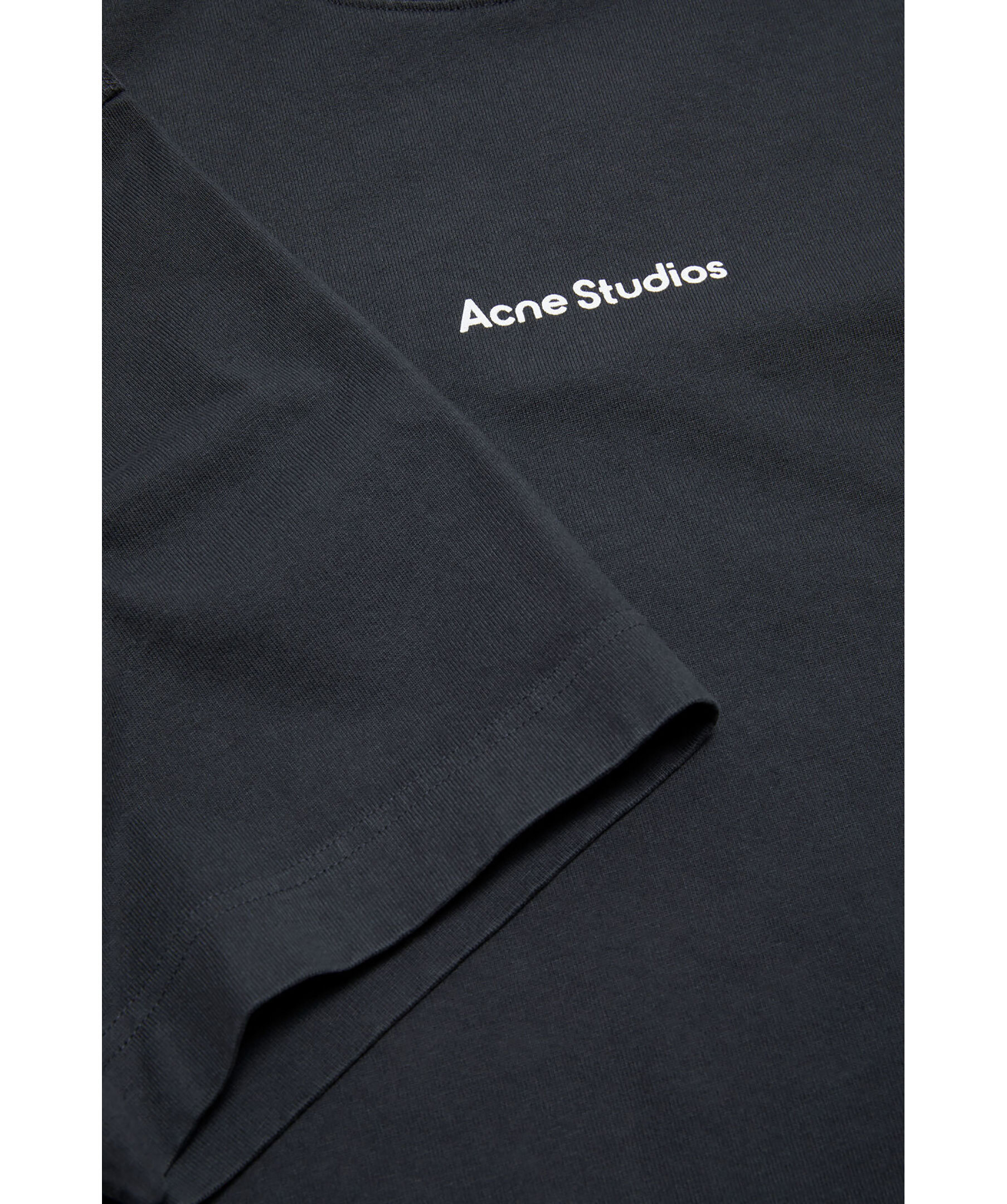 Svart T-shirt från Acne Studios. Rundad halsringning med ribbstickad mudd. Tryckt logotyp mitt på bröstet. Avslappnad passform. Tillverkad i 100% Bomull.