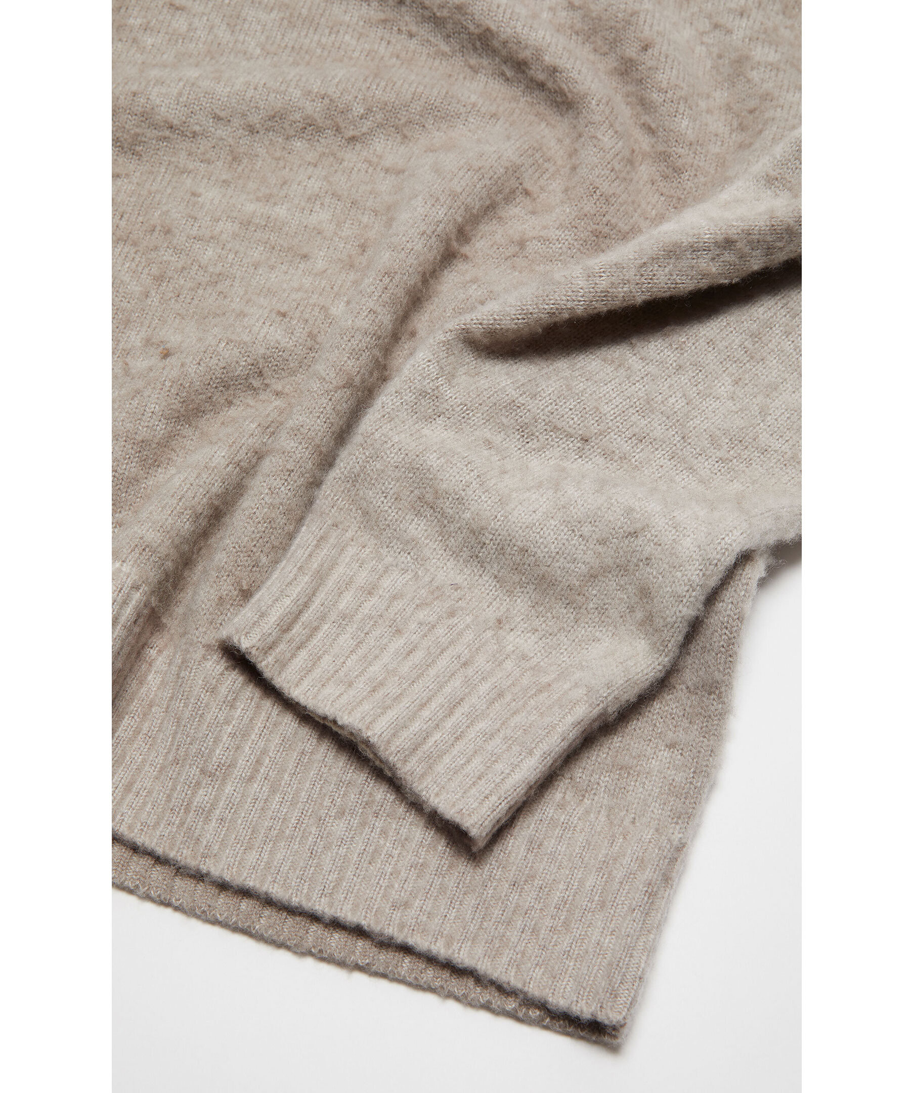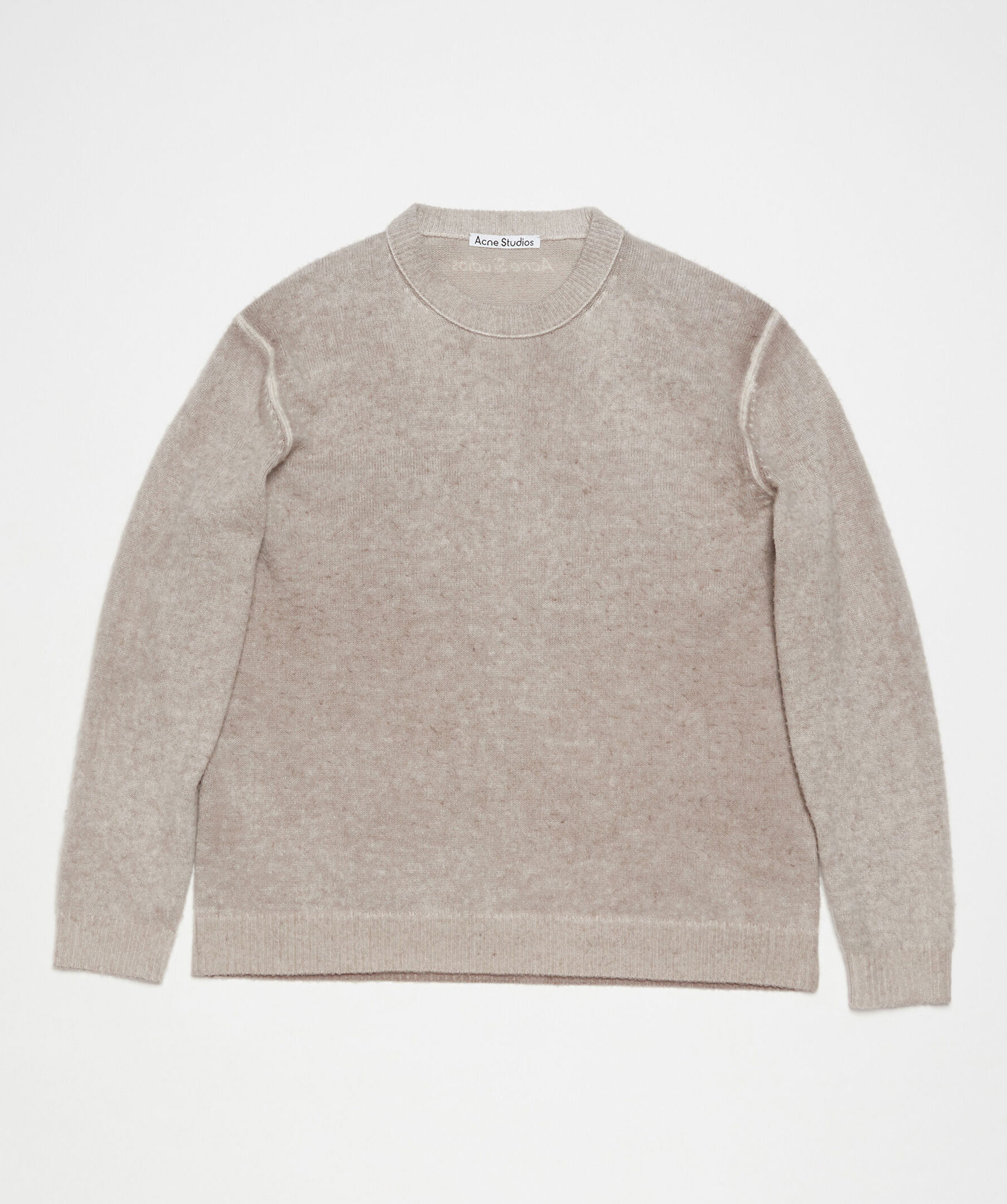 Beige stickad tröja från Acne Studios. Ribbstickade muddar vid ärm och plaggslut. Tillverkad i Ull och Kashmir blandning. Rundad halsringning. Logotyp i vitt i nacken.