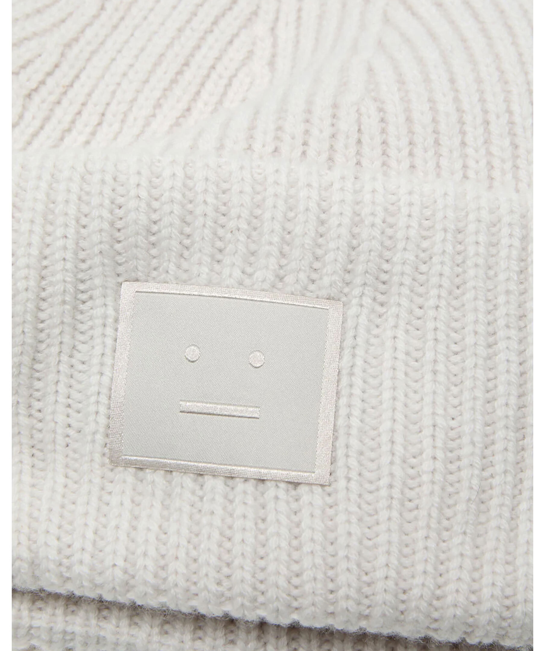 Ljusgrå, ribbstickad mössa från Acne Studios. Mössan har en bred, uppvikt kant samt deras signatur-smiley på framsidan. Tillverkad av noggrant utvalt yakgarn av hög kvalitet.