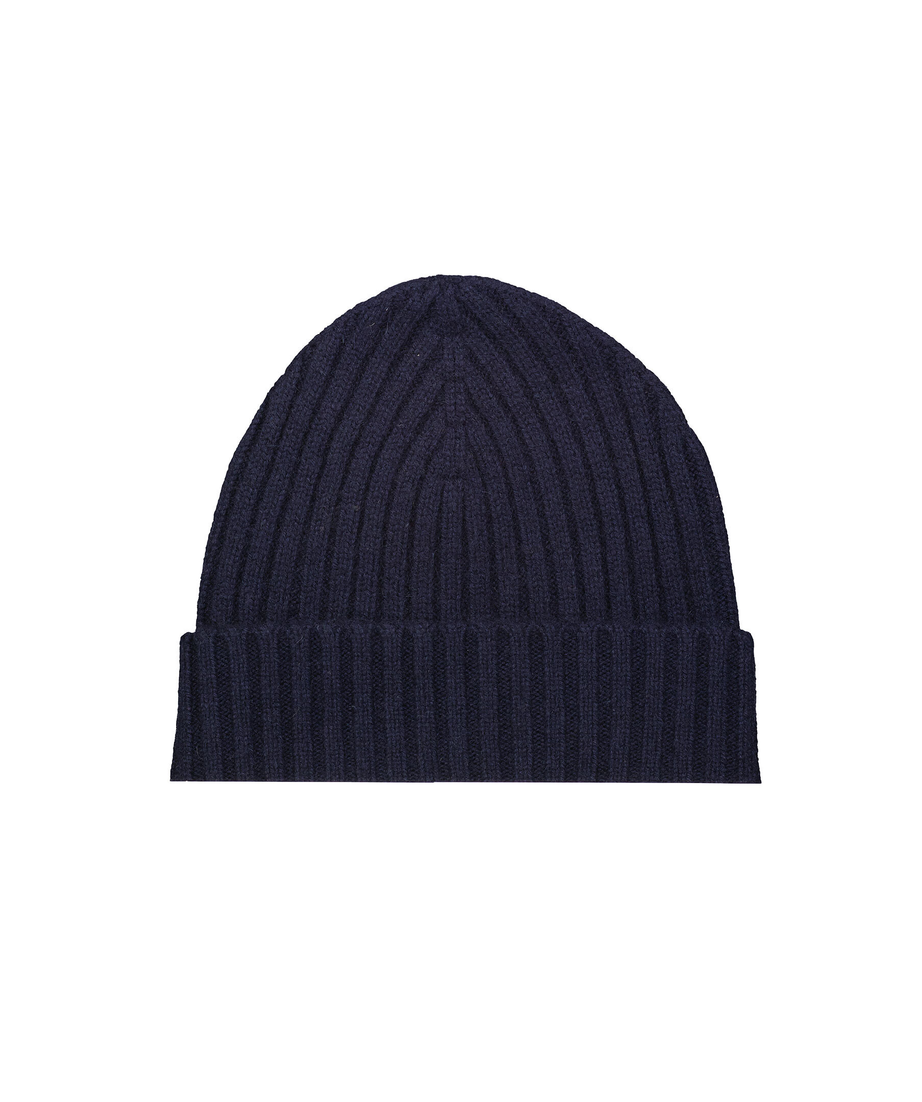 Mörkblå, ribbstickad mössa med uppvikt kant från Amanda Christensen. Tillverkad i 100% kashmir.