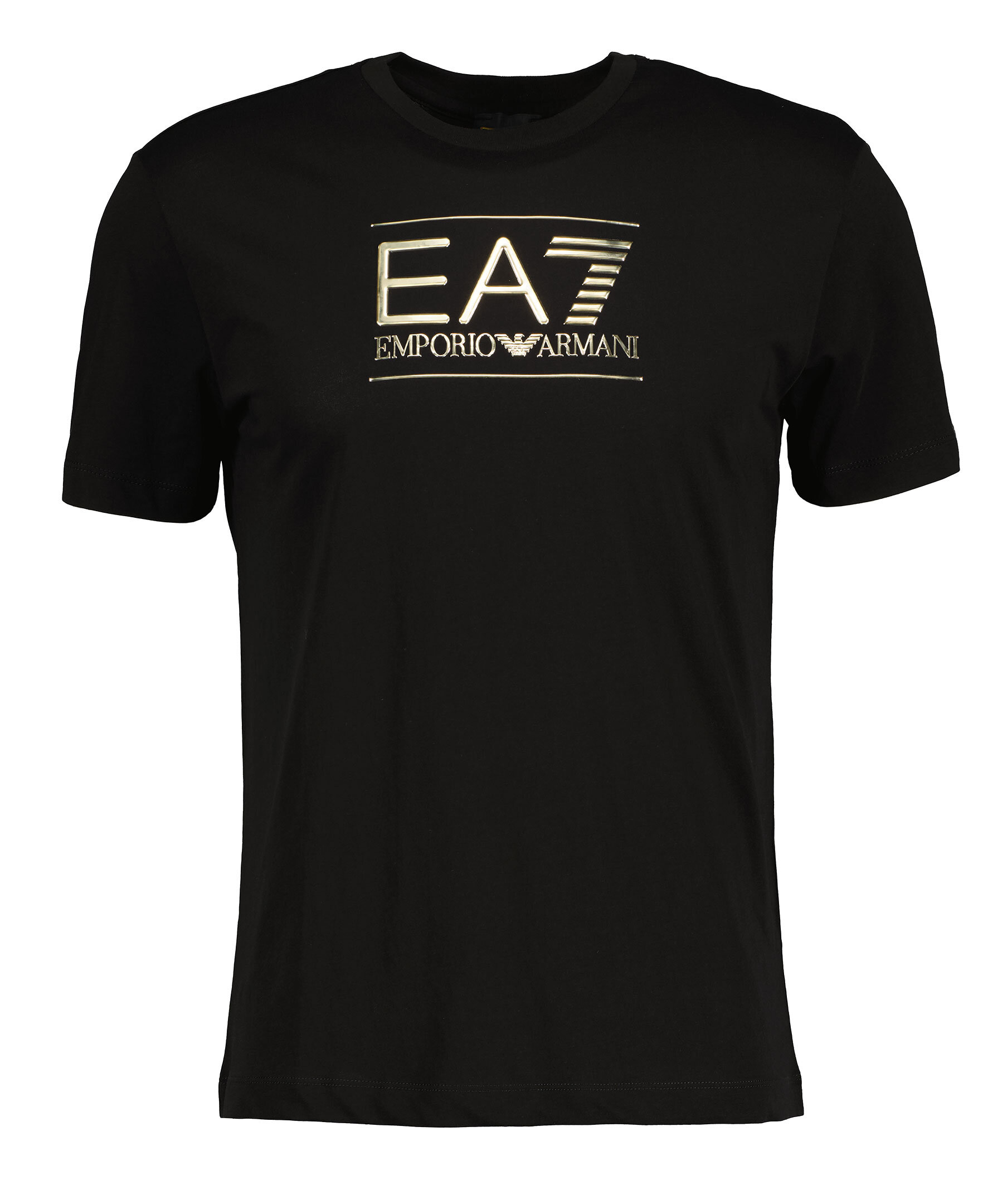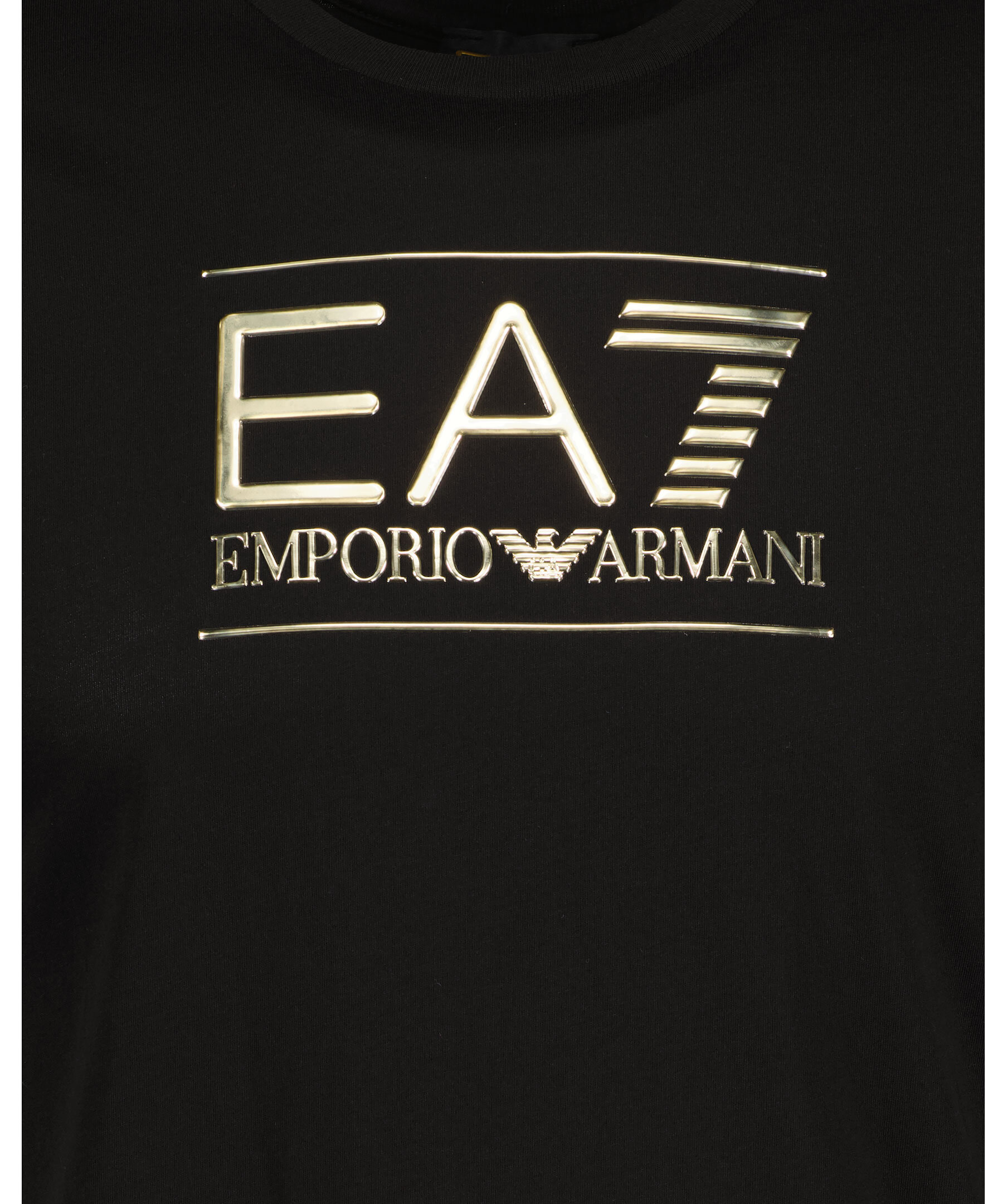 Svart t-shirt från Armani EA7. Tillverkad i 100% bomull. Tröjan har en stor, präglad, guldig logotyp på framsidan.