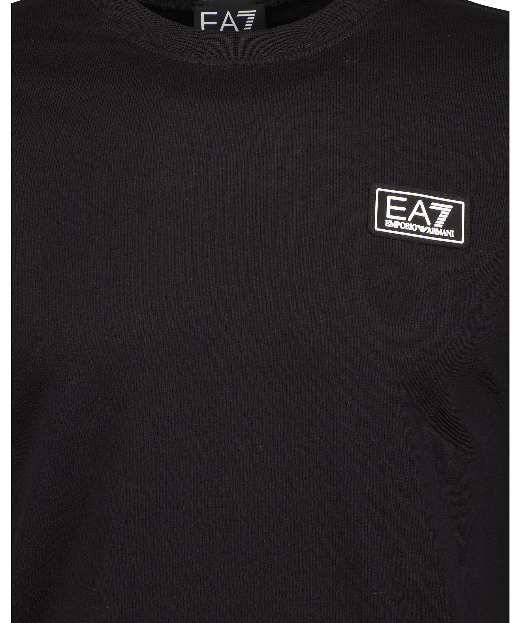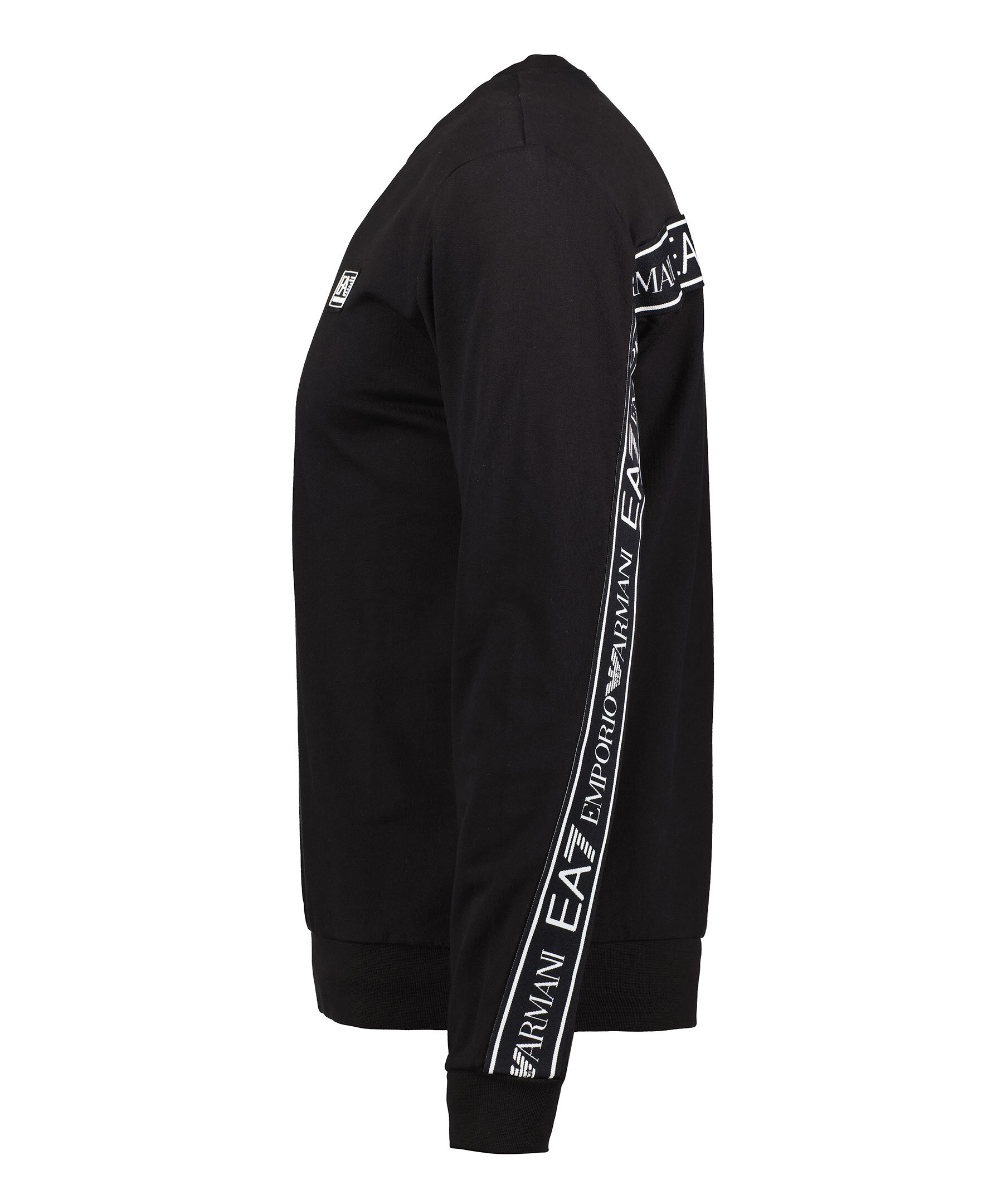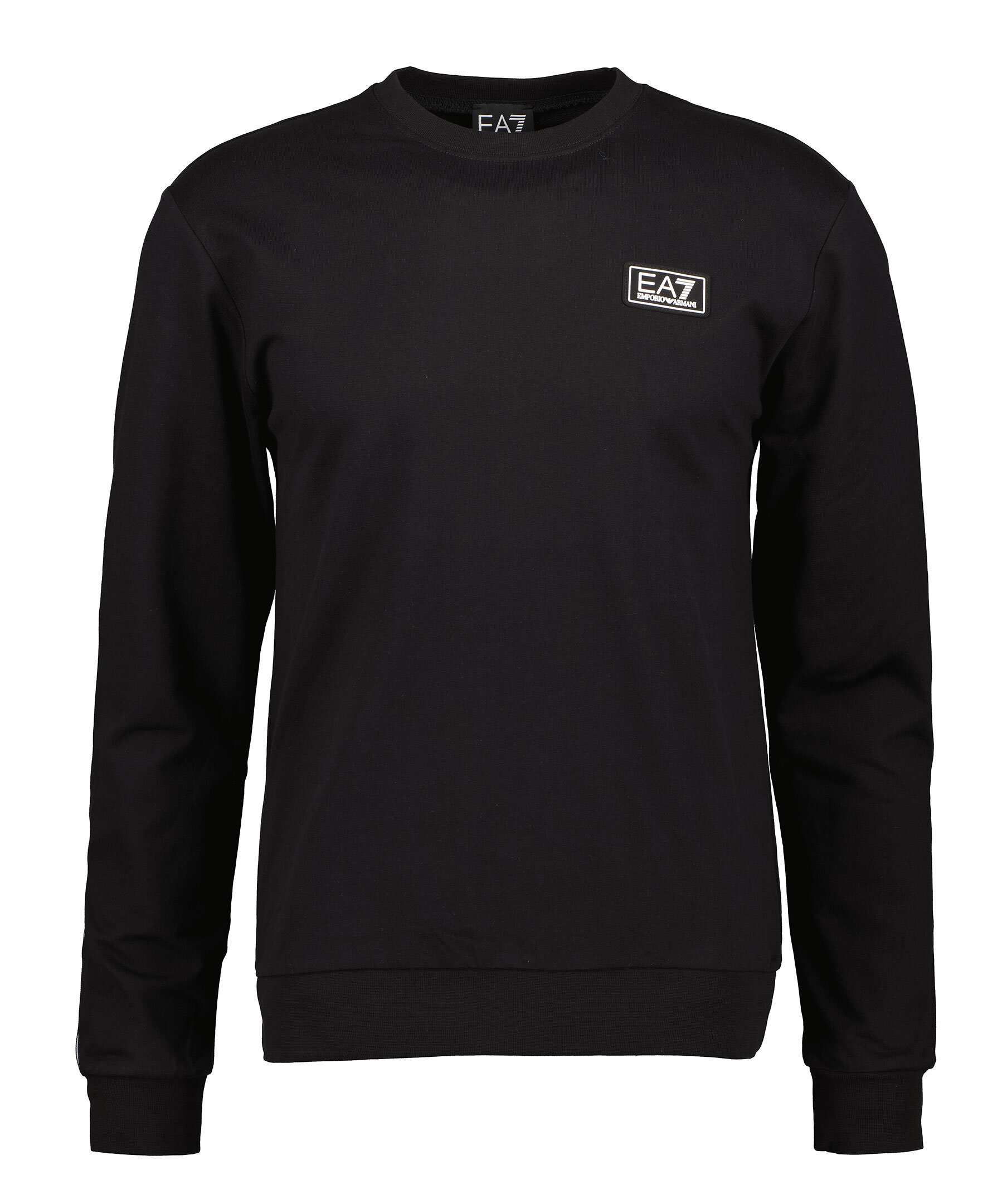 Svart sweatshirt från Armani EA7. Tillverkad av 100% bomull. Tröjan har vita logotyp-revärer på ärmarna och över ryggen samt gummerad logotyp på bröstet. Ribbstickad halsringning samt ärm-och plaggslut.