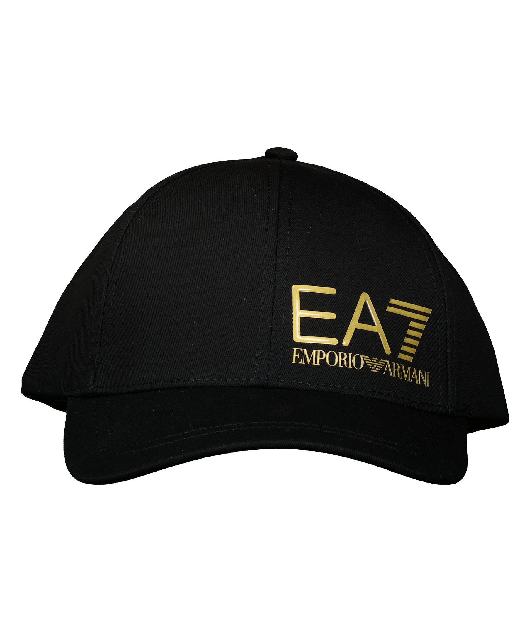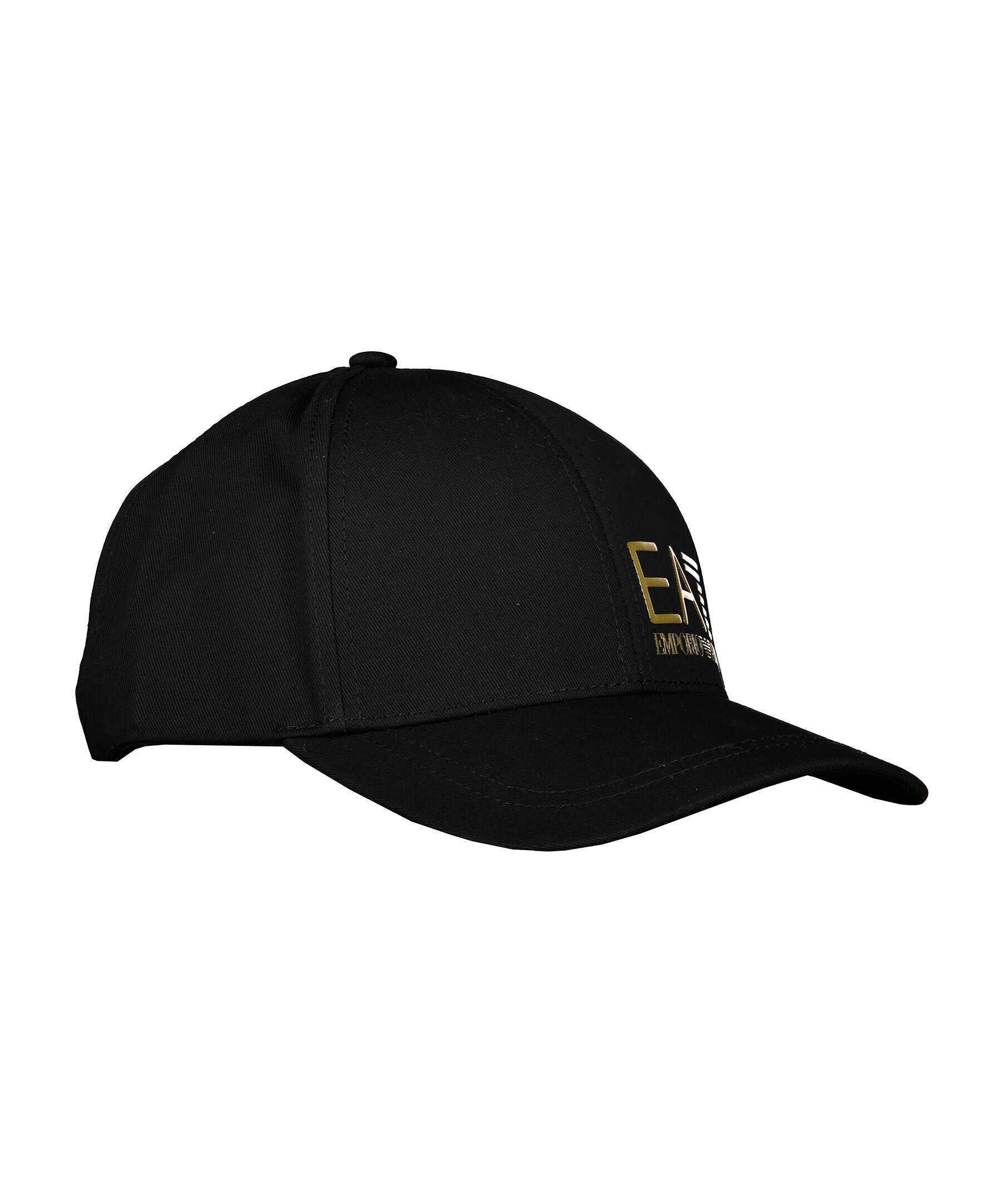 Svart keps fån Armani EA7. Guldig logotyp på framsidan. Justerbart spänne baktill. Tillverkad i 100% bomull.