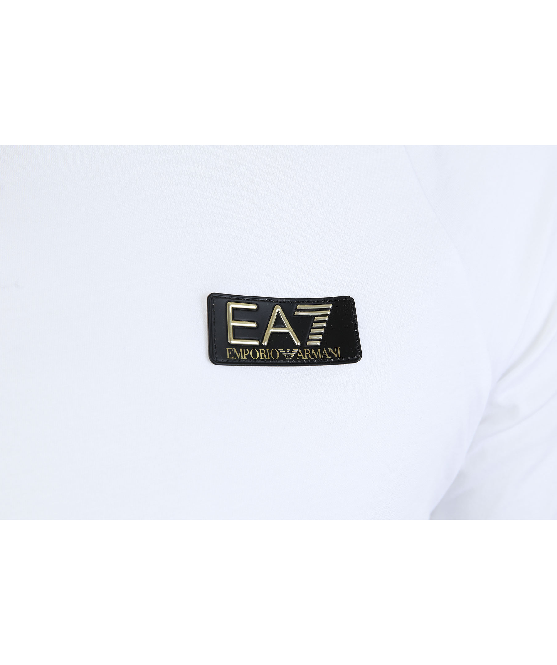 Vit t-shirt från Armani EA7. Liten, svart patch med guldfärgad logotyp på sidan av bröstet. Har rundad halsringning och är tillverkad i 100% bomull.