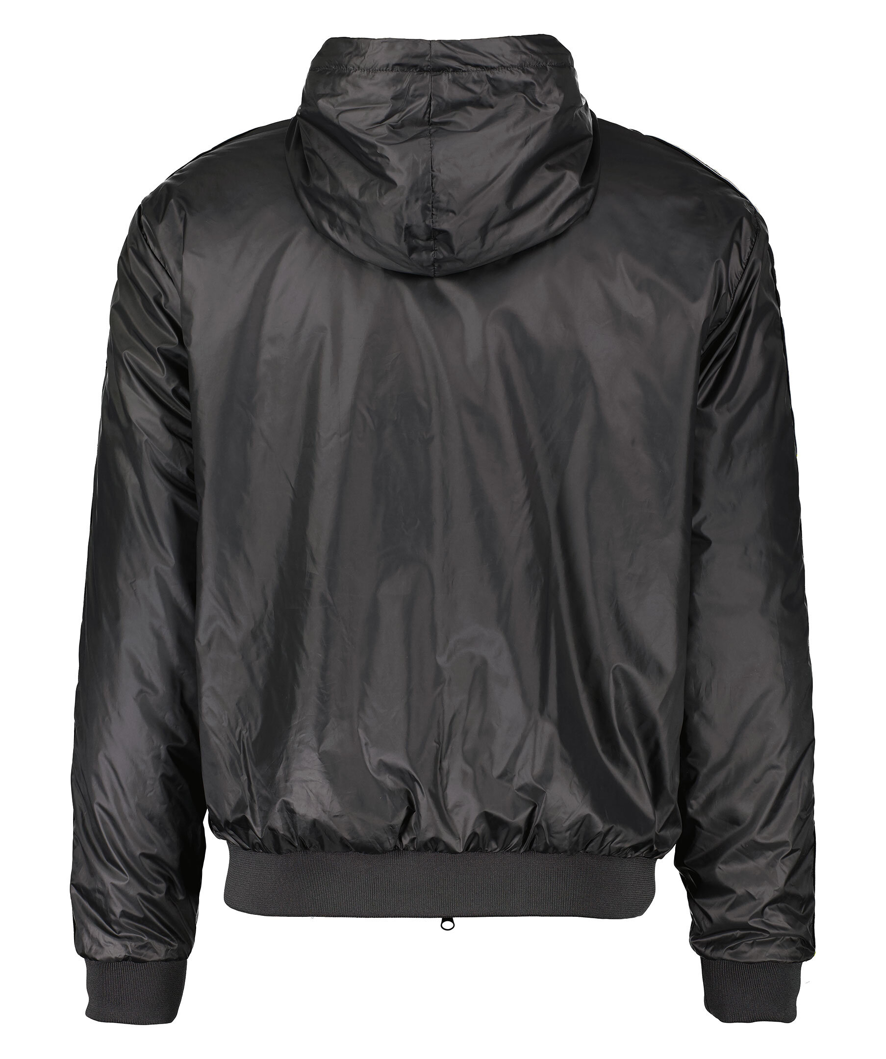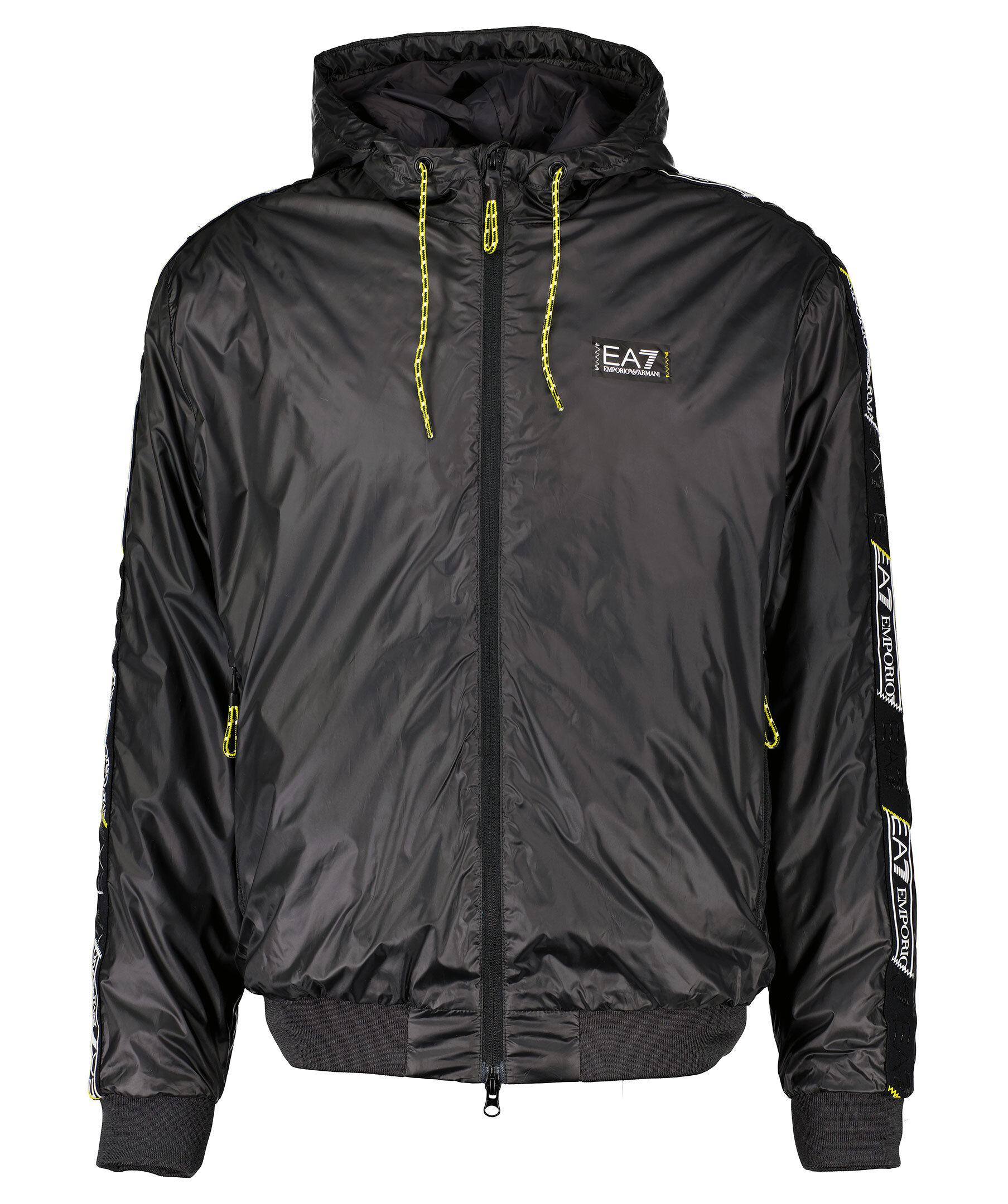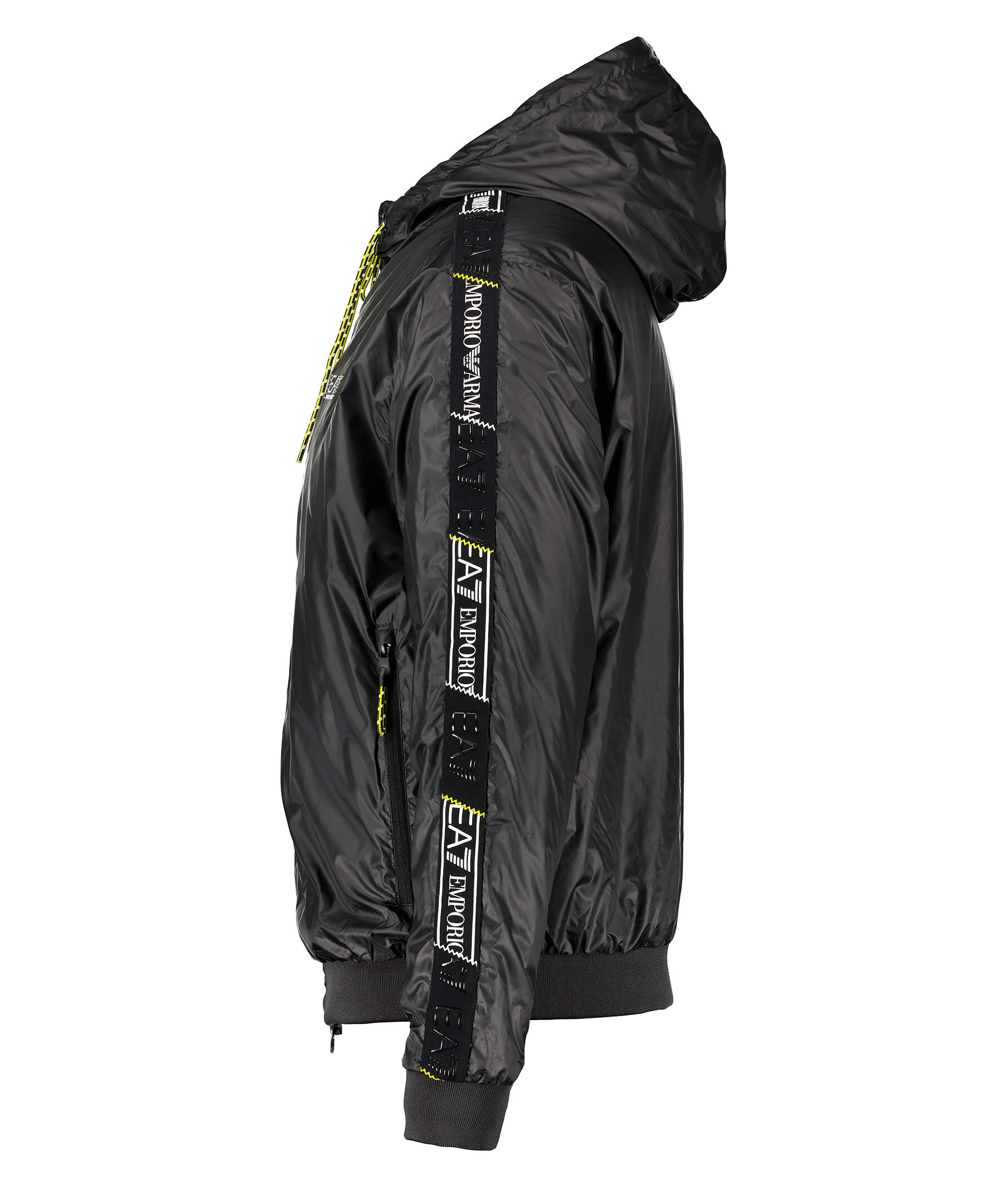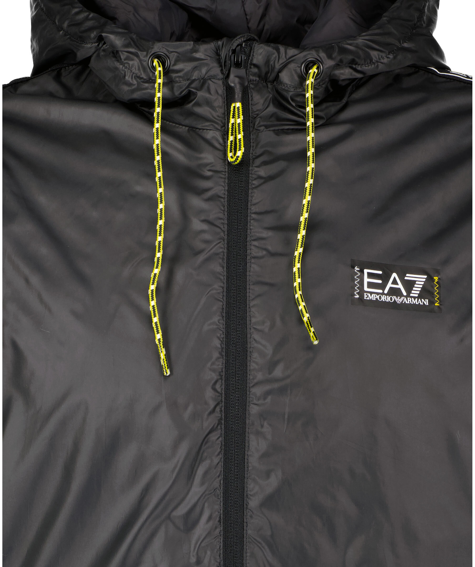 Mörkgrå vindjacka med luva och tunn fyllning i polyester från Armani EA7. Stängs med tvåvägsdragkedja framtill, har en hög krage och luva med gulmönstrad snörning. Svarta revärer med svarta och vita gummerade logotyper. Tryckt logotyp på vänster bröst och fint ribbade muddar vid ärm- och plaggslut. Två framfickor och en innerficka, alla stängs med dragkedja.