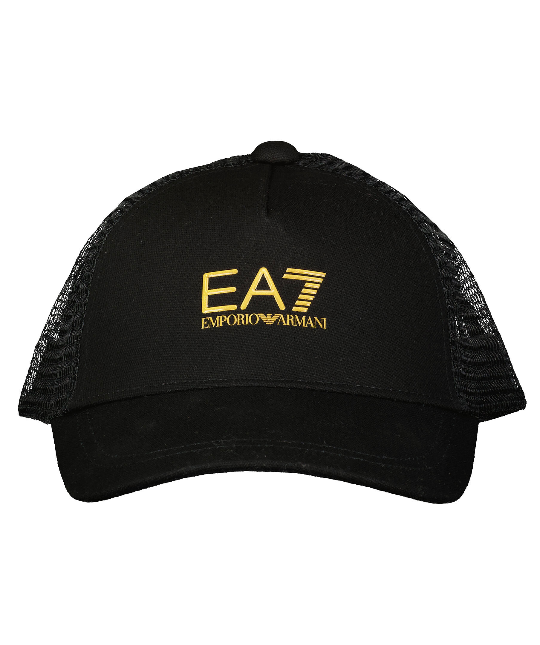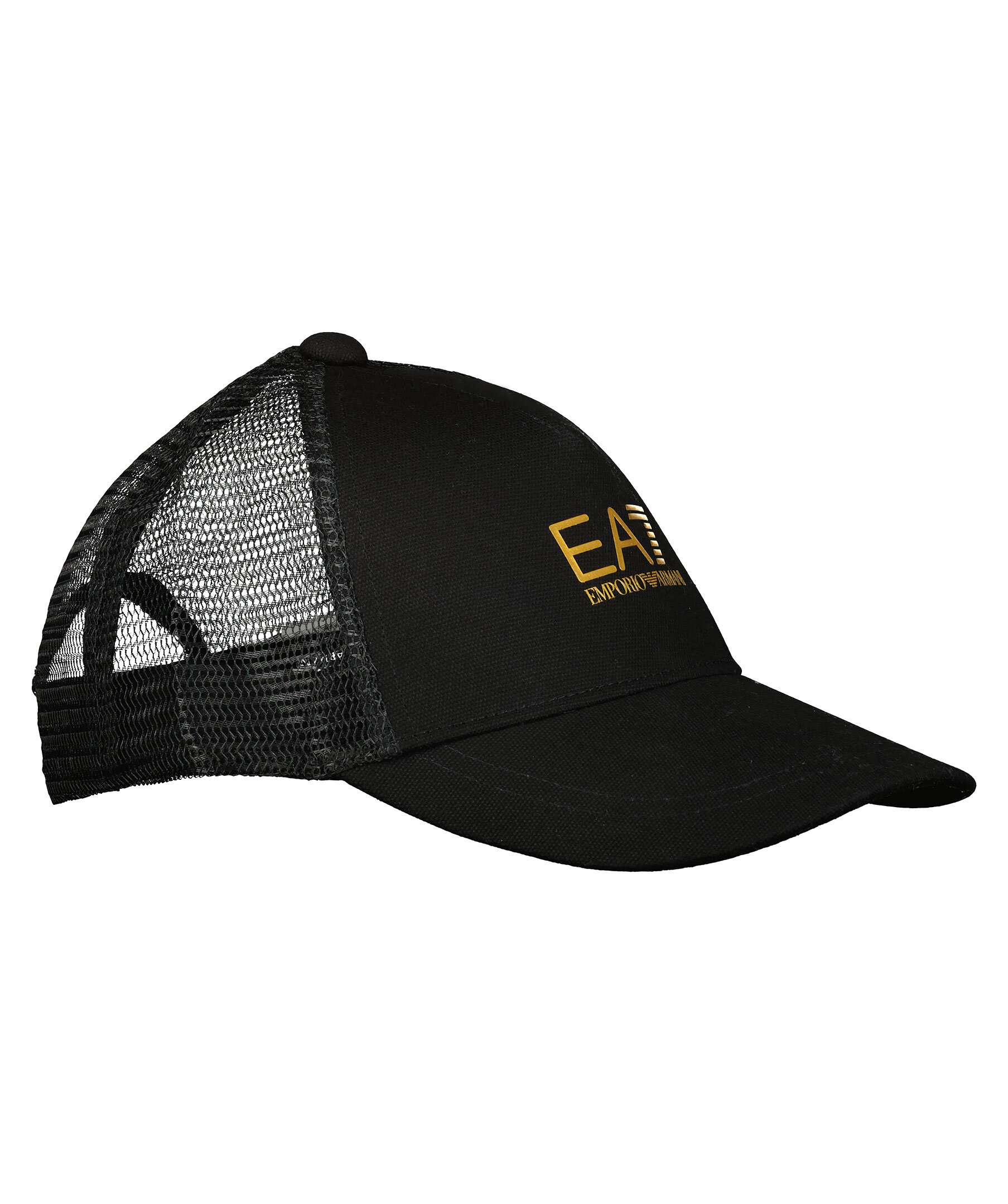 Svart keps i trucker-basebollmodell från Armani EA7. Gjord i bomull och har ett nätparti baktill. Guldfärgad logotyp på framsidan och ett justerbart snap-in-rem.