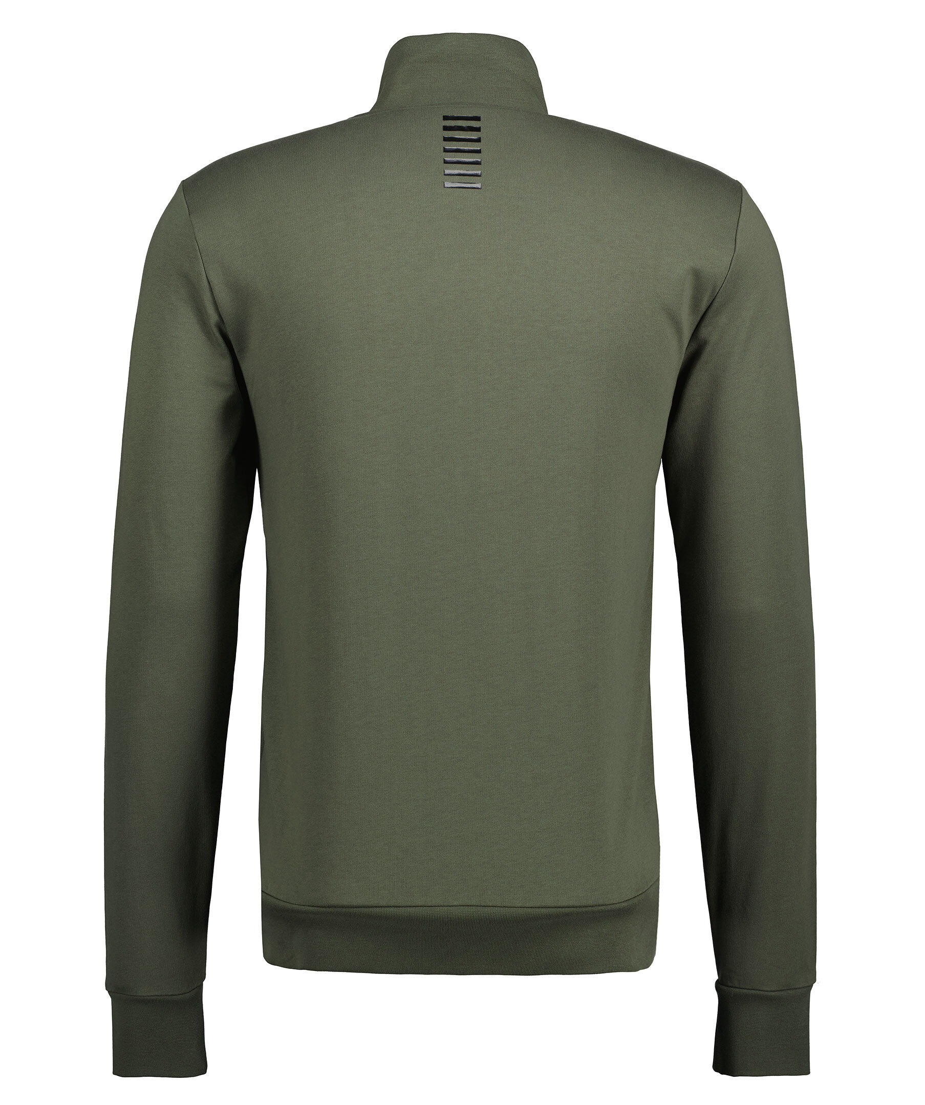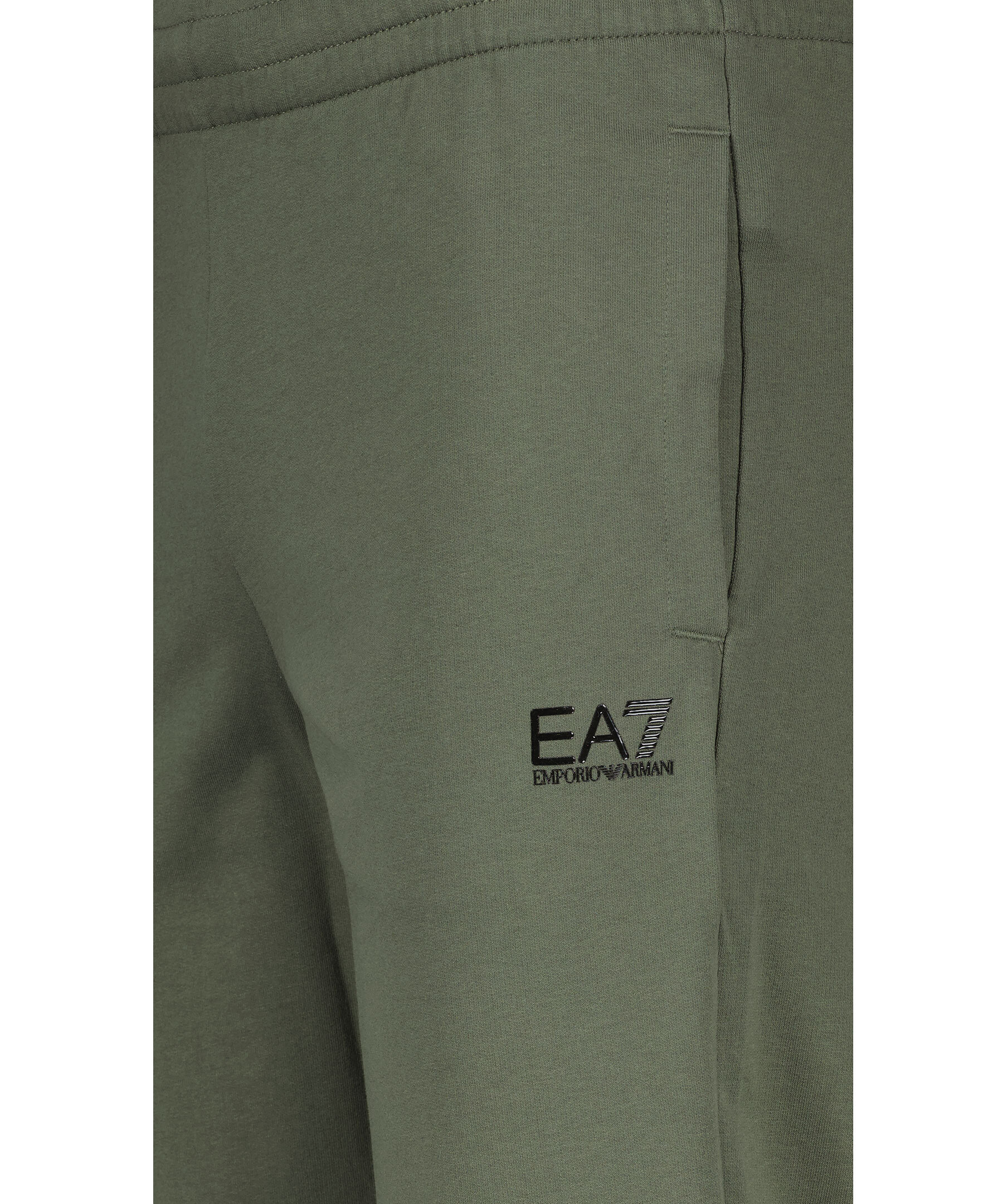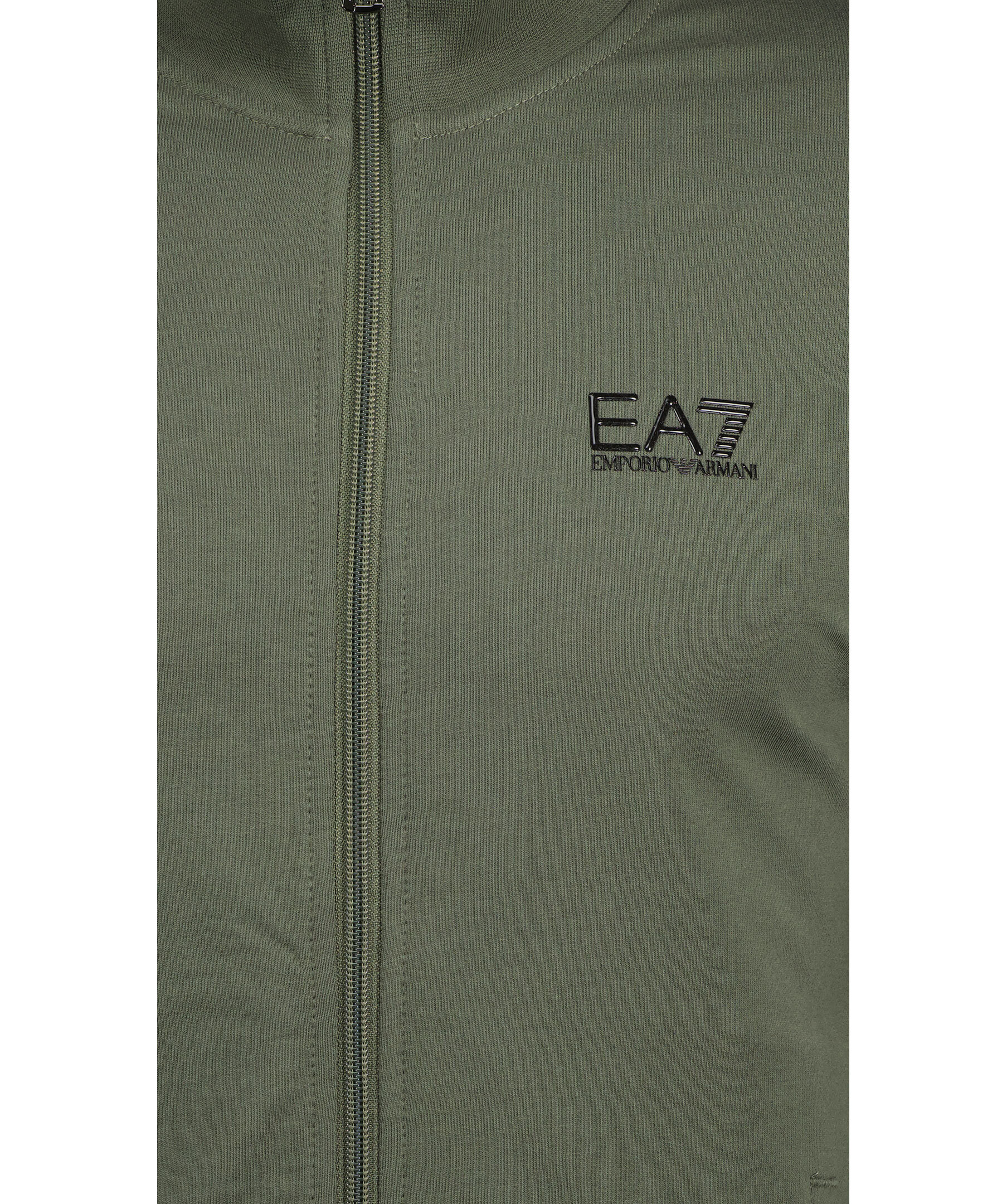 Mörkgrönt tracksuit set från Armani EA7. Tillverkad av mjuk bomull. Den består av en sweatshirt med stativkrage, hel dragkedja, två sidfickor, resårkanter och gummerad, svart logotyp. Tillsammans med tröjan kommer joggingbyxor med dragsko i midjan, två sidfickor och gummerad, svart logotyp på ena benet.