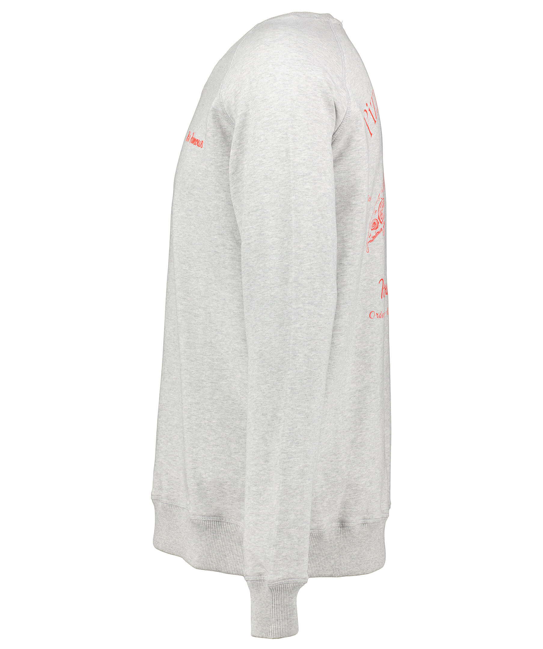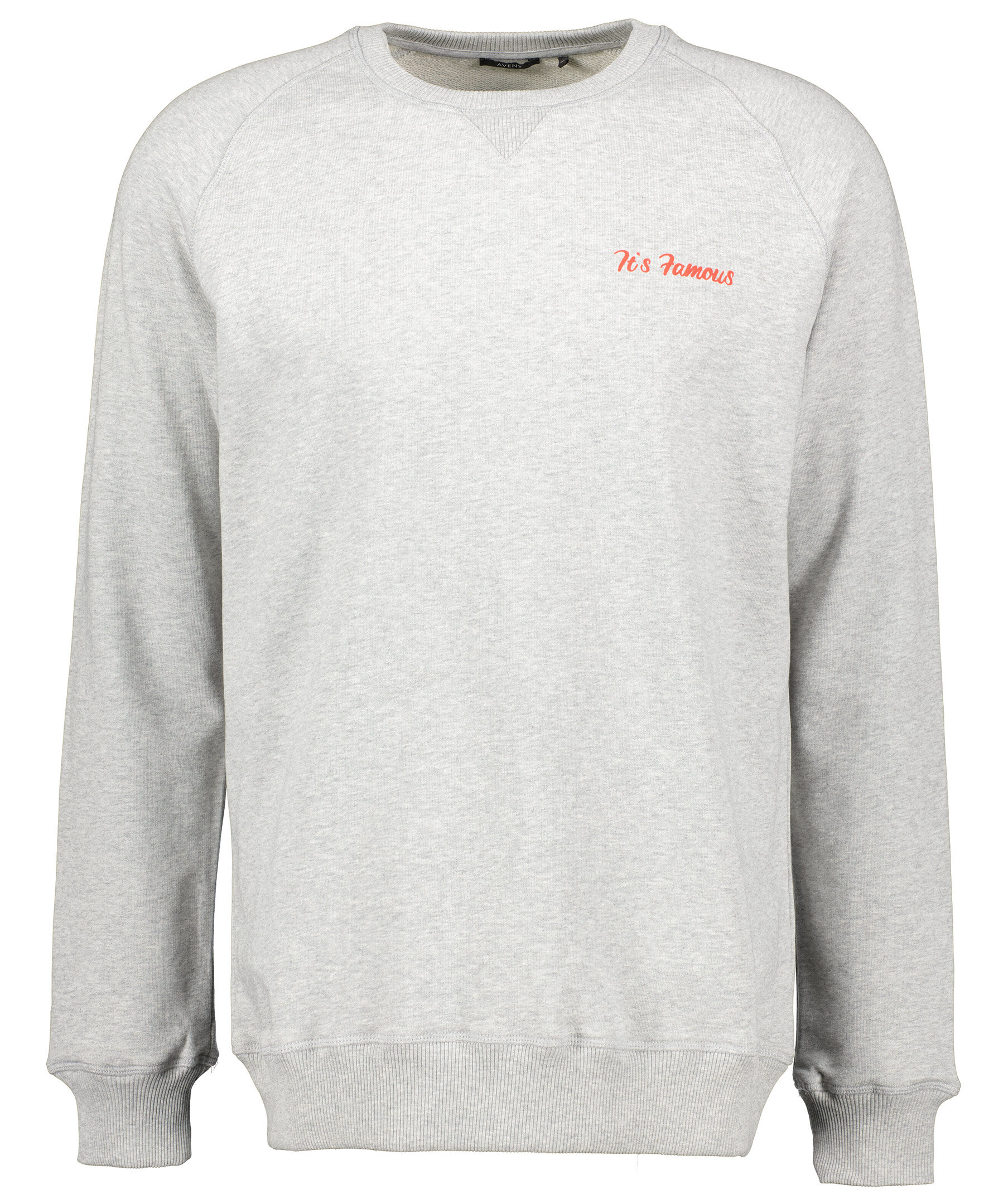 Grå sweatshirt från Aveny. Rundad halsringning. Ribbstickad mudd vid ringningen, ärm- och plaggslut. Tryck i rött på vänster bröst, och baktill över ryggen. Tillverkad i 100% bomull.