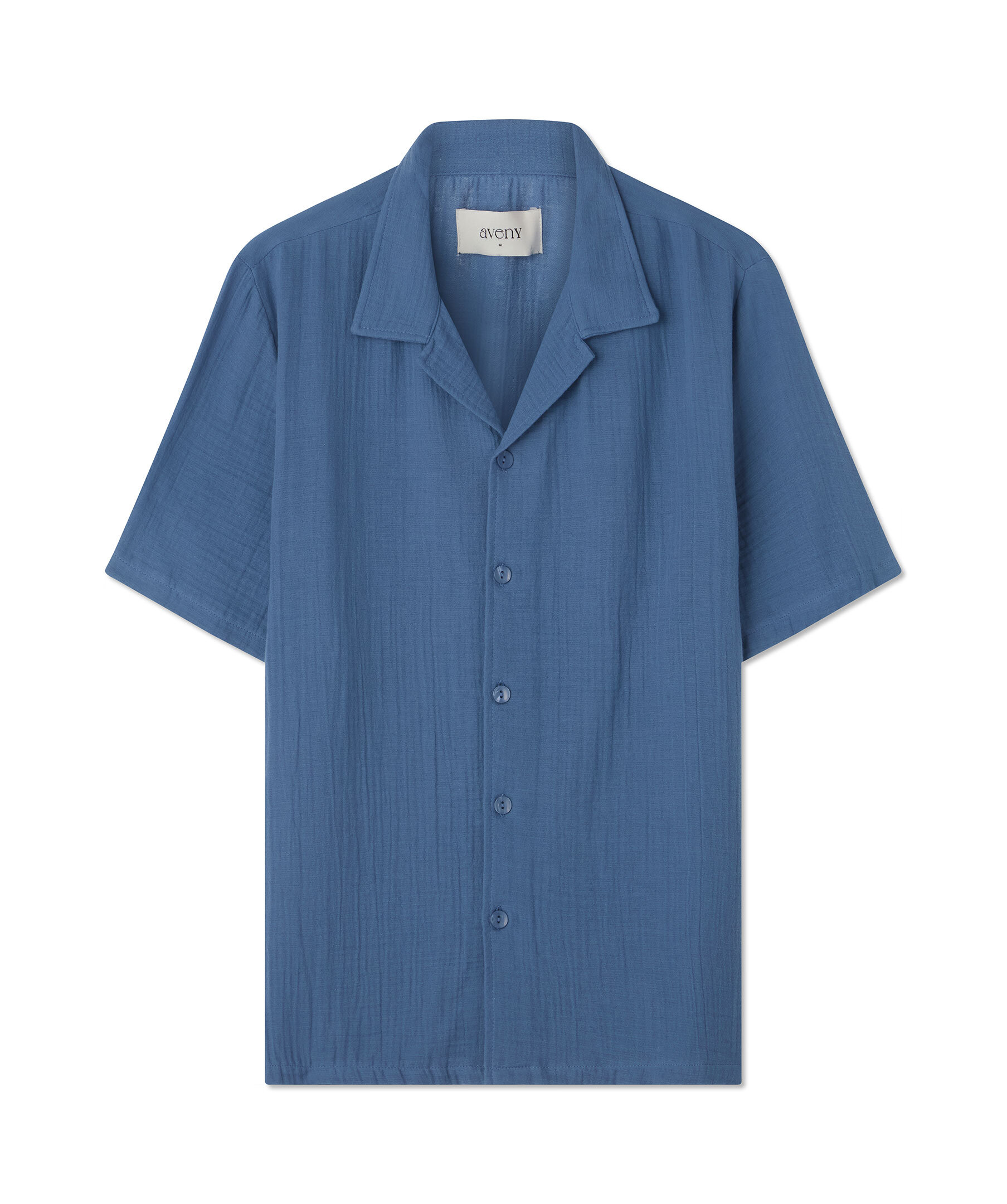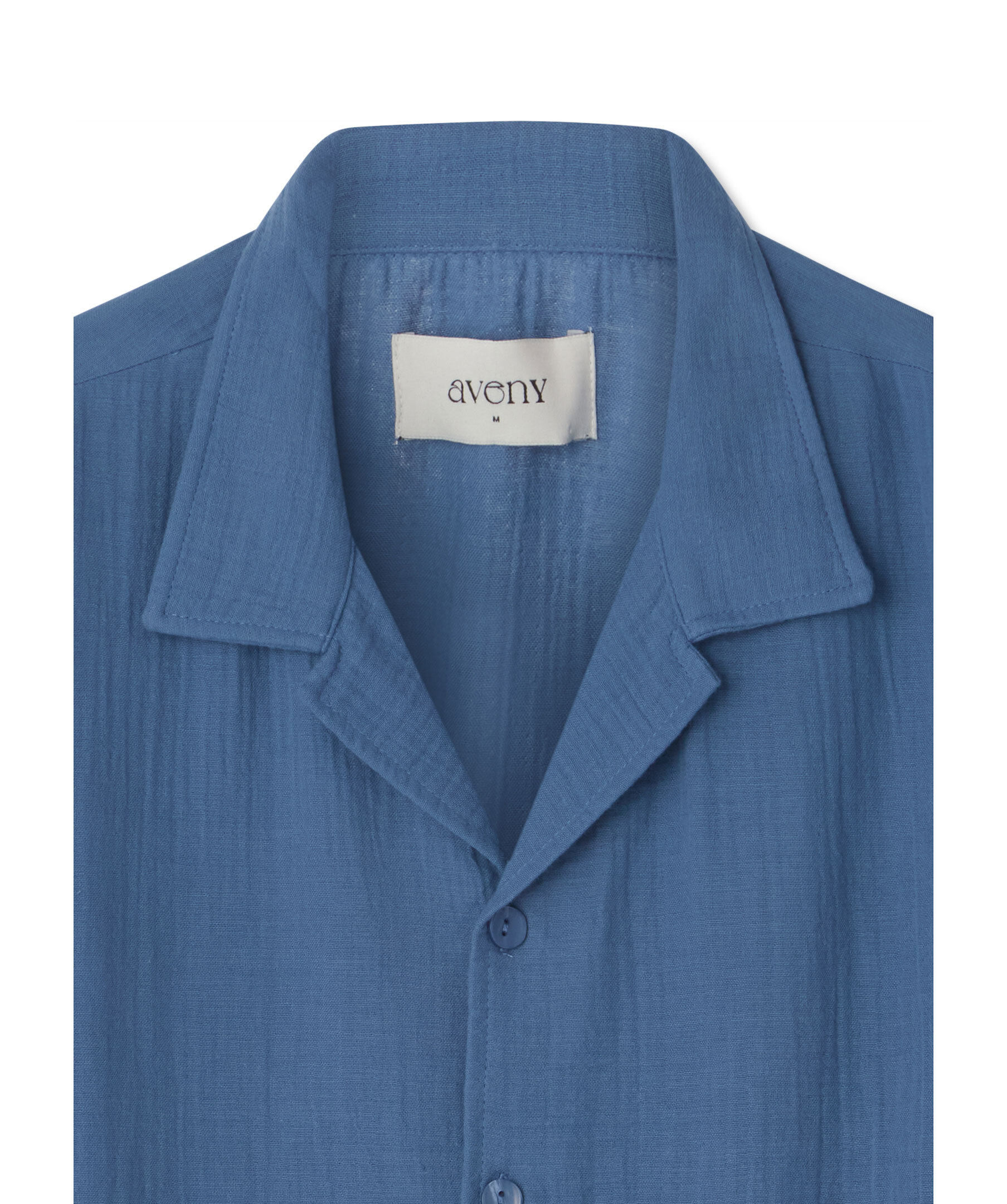 Indigo blå skjorta från Aveny. Skjortan är kortärmad och har en bowlingkrage, stängs med pärlknappar fram. Tillverkad av bomull, i ett stilfullt skrynkligt tyg.