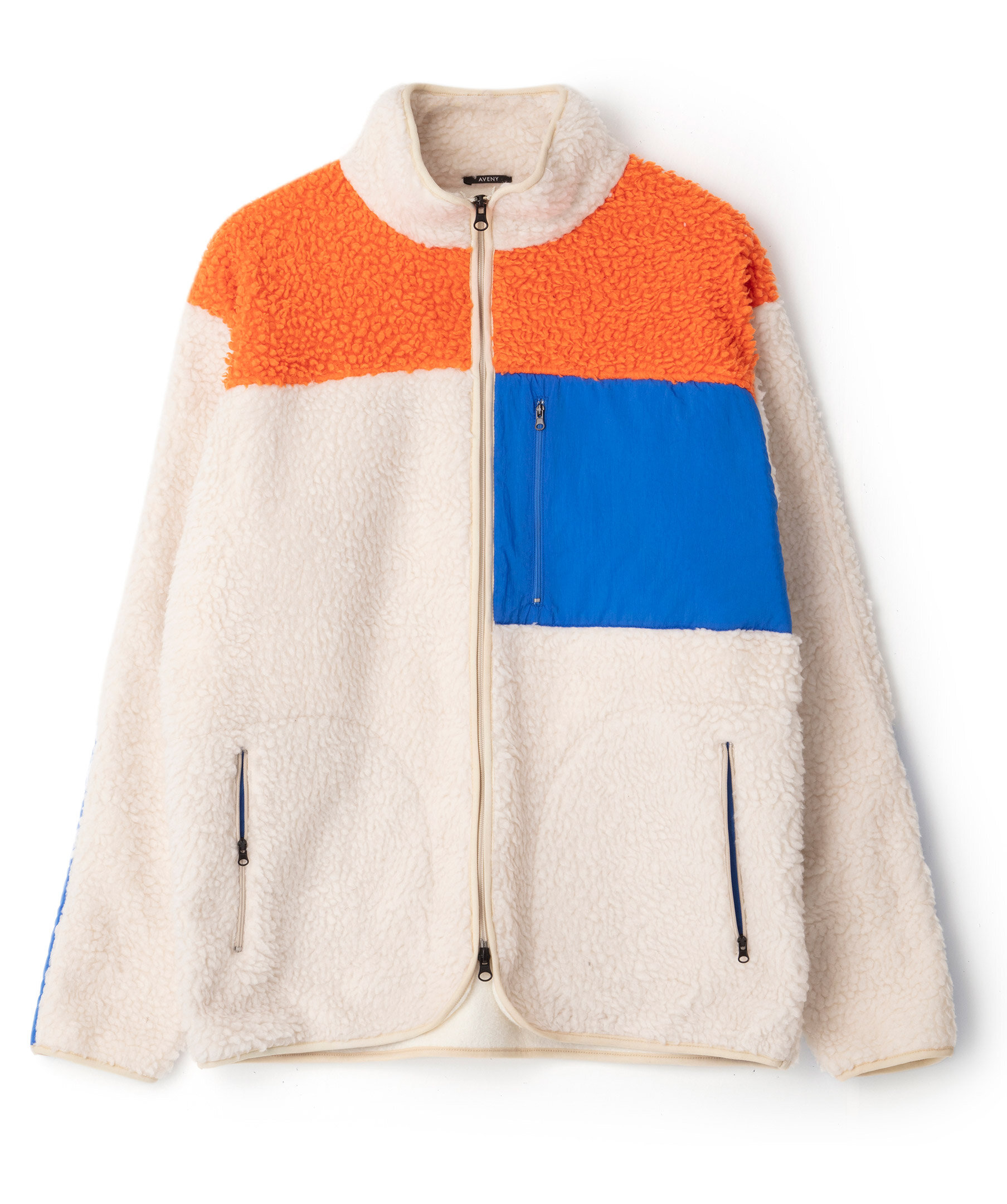 Off-white, orange och blå blockfärgad pile från Aveny. Stängs framtill med tvåvägs dragkedja. Bröstficka på vänster sida som stängs med dragkedja. Två fickor framtill som stängs med dragkedja. Vävt material på vänster bröst. Smal elastisk mudd vid ärm- och plaggslut. Något liten i storleken.