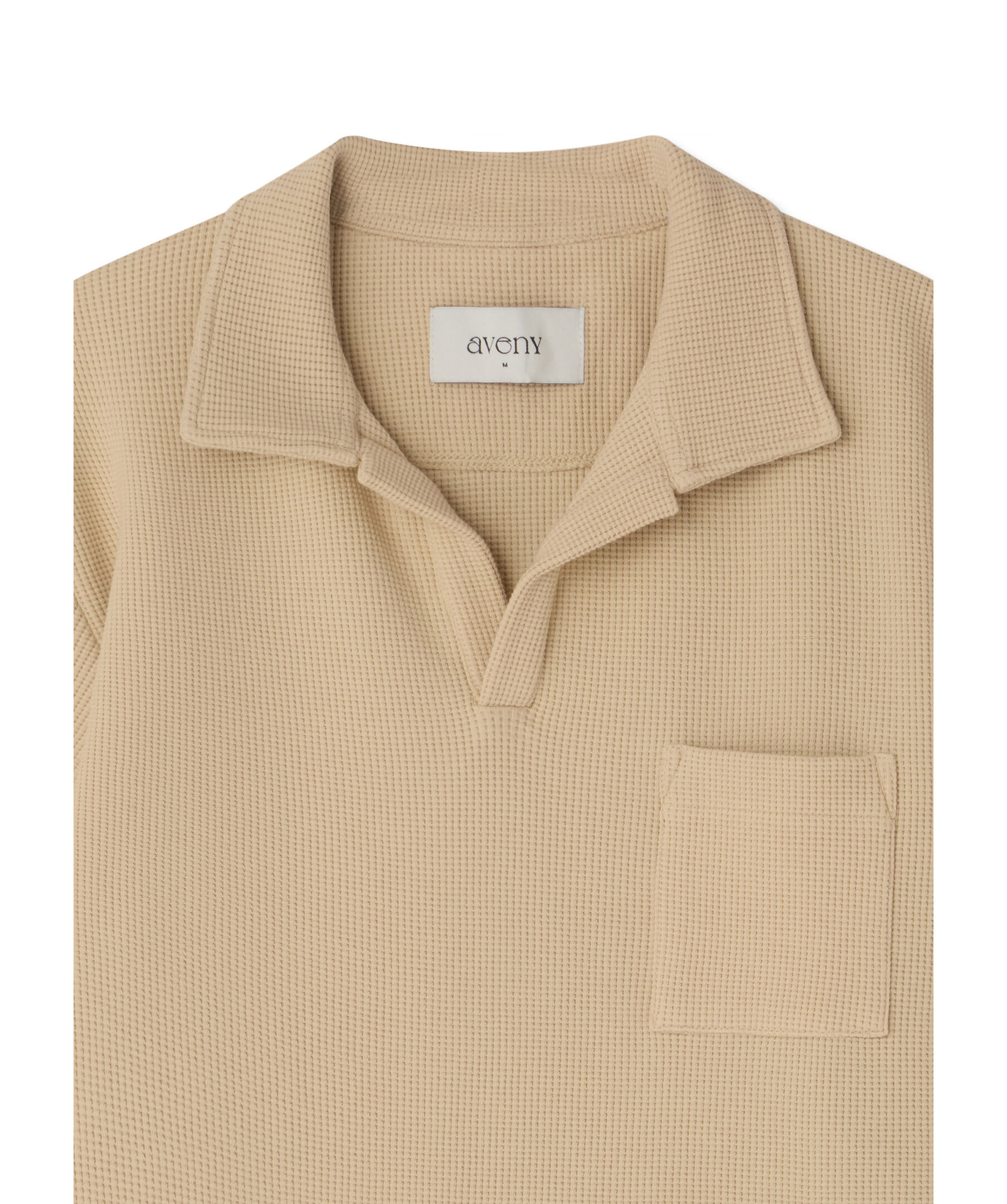 Beige pikétröja med våffelstruktur från Aveny. Pikén har en öppen krage och en bröstficka. Tillverkad i 100% ekologisk bomull.