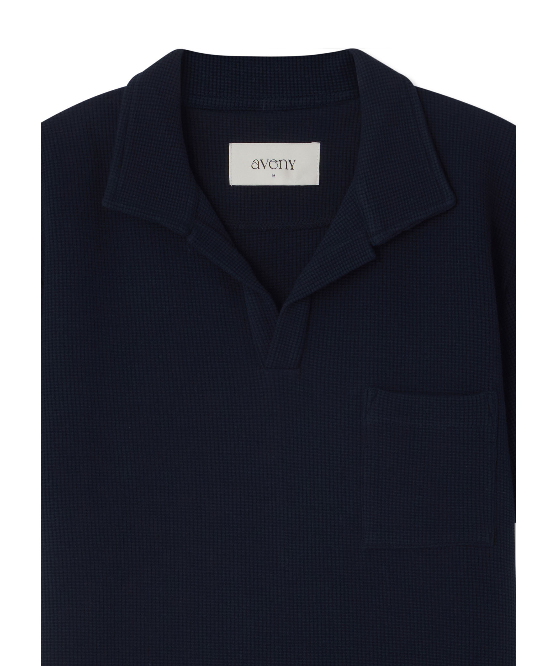Mörkblå pikétröja med våffelstruktur från Aveny. Pikén har en öppen krage och en bröstficka. Tillverkad i 100% ekologisk bomull.
