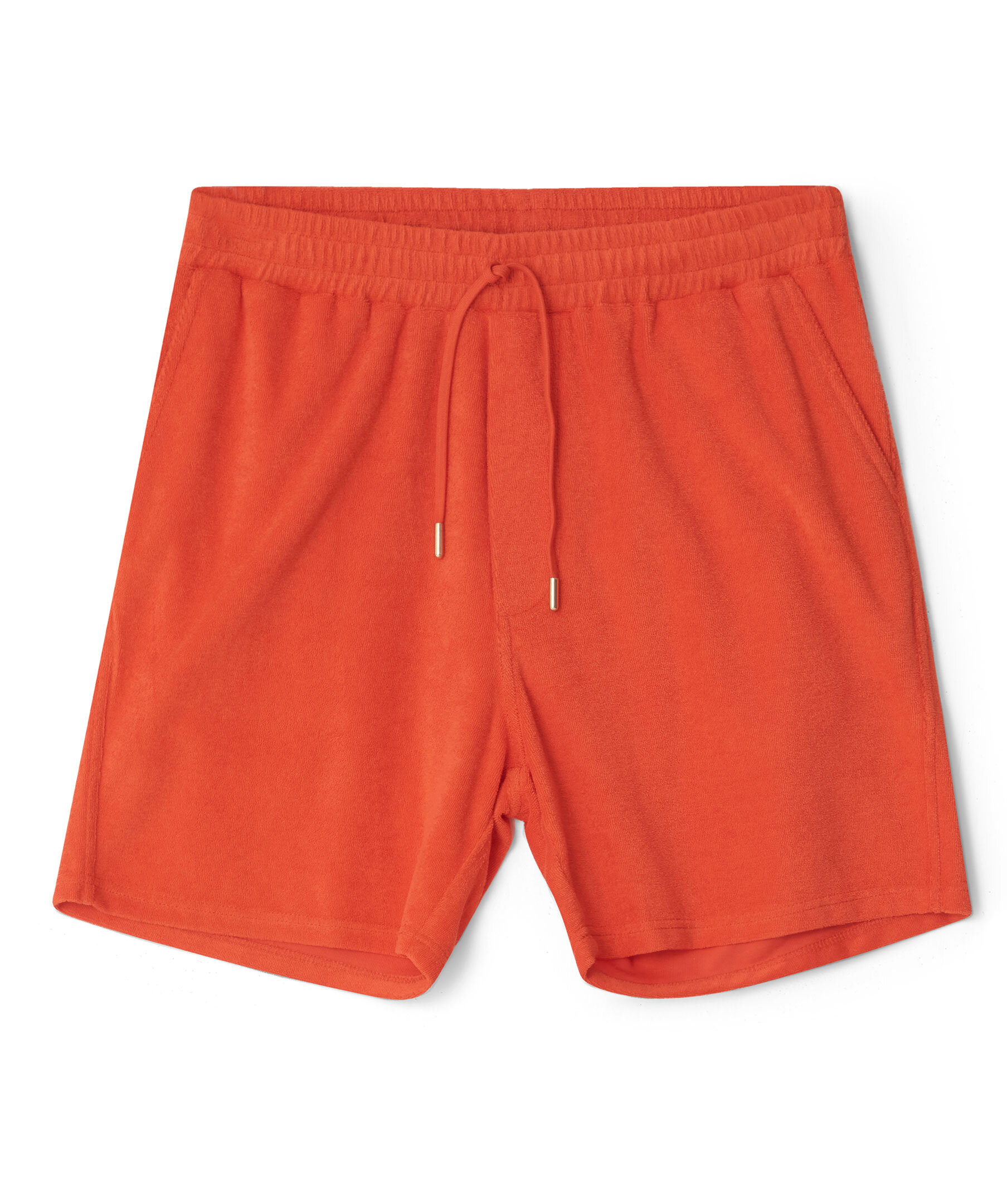 Orangea shorts i froté från Aveny. Elastisk resår i midjan och dragsko. Tillverkad i ekologisk bomulls blandning.