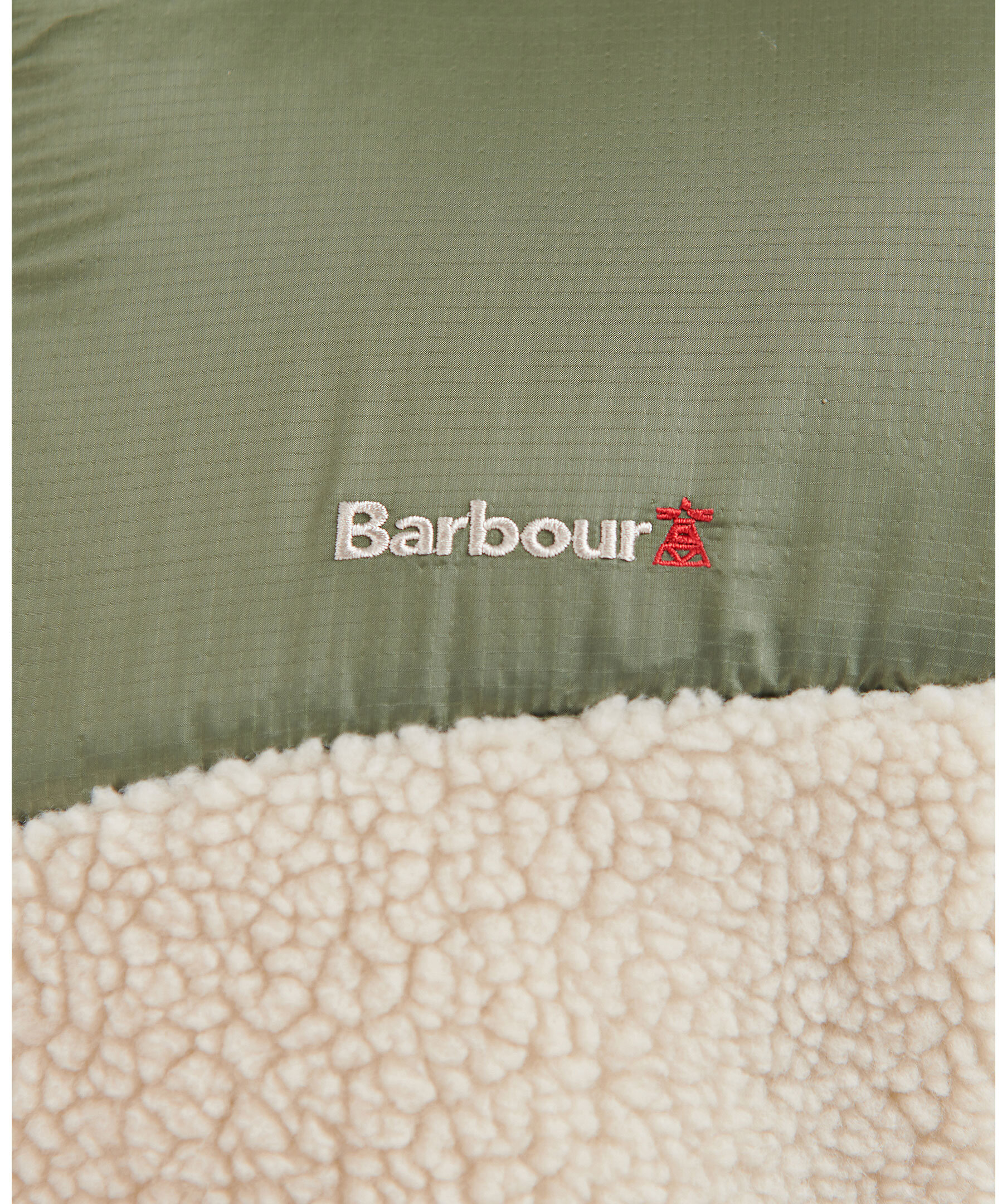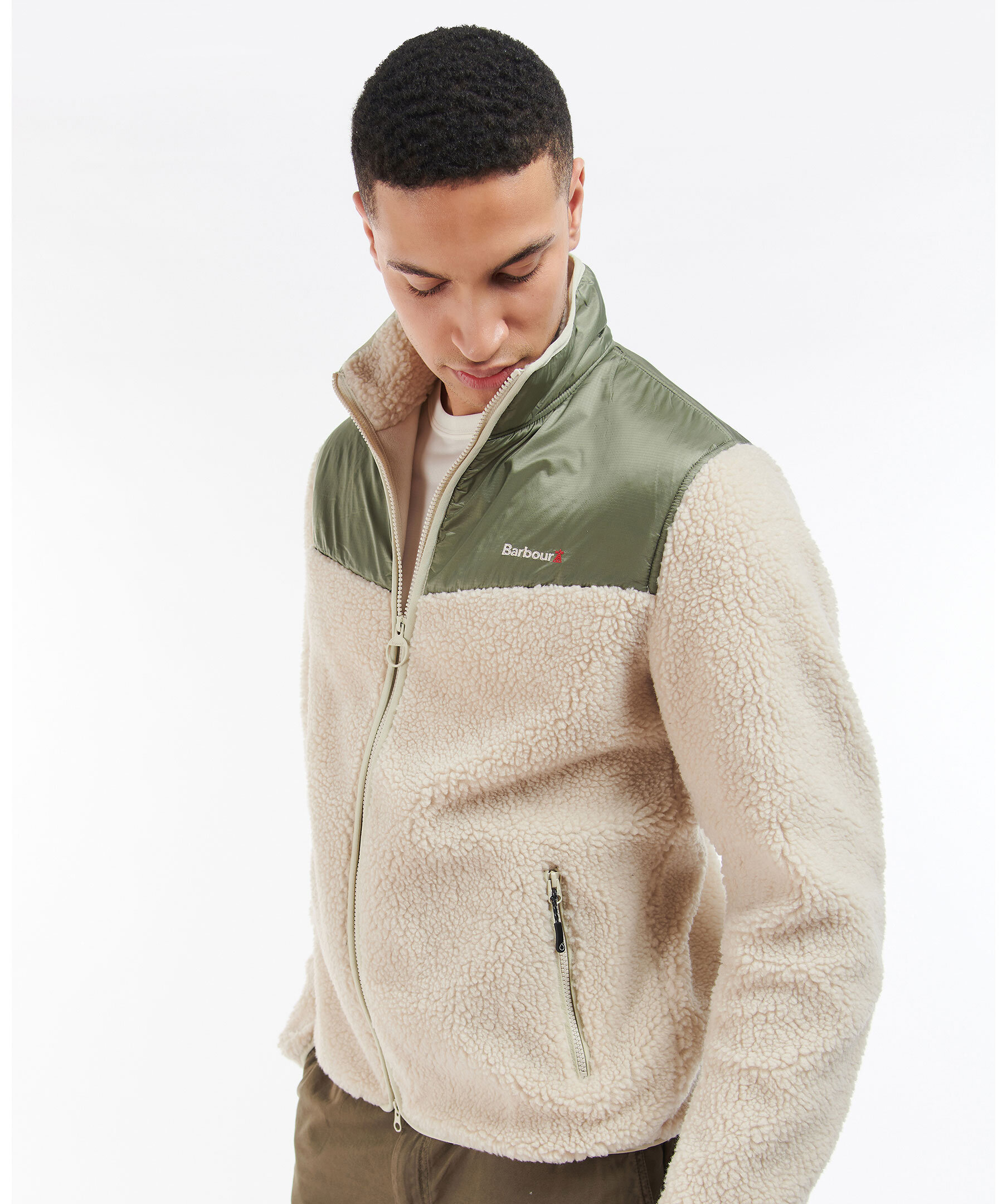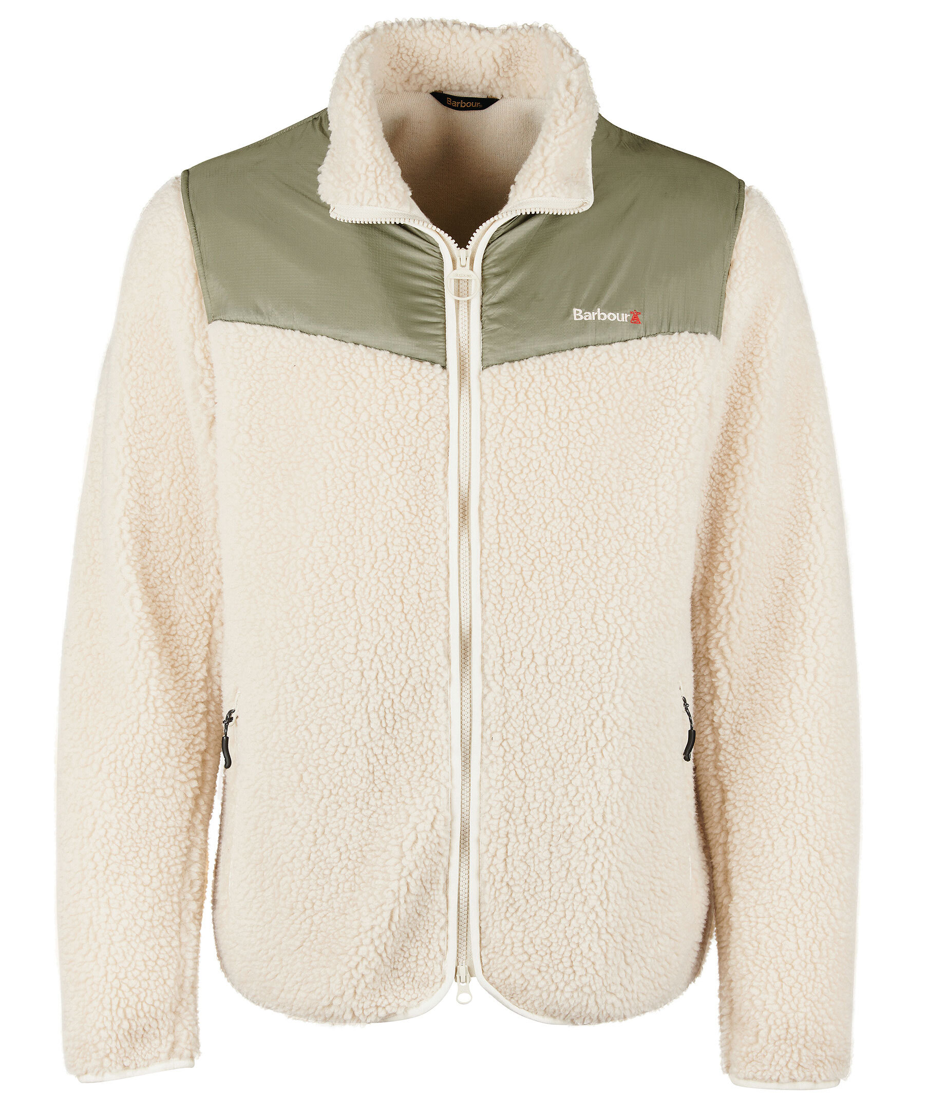 Beige fleecejacka med liten krage från Barbour. Beige pilétyg med olivgrönt kontrasterande tyg på axlar, och bröst samt på den övre delen av ryggen. Dragkedja framtill, framfickor med dragkedja och klassisk broderad logotyp på bröstet.
