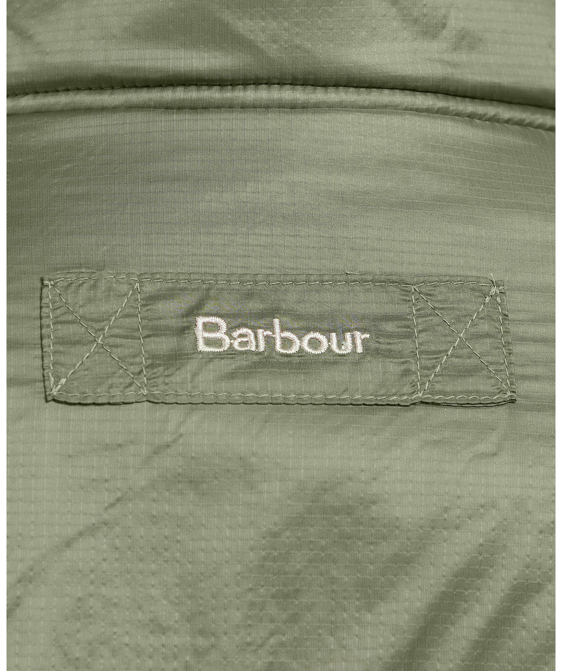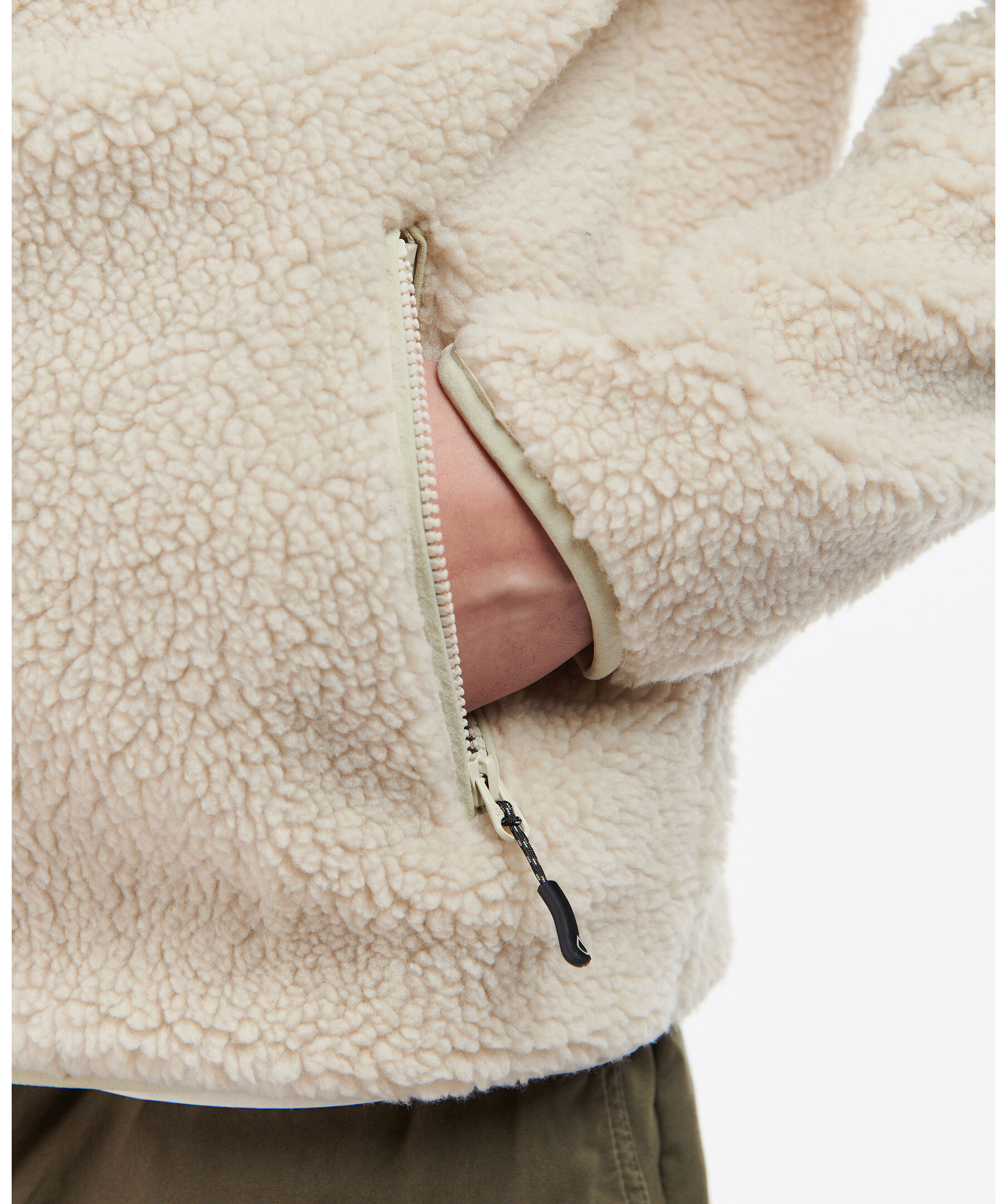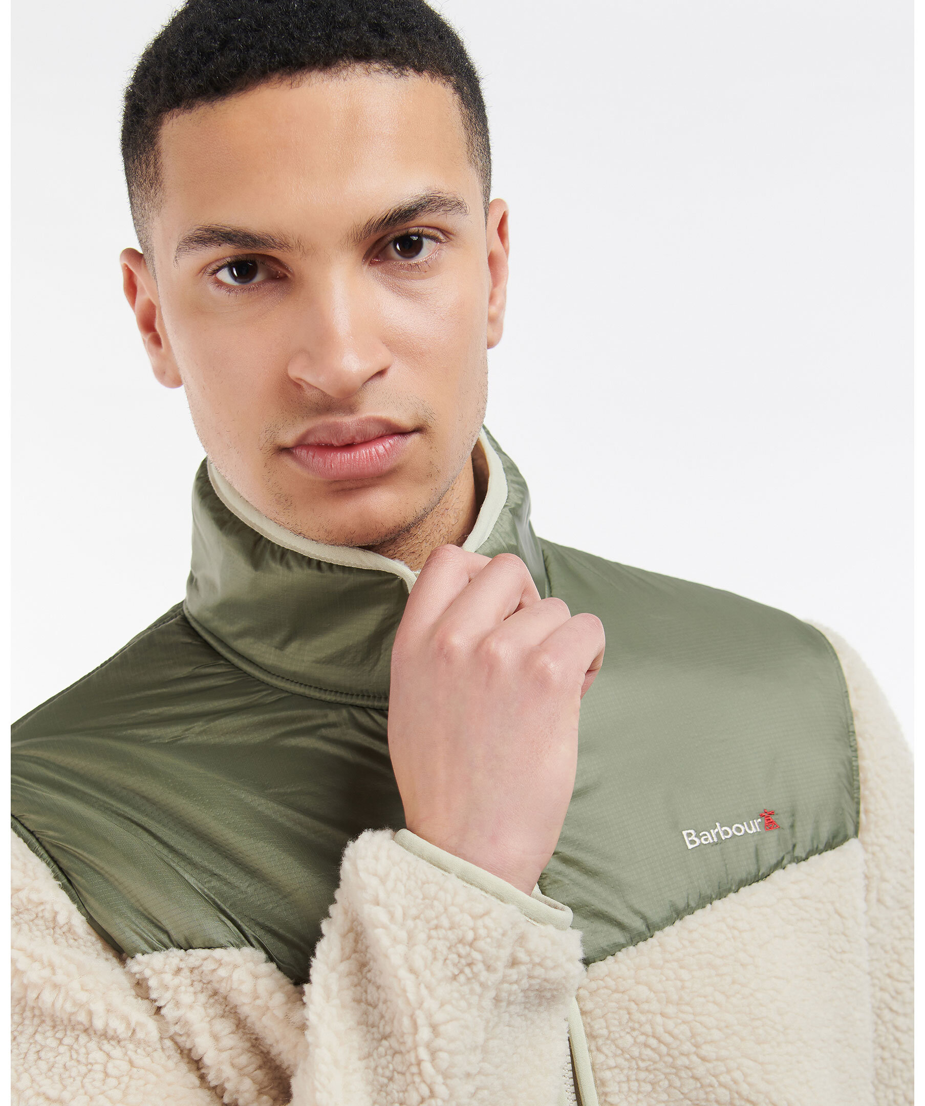 Beige fleecejacka med liten krage från Barbour. Beige pilétyg med olivgrönt kontrasterande tyg på axlar, och bröst samt på den övre delen av ryggen. Dragkedja framtill, framfickor med dragkedja och klassisk broderad logotyp på bröstet.