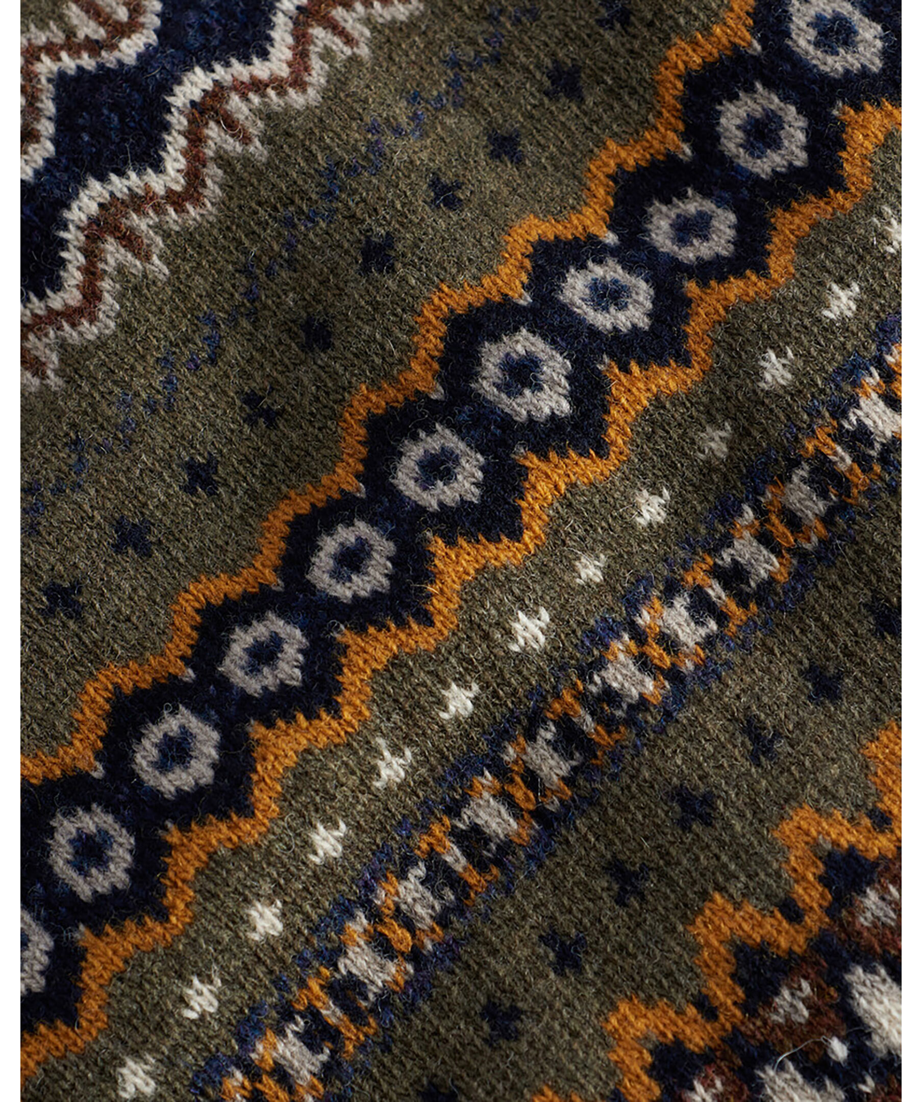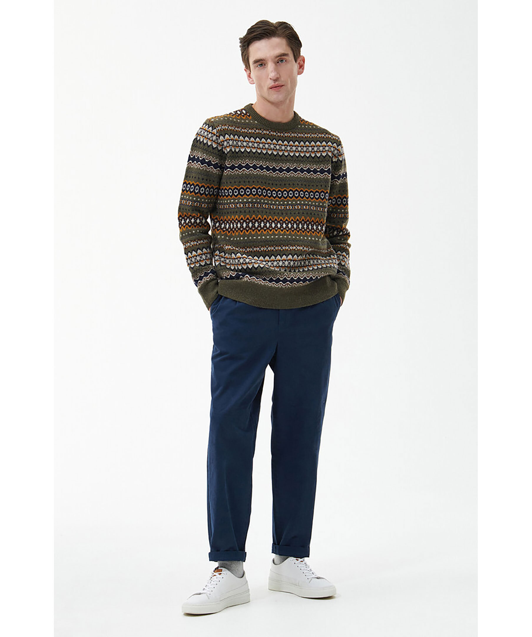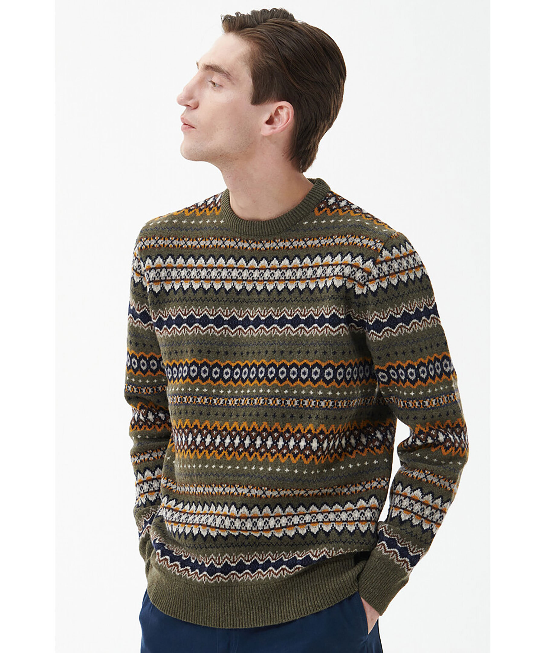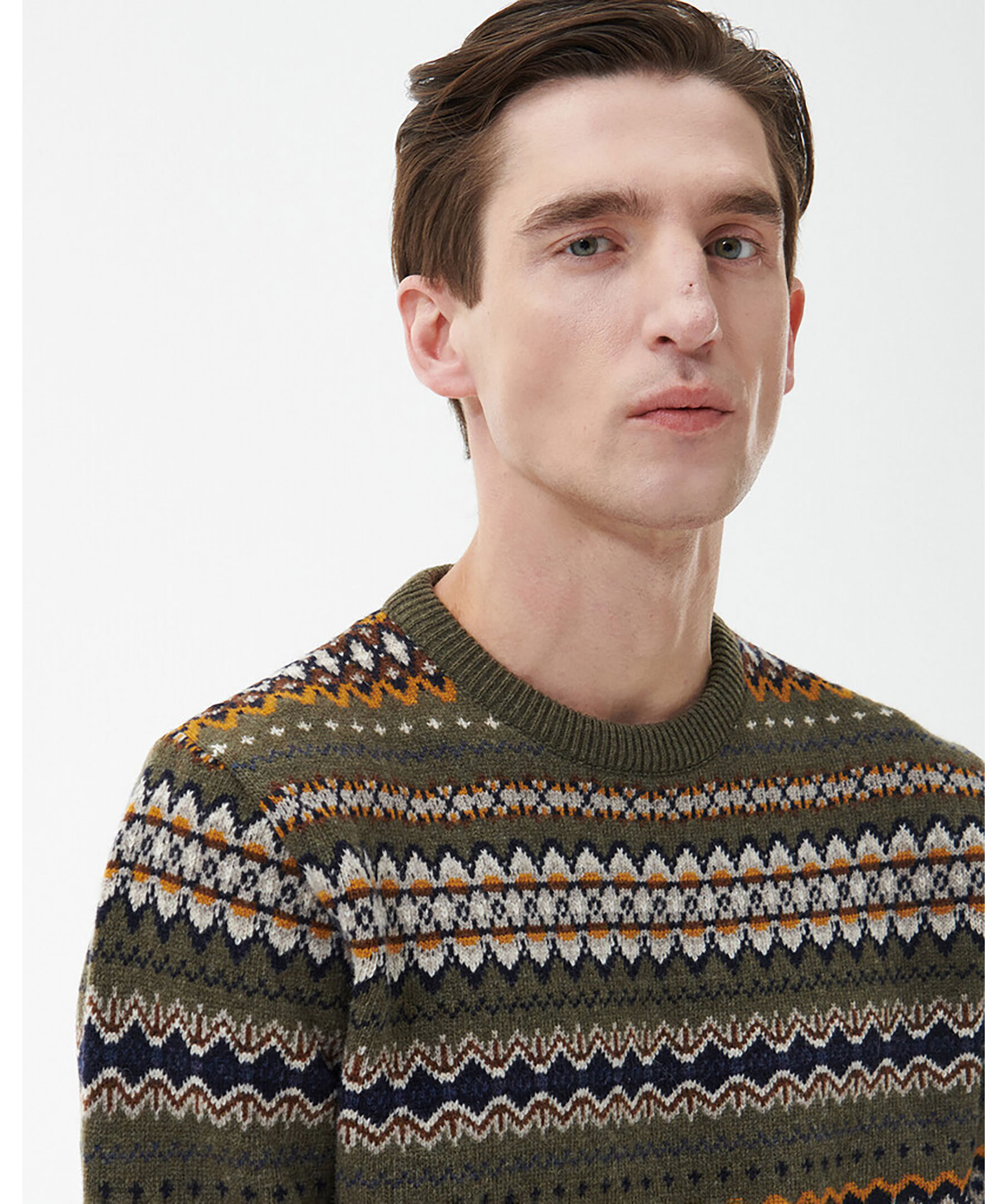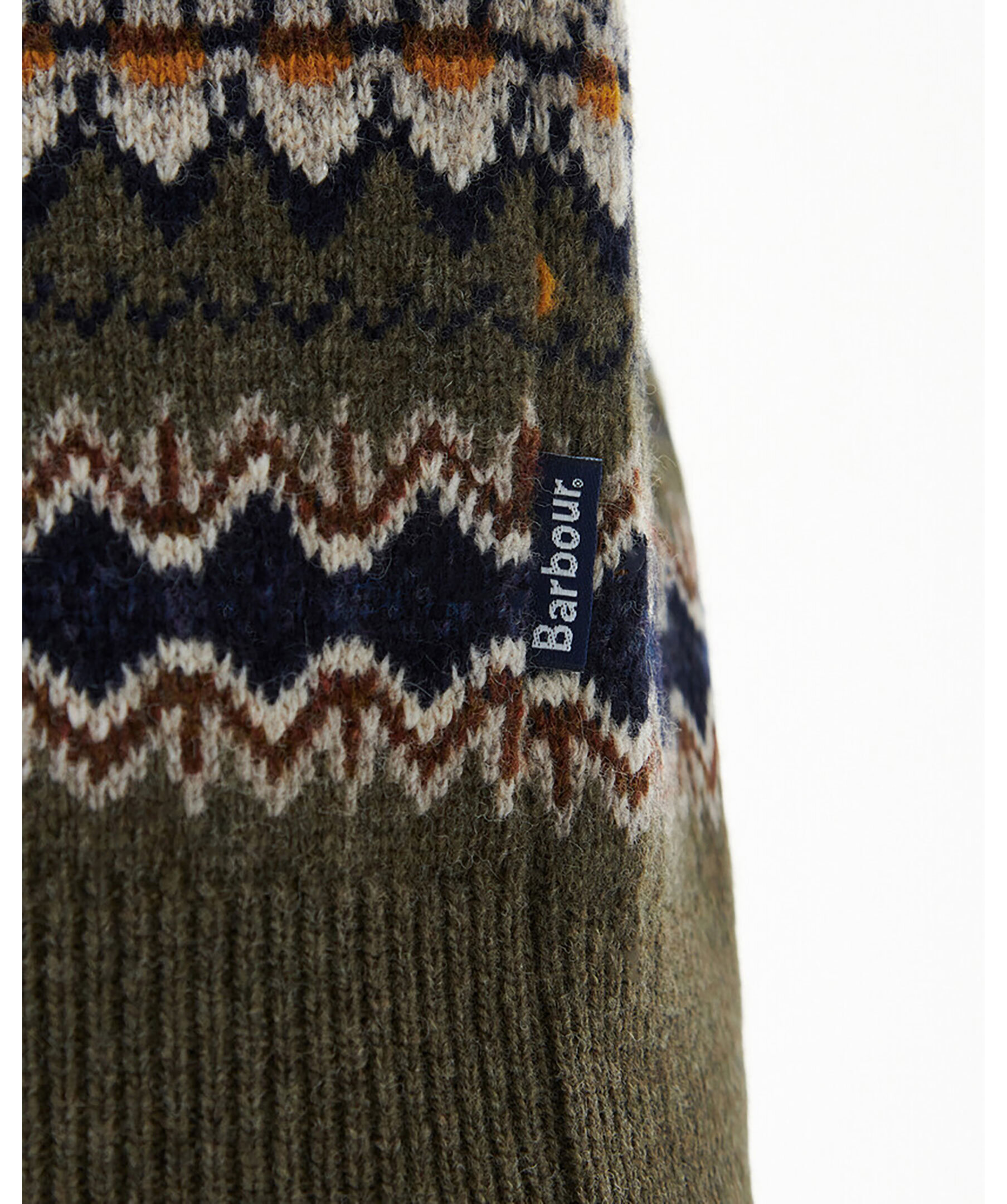 Skogsgrön stickad tröja från Barbour. Ribbstickad halsringning, ribbstickade muddar vid ärm- och plaggslut. Tröjan har en fairisle-design. Tillverkad i 100% ull.