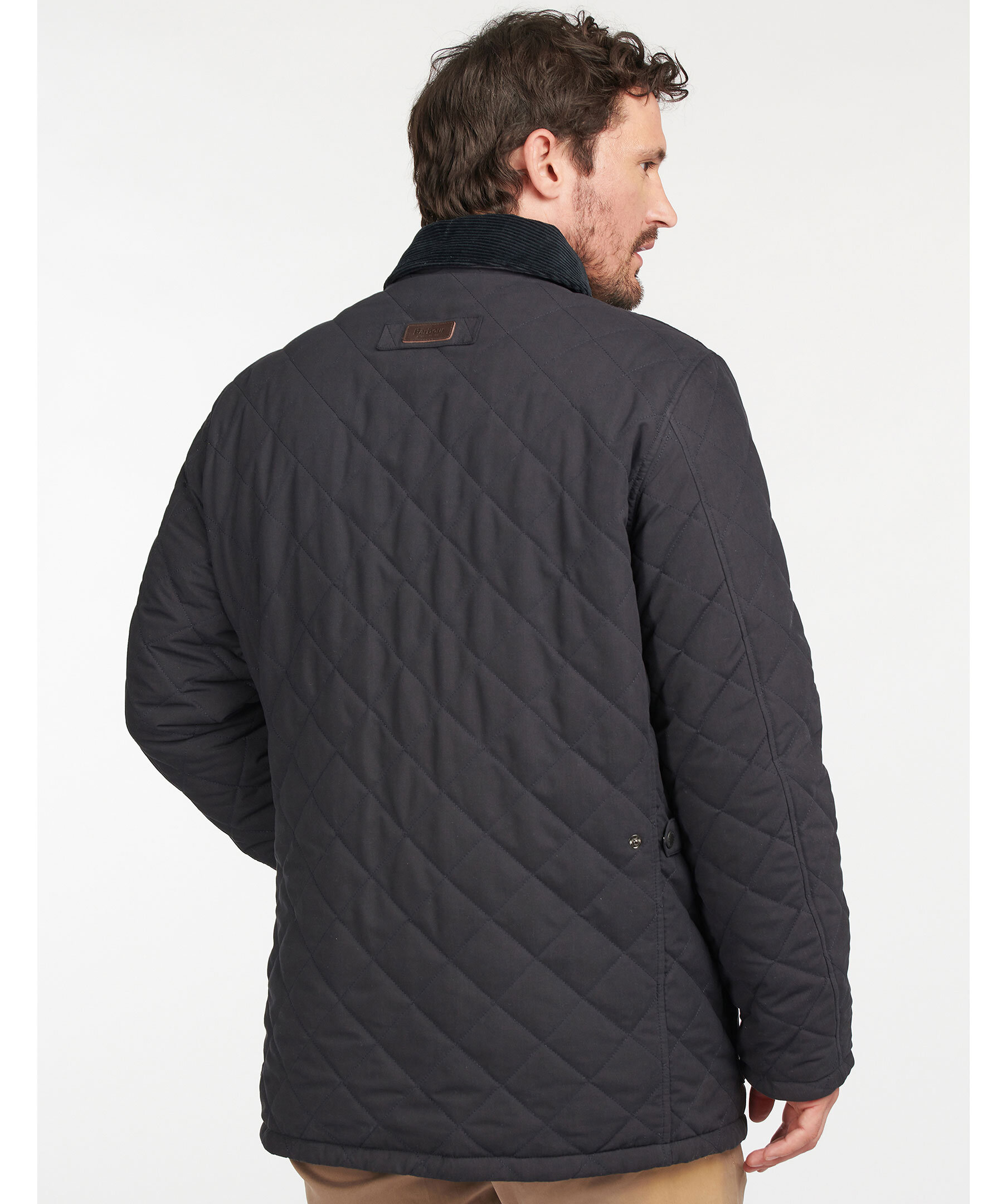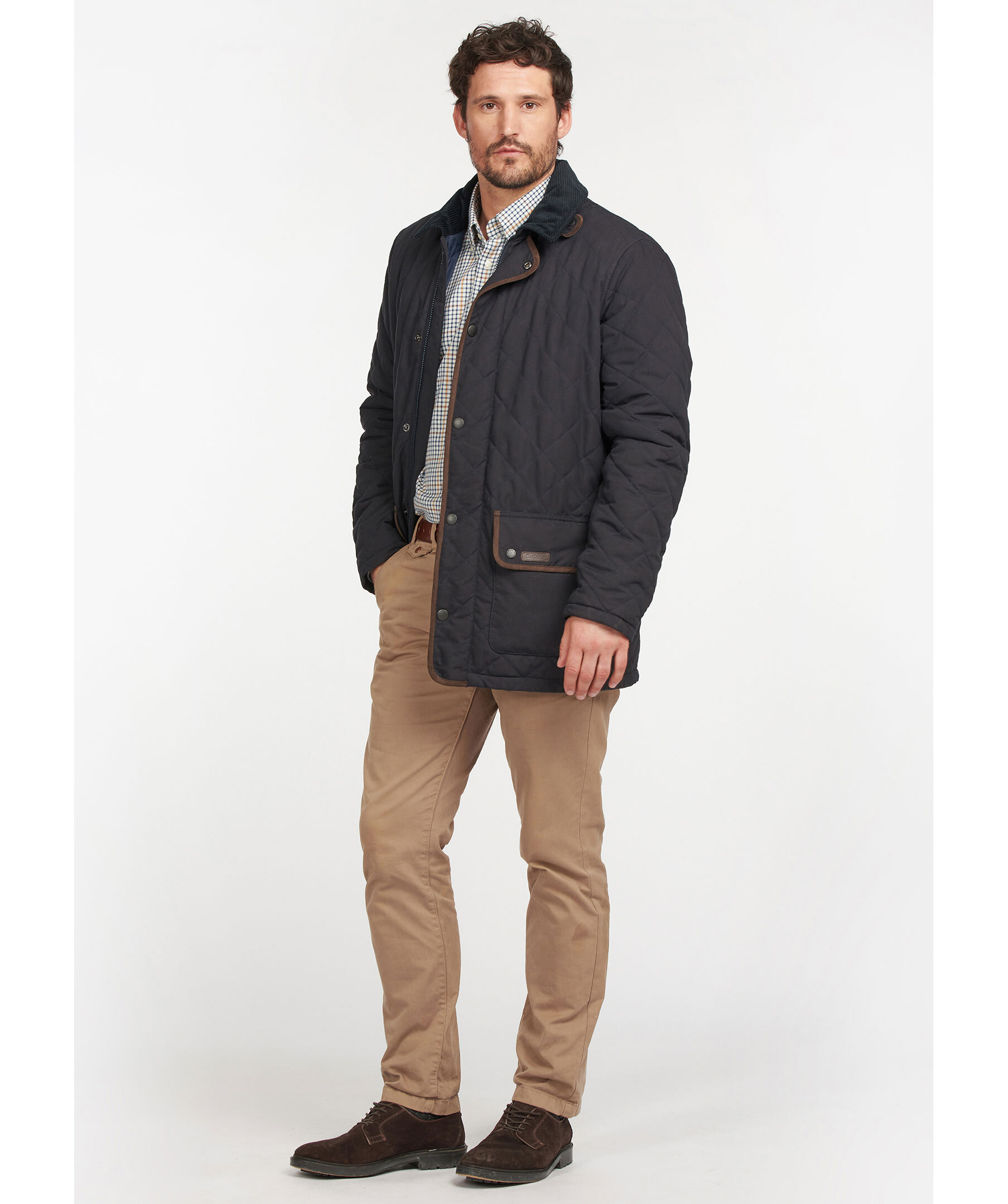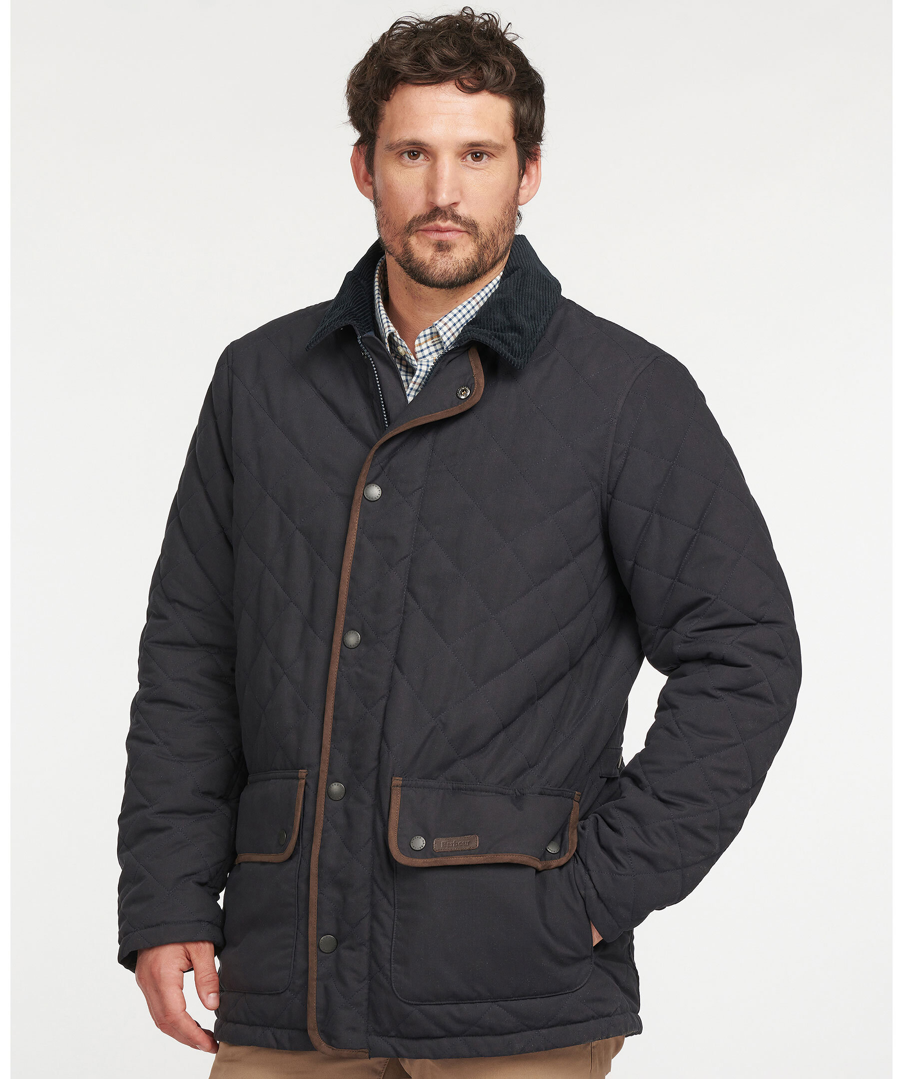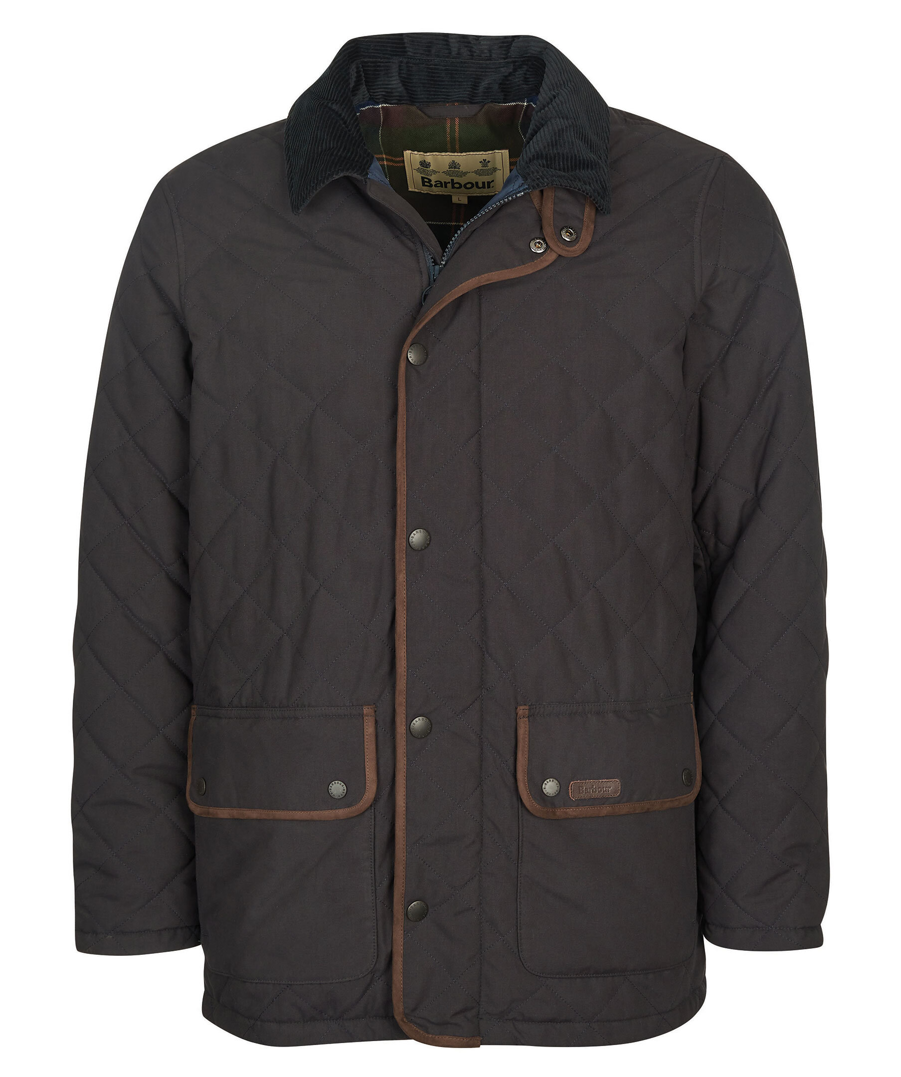Mörkblå quiltad jacka från Barbour. Yttertyget är gjort i vattentålig polyester och har en mörkblå krage i manchester. Innertyg i rutig polyamid. Jackan stängs med dragkedja och tryckknappar, kragen kan också knäppas till med tryckknapp. Två stora framfickor som stängs med tryckknappar och en innerficka som stängs med dragkedja. Små etiketter med logotyp i läger på ena fickan samt bak i nacke.