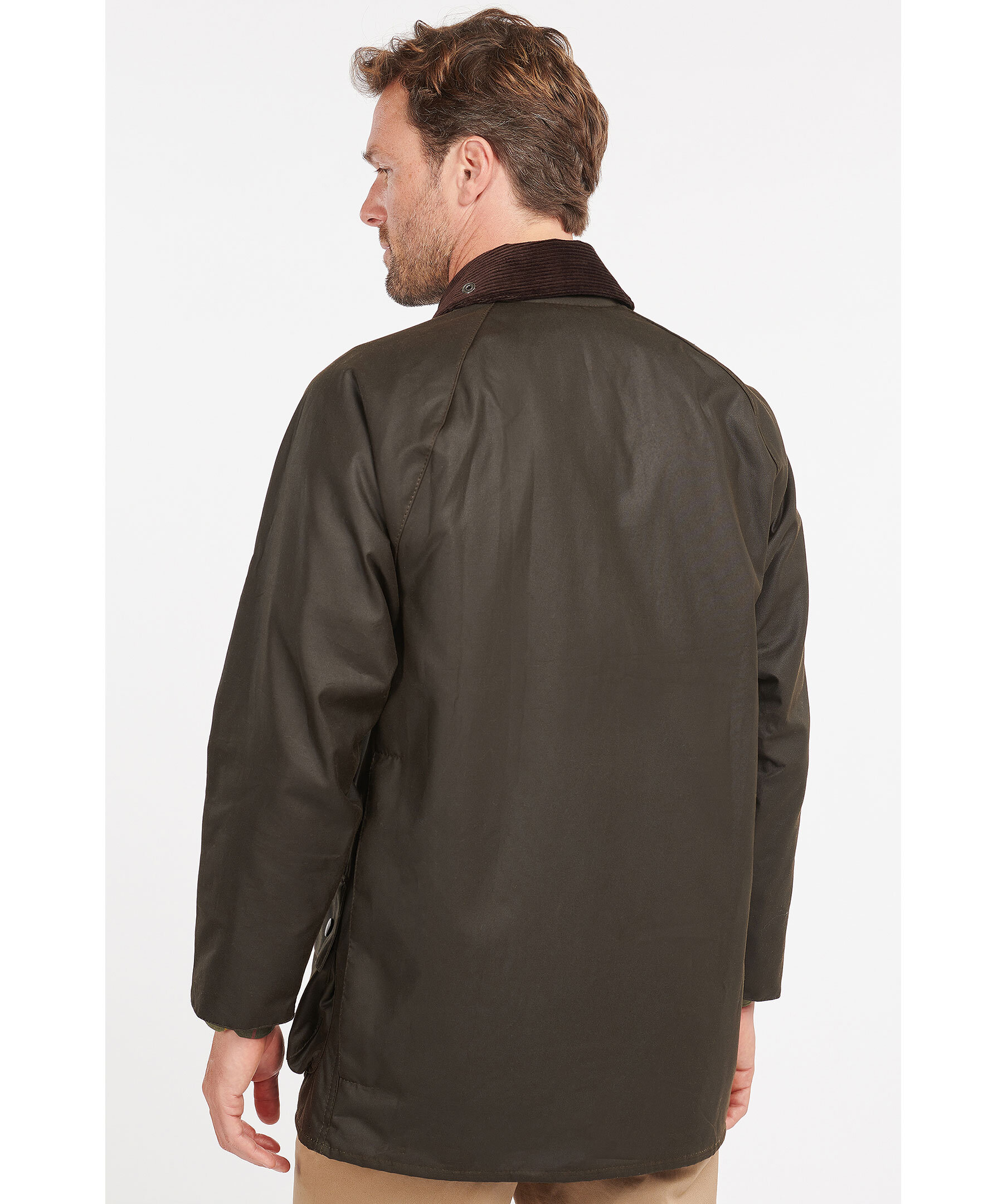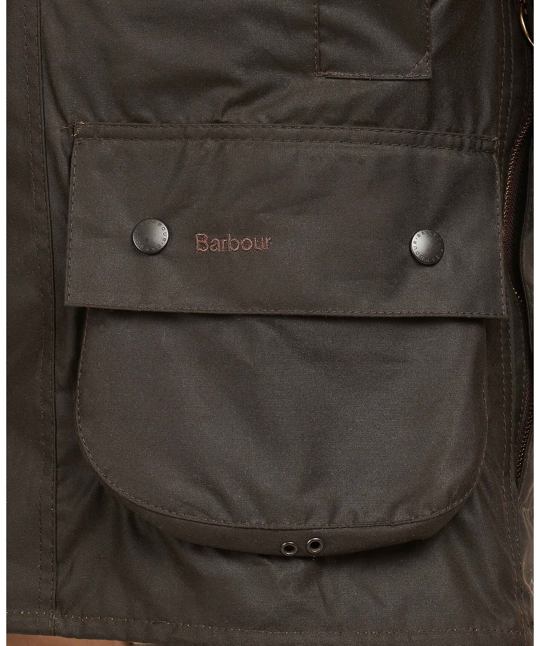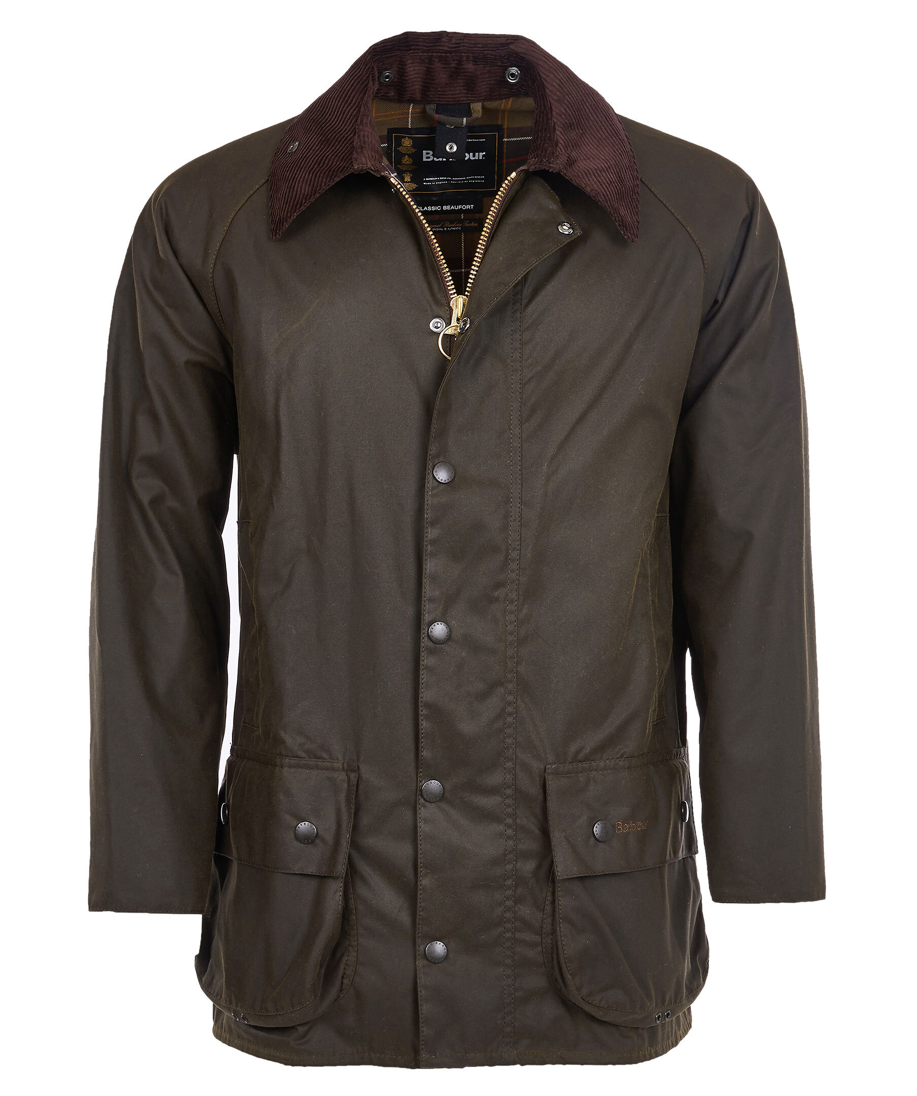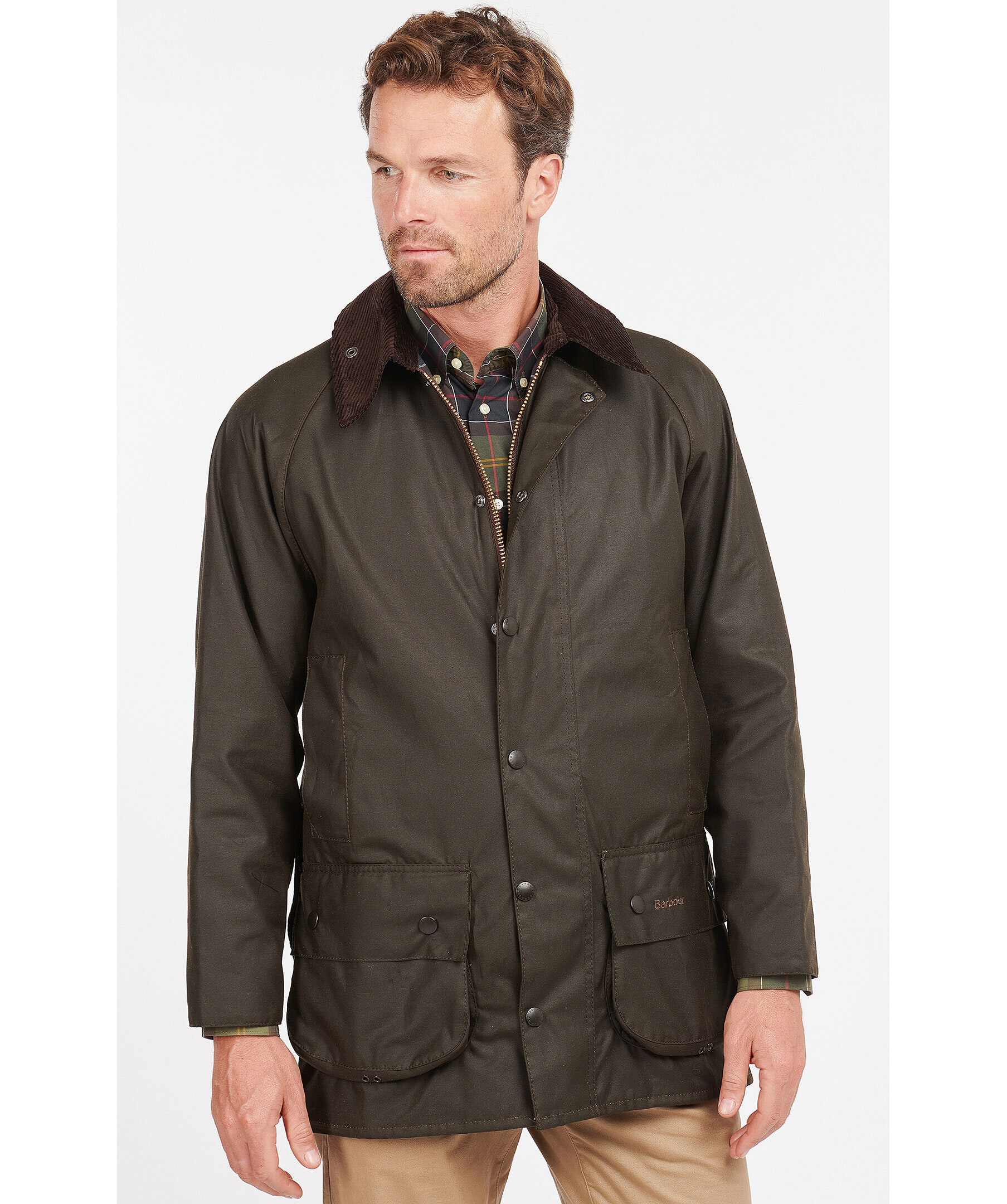 Mörkgrön jacka i vaxad bomull, från Barbour. Krage i brunt manchester, fyra fickor fram med diskret logga på vänster sida. Stor ficka med två öppningar vid ryggslutet. Helt fodrad i tartanmönstrat bomull. Stängs med dragkedja och tryckknappar.