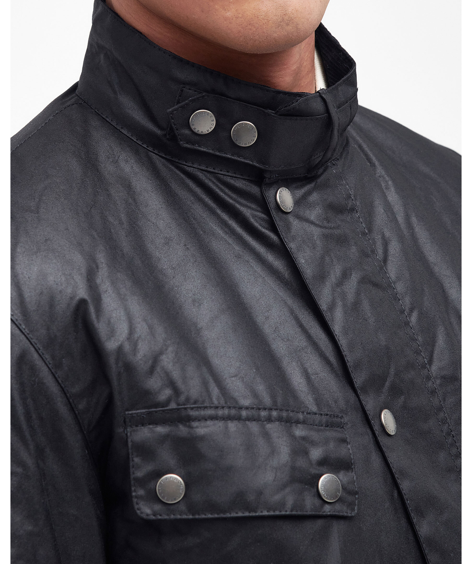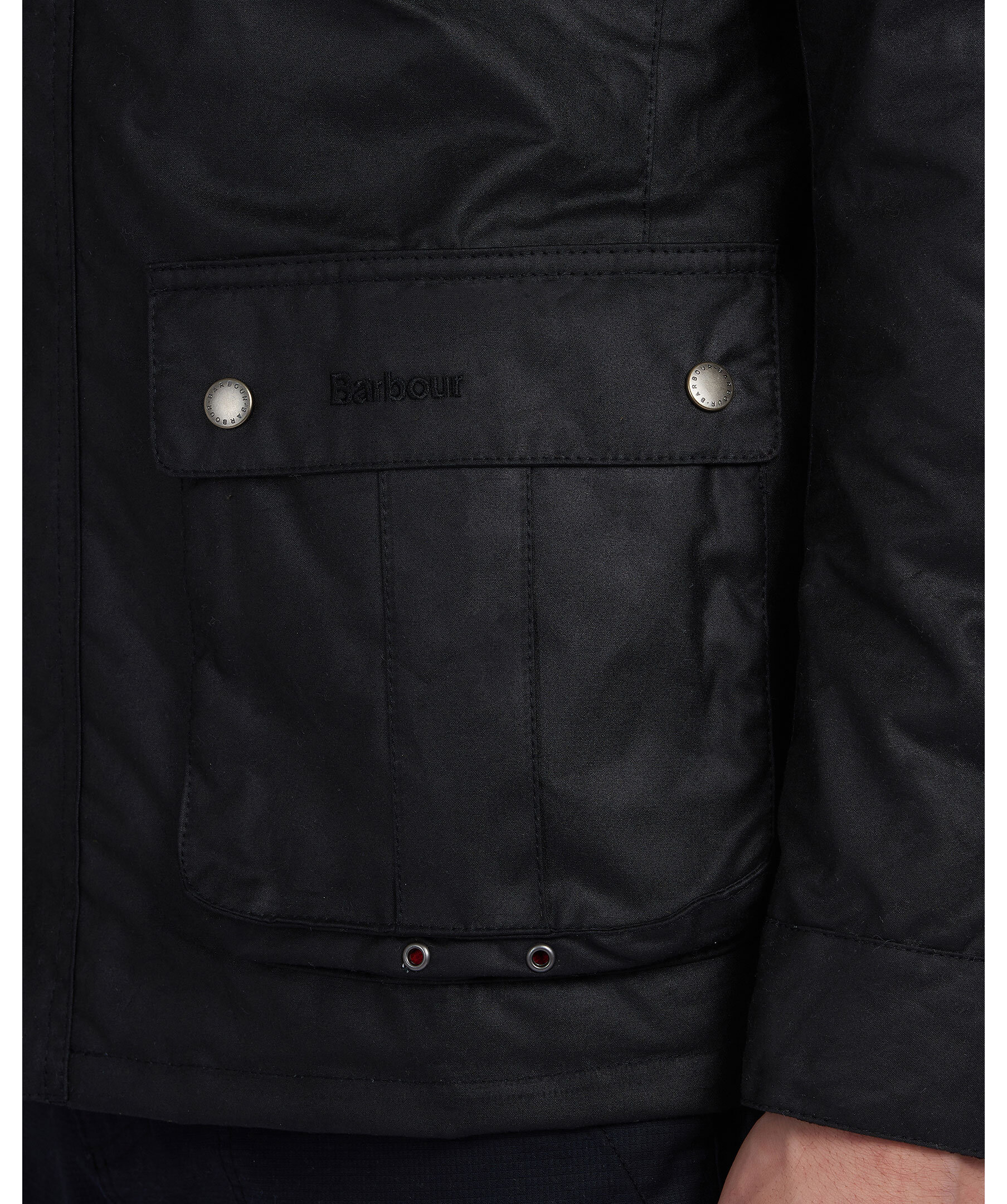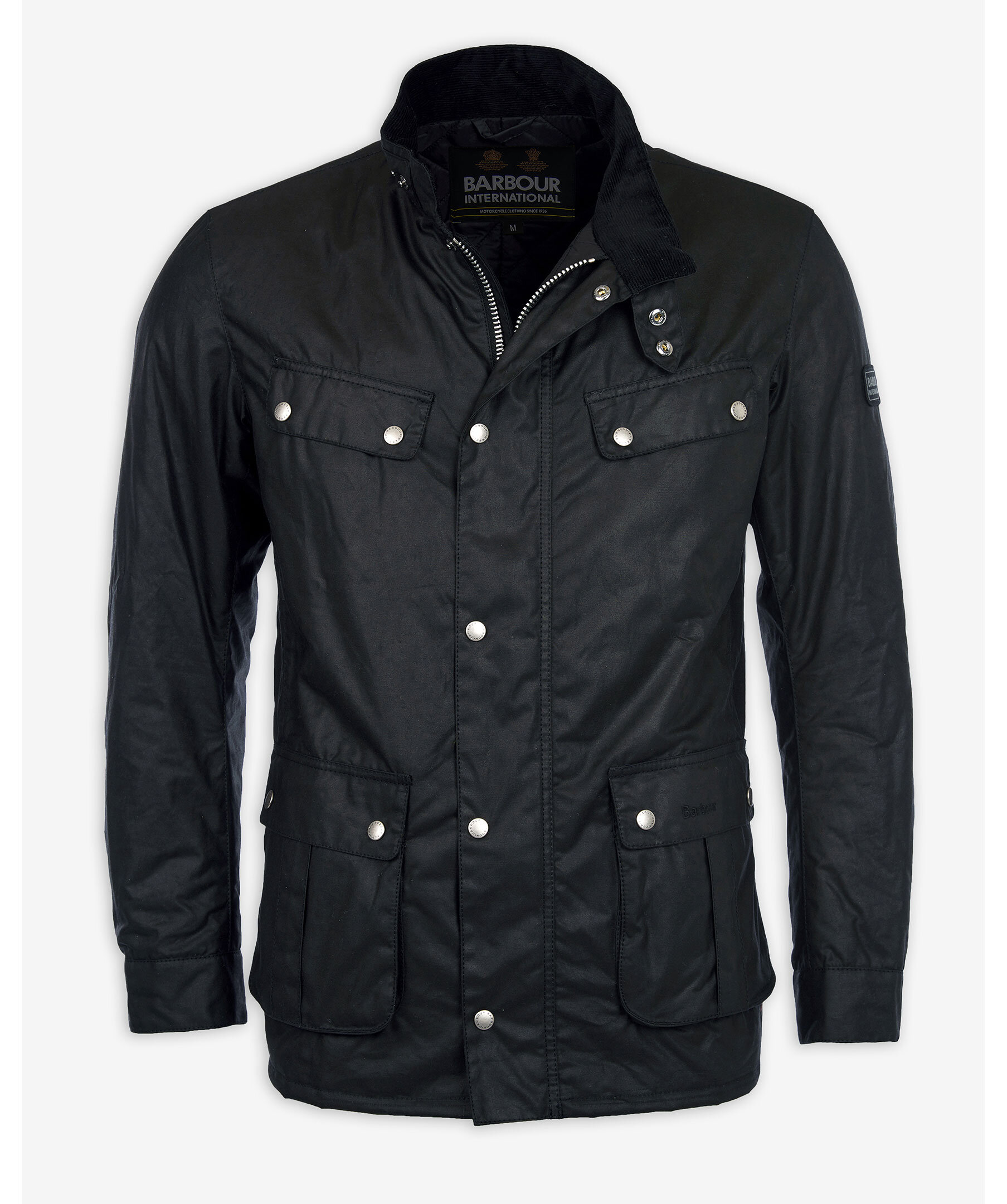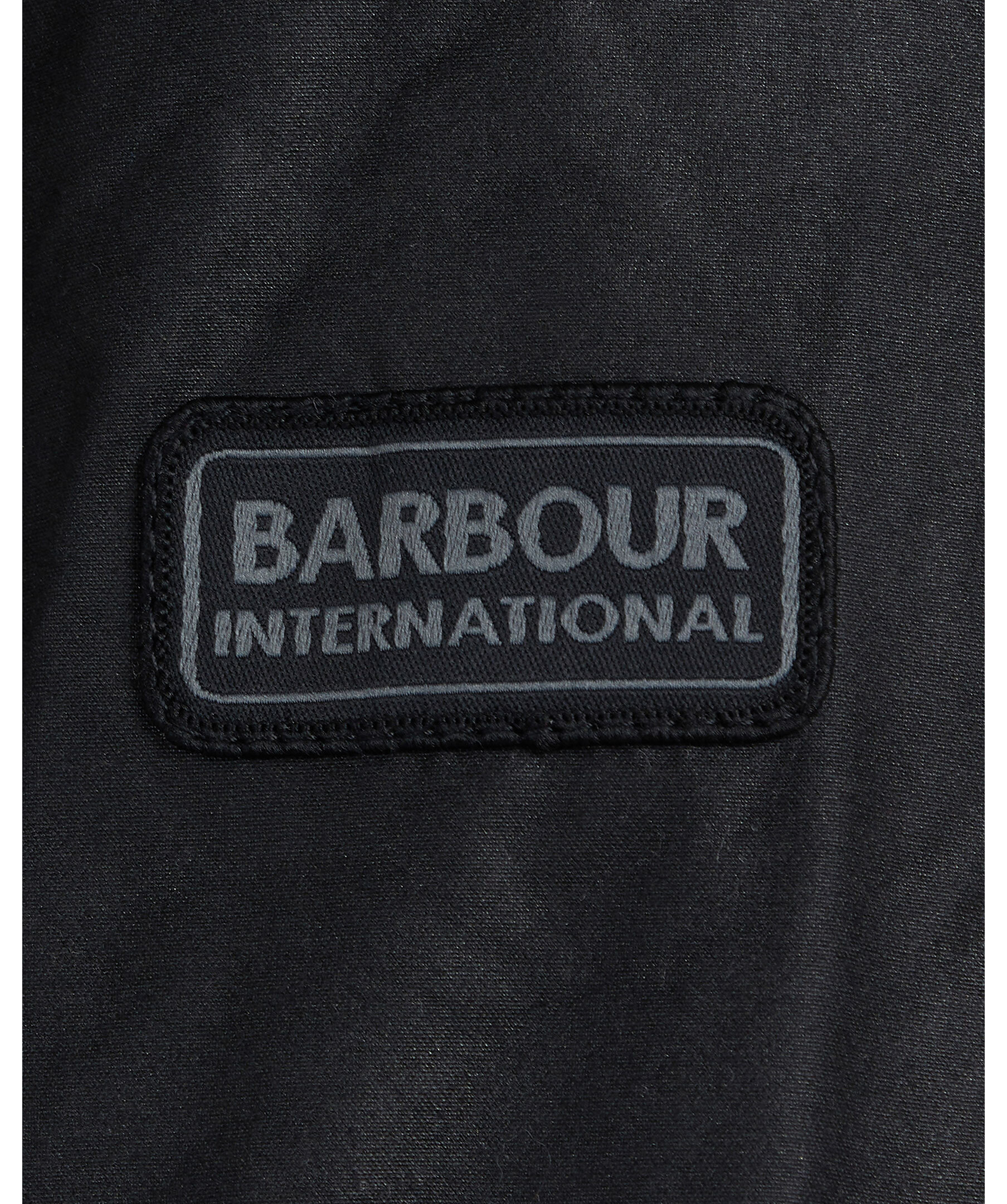 Svart vaxad jacka från Barbour. Jackan har ett quiltat foder och en modern, slimmad siluett. Den har förstärkta armbågar i samma tyg, två nedre bälgfickor och två bröstfickor med sned öppning. Jackan är helfodrad med quiltning för extra värme och avslutas med ett diskret Barbour International-märke i silikon på vänster ärm.