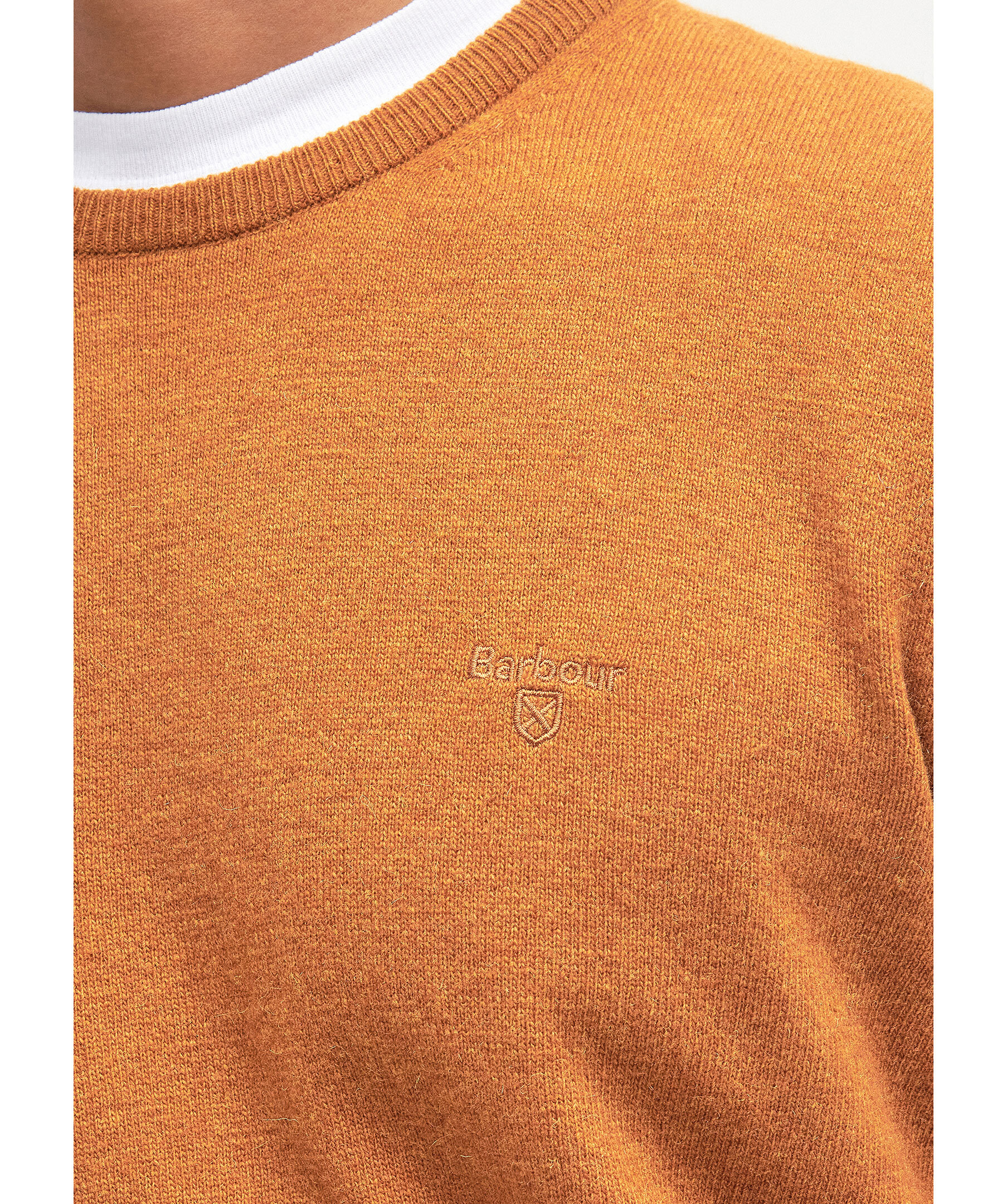 Orange stickad sweatshirt från Barbour. Tillverkad i 100% ull. Liten broderad ton-i-ton logotyp på vänster sida på bröstet. Ribbstickad krage, ärm-och plaggslut.