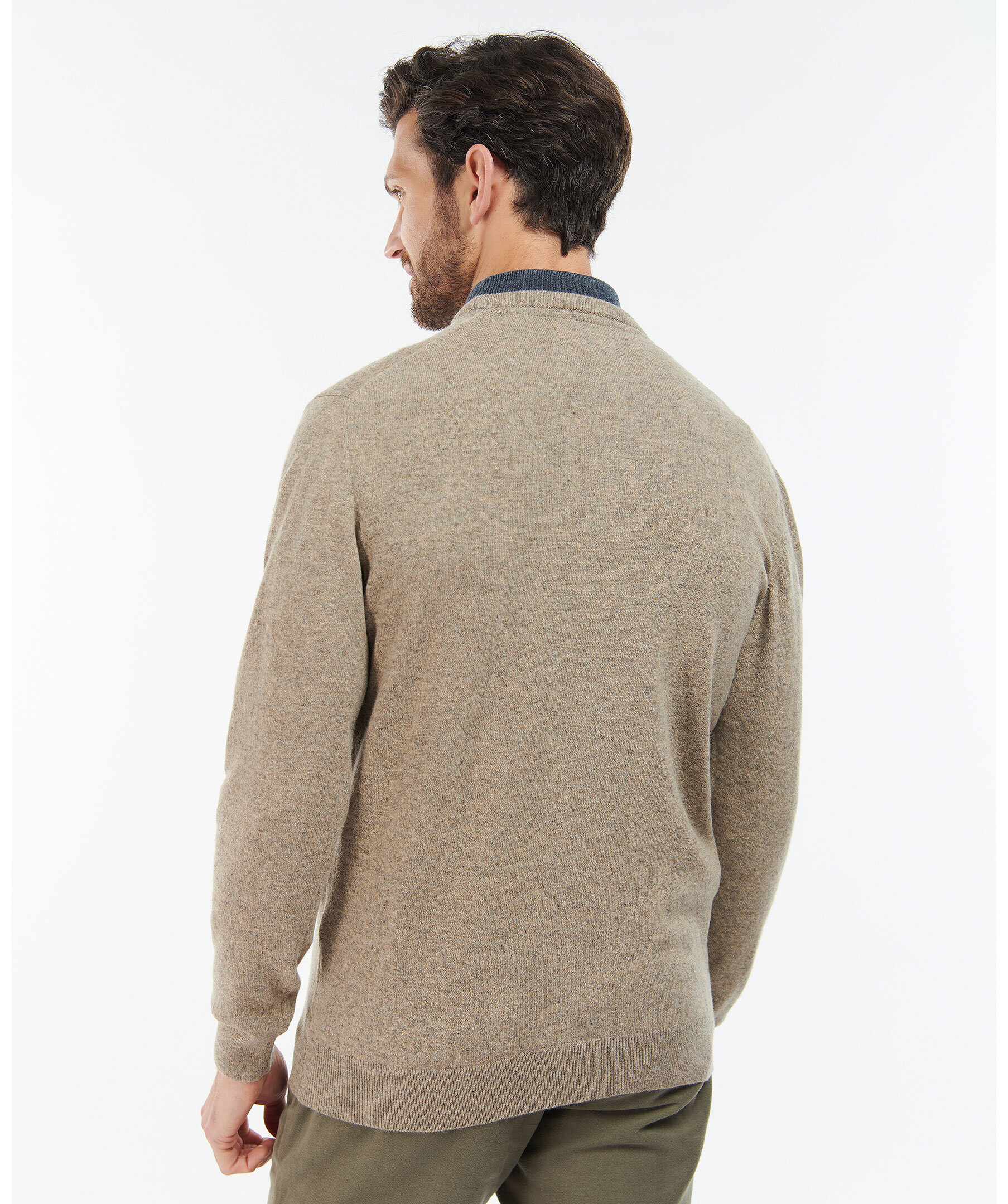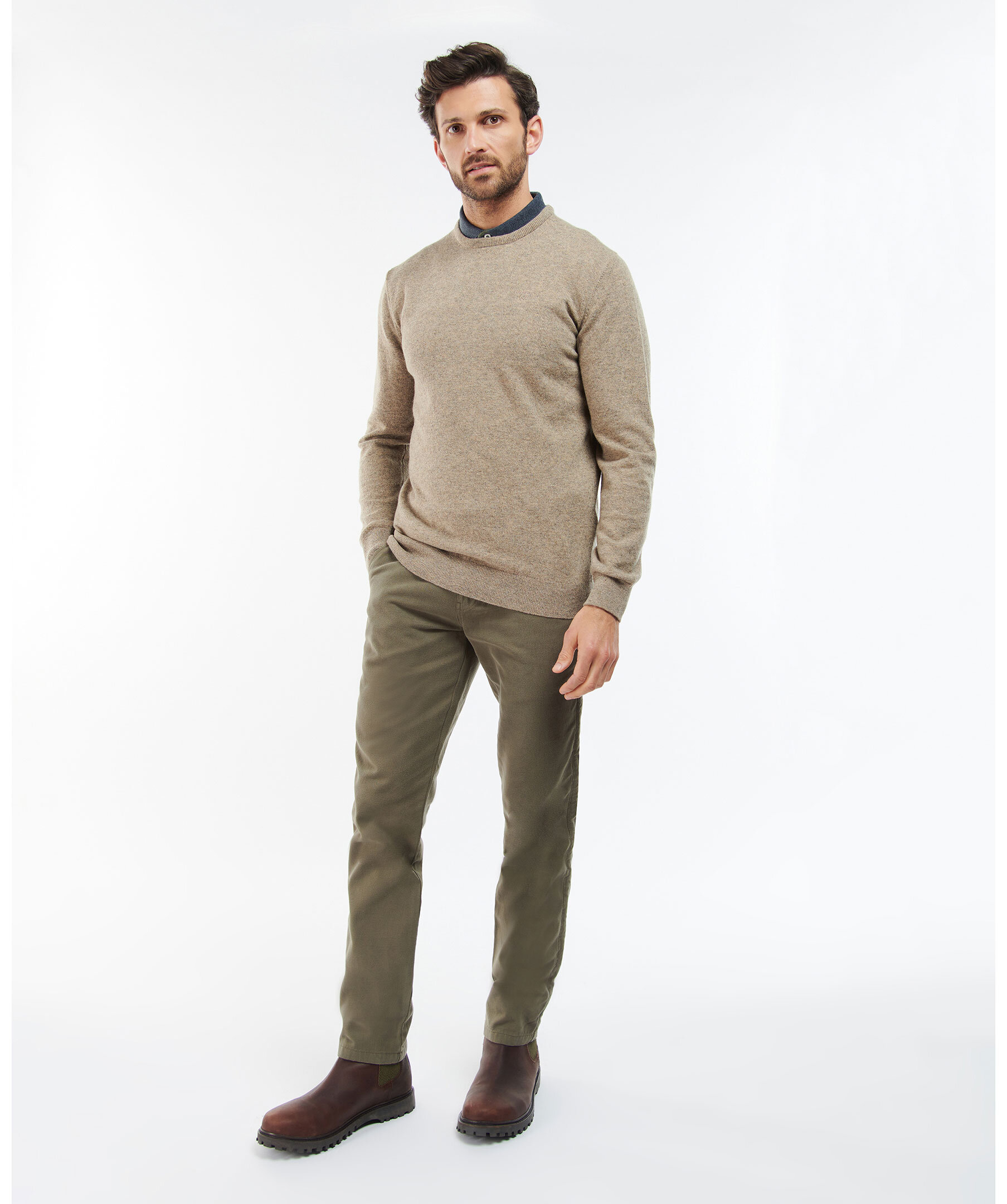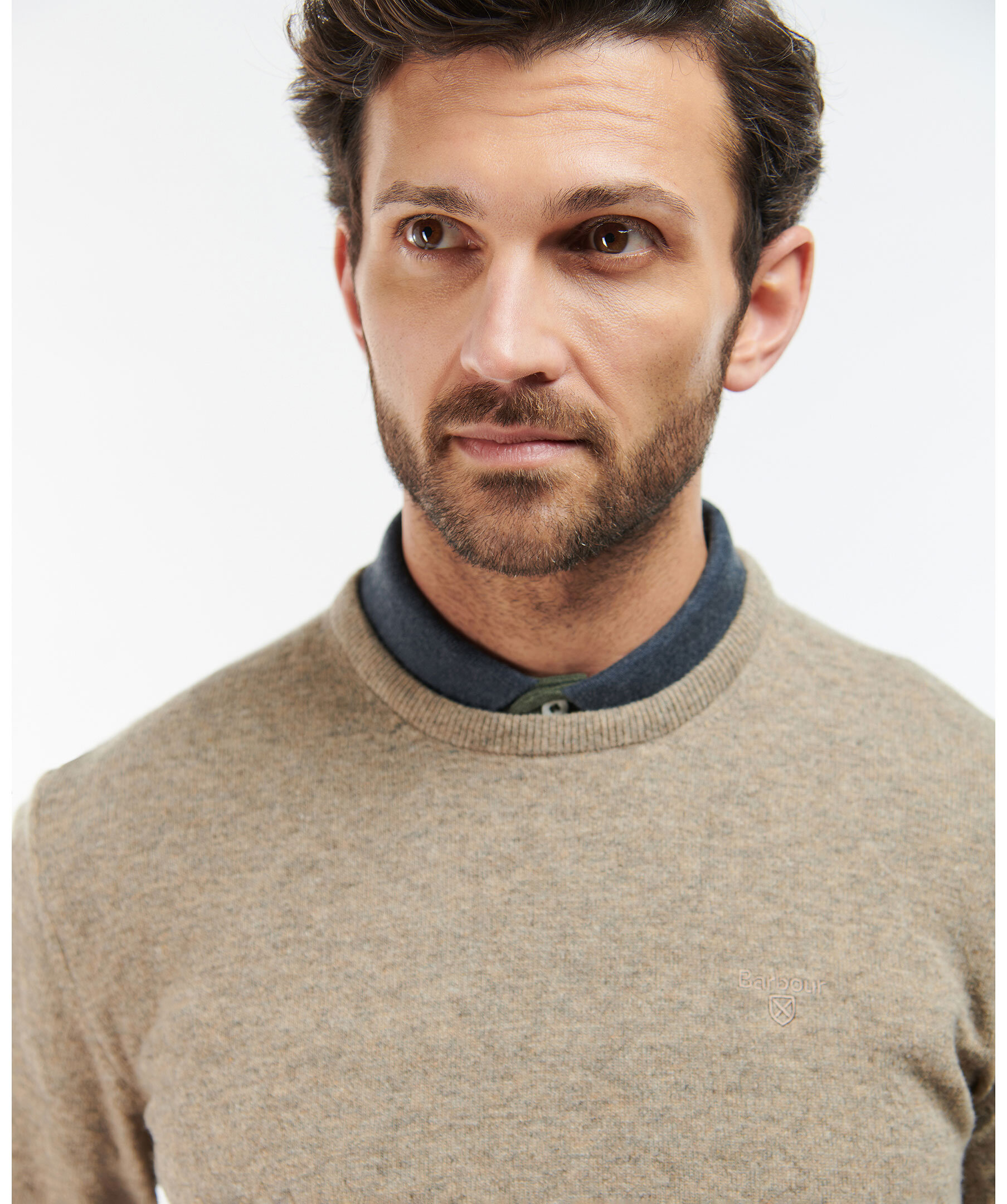 Beige melerad finstickad tröja från Barbour. Rundad halsringning. Ribbstickade muddar vid ärm- och plaggslut. Broderad logotyp på vänster bröst.