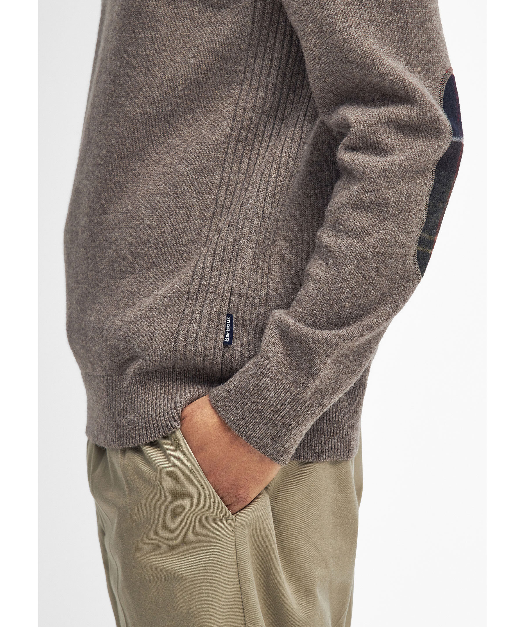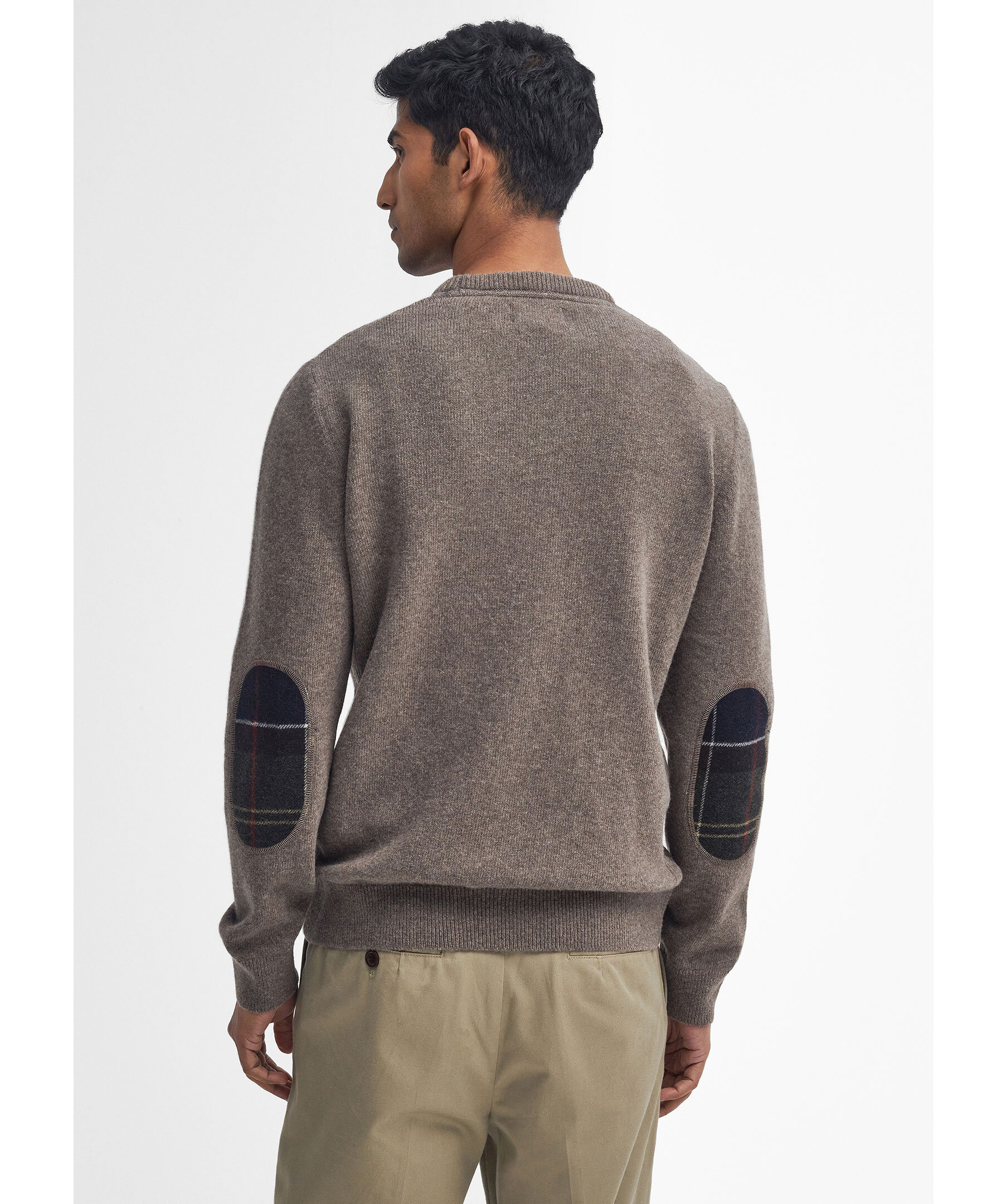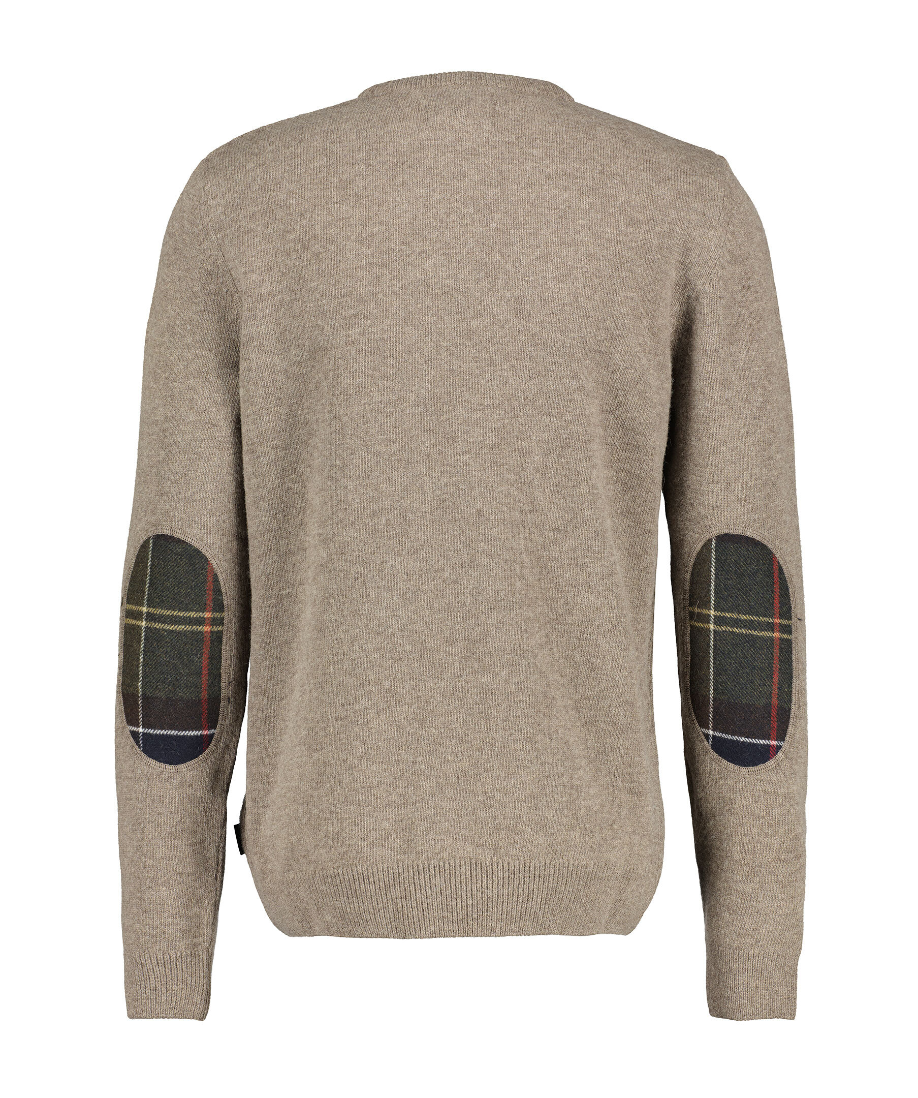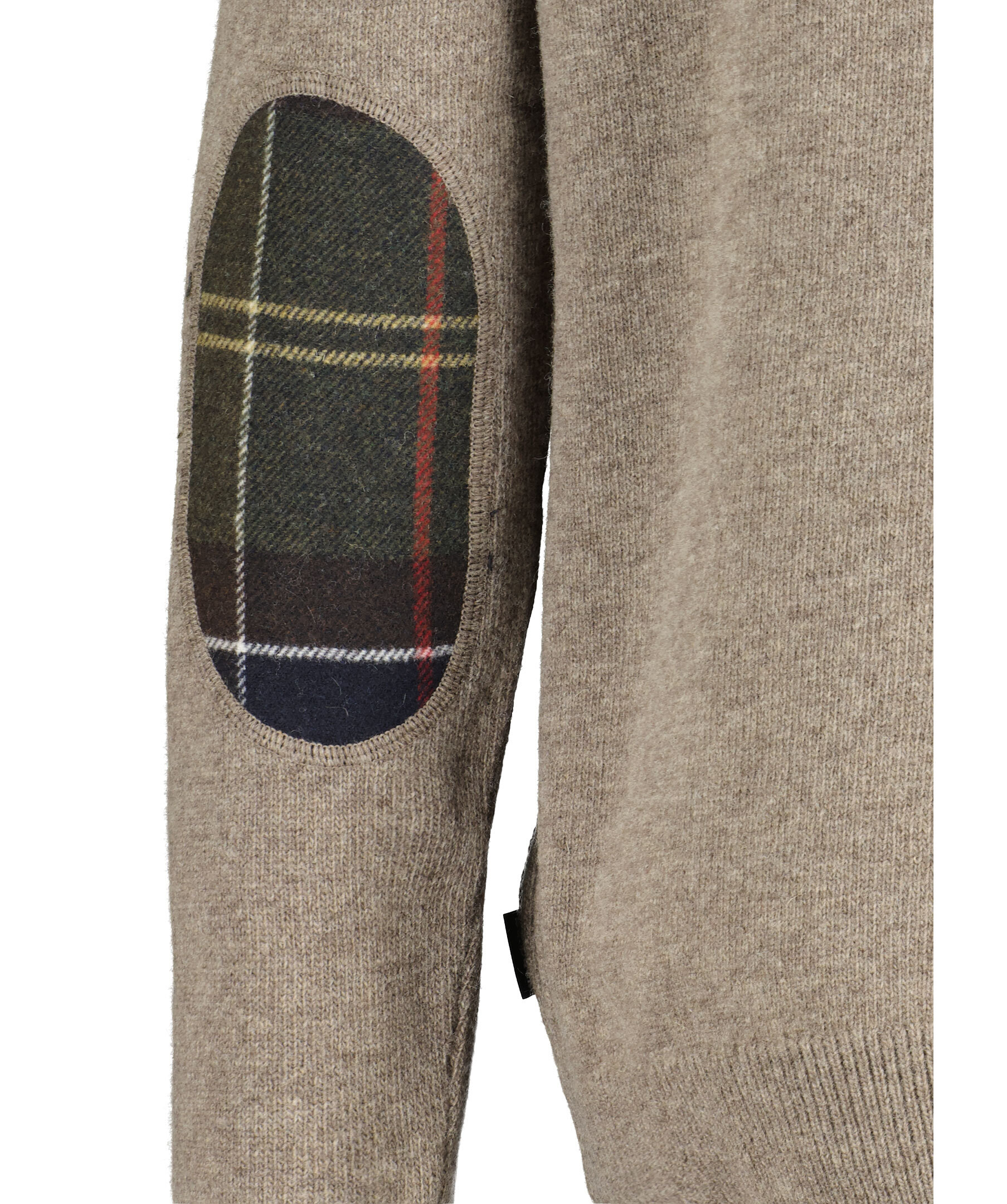 Grönbrun, stickad tröja från Barbour. Tröjan har ribbstickad och rundad halsringning samt ribbstickade muddar vid ärm- och plaggslut. Tygpatch vid armbåge. Tillverkad i en ullblandning.